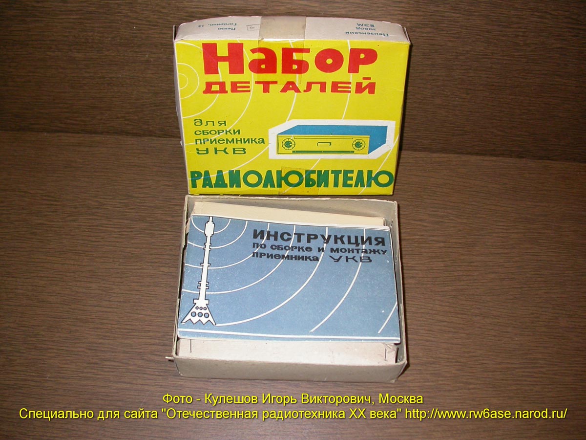 Набор деталей радиолюбителя для сборки приёмника УКВ с 1981 года выпускал Пензенский завод *ВЭМ*. Набор деталей позволяет радиолюбителю средней квалификации собрать действующий УКВ-ЧМ радиоприёмник со следующими параметрами: Диапазон принимаемых приёмником частот не уже 65,8...73 МГц. Реальная чувствительность не менее 30 мкВ. Номинальная выходная мощность 1,5 Вт. Напряжение питания 12 В. Максимальный потребляемый ток до 300 мА. Такой же набор деталей с громкоговорителем Б/У выпускался заводом ещё с 1979 года. Вот его страница на сайте РТ20: http://rw6ase.narod.ru/00/rk1/ukw_rk.html