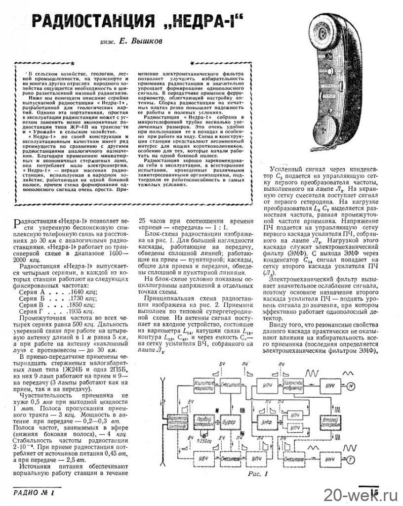 Радиостанция *Недра-1* выпускалась с начала 1960 года Омским приборостроительным заводом имени Козицкого. Портативная ламповая однополосная радиостанция **Недра-1** позволяет вести уверенную безпоисковую симплексную радиосвязь с однотипными станциями на расстоянии до 30 километров с антенной типа **наклонный луч**, со штыревой антенной длиной 1 метр на расстояние до 5 километров. Радиостанция выпускалась с индексами А, Б, В и Г обозначающие фиксированную рабочую частоту. Все четыре частоты расположены в диапазоне от 1600 до 2000 КГц. Чувствительность радиостанции 0,5 мкВ. Мощность РС в антенне на передачу достигает 0,3 Вт. Питается радиостанция от сухой специальной батареи с напряжениями 1, 2, 15, 60 и 120 вольт. Описание и схема Радио №1/1961 ст.15