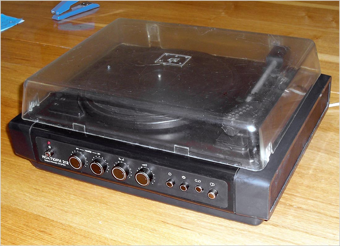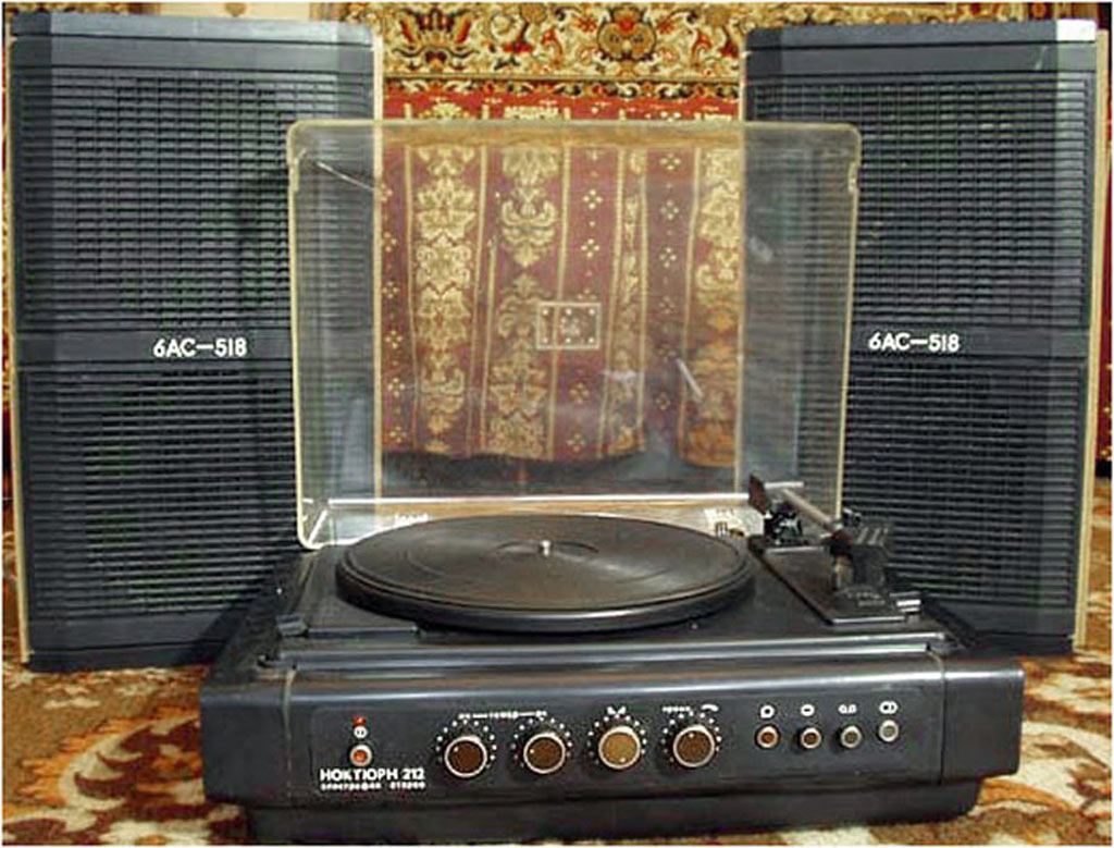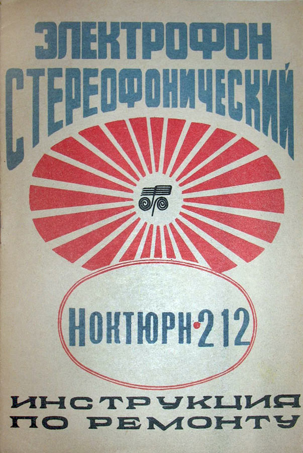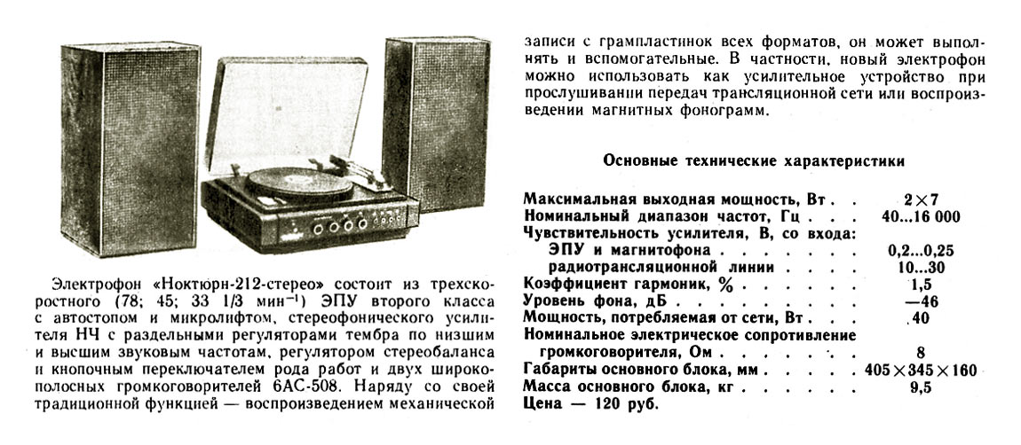 Электрофон сетевой транзисторный *Ноктюрн-212-стерео* с I-кв 1981 года выпускал Грозненский радиотехнический завод. Стереофонический электрофон 2-й группы сложности **Ноктюрн-212 стерео** состоит из 3-х скоростного 78, 45, 33 об/мин ЭПУ с автостопом и микролифтом и УЗЧ с раздельными тембрами по НЧ и ВЧ, регулятором стереобаланса и кнопочным переключателем работ. Усилитель ЗЧ нагружен на две АС типа 6АС-518. Наряду с функцией воспроизведения записи с грампластинок всех форматов электрофон можно было использовать как усилитель внешних сигналов. Максимальная выходная мощность модели 2х7 Вт. Номинальный диапазон частот звука - 40...16000 Гц. Чувствительность усилителя с ЭПУ и магнитофона 0,2...0,25 В, радиотрансляционной линии 10...30 В. Коэффициент гармоник около 1,5 %. Уровень фона -46 дБ. Потребляемая от электрической сети мощность 40 Вт. Сопротивление АС - 8 Ом. Габариты основного блока 405х345х160 мм. Масса сАС - 9 кг.