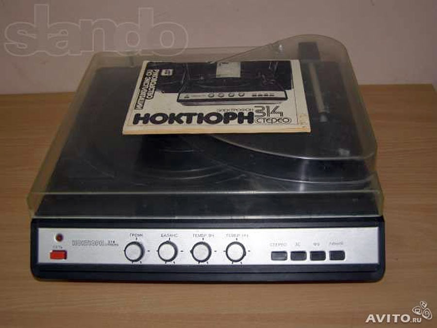 Электрофон сетевой транзисторный *Ноктюрн-314-стерео* с I-кв 1985 года выпускал Грозненский радиотехнический завод. Электрофон предназначен для воспроизведения фонограмм с моно и стереофонических грампластинок любых форматов. Усилители электрофона собраны на транзисторах. В нём использовано двухскоростное электропроигрывающее устройство 2-ЭПУ-62СП с пьезокерамической головкой звукоснимателя типа ГЗКУ-631Р, микролифтом и автостопом при выходе иглы на беговую дорожку грампластинки. В электрофоне имеются раздельные регуляторы тембров по ВЧ и НЧ, светодиодный индикатор сети, электронную защиту УНЧ от КЗ в нагрузке. Номинальная выходная мощность УНЧ 2х3 Вт, диапазон частот звука воспроизводимых АС 60...12500 Гц. В комплекте две АС 6-АС-322. Габариты электрофона 380х370х160 мм, АС 360х250х205 мм. Масса электрофона 8,5 кг, АС - 3,5 кг. Для увеличения ассортимента наименований аппаратов завод практически совместно с 1985 и до начала 1992 года выпускал одинаковые по конструкции, электрической схеме и оформлению электрофоны, такие как: *Школьный-Стерео*, *Школьный ЭФ-301С*, *Синтар ЭФ-302С* и *302С-1*.