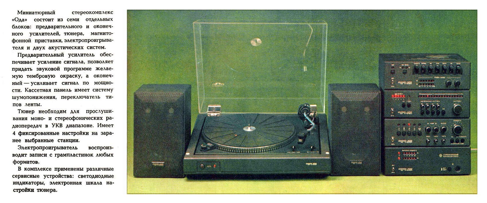 Стереофонический миникомплекс *Ода-101-стерео* разработан в 1983 года а опытно выпускался с 1984 года Муромским заводом РИП. CК состоит из 4 блоков: тюнера, магнитофона, УКУ, блока УМ, блока ЭП **Орфей-101-С** и 2 АС. Обеспечивает: приём в ЧМ стереофонического вещания; воспроизведение моно и стереофонической грамзаписи; запись и воспроизведение моно и стереофонических программ звука на магнитную ленту А4206-3Б или А4212-3В; прослушивание программ через АС и стереотелефоны; воспроизведение программ с внешних источников. Блоки комплекса имеют вспомогательные устройства: блок тюнера: четыре фиксированные настройки на выбранные станции; электронную шкалу настройки; электронную индикацию точной настройки; индикацию наличия стереопередачи; АПЧ; БШН; магнитофон: СШ с индикацией включения; индикацию режимов; индикатор расхода ленты; индикатор для контроля уровня записи; переключатель типа магнитной ленты с индикацией; блок УКУ: электронную коммутацию входов пяти источников; индикацию коммутации входов; корректировку АЧХ по верхним, средним и нижним частотам; ступенчатое ослабление на 10 дБ громкости, верхних и нижних частот; блок ОУ: индикатор номинальной и максимальной мощности; электронную защиту от КЗ; электронную защиту АС при выходе из строя усилителя мощности.
