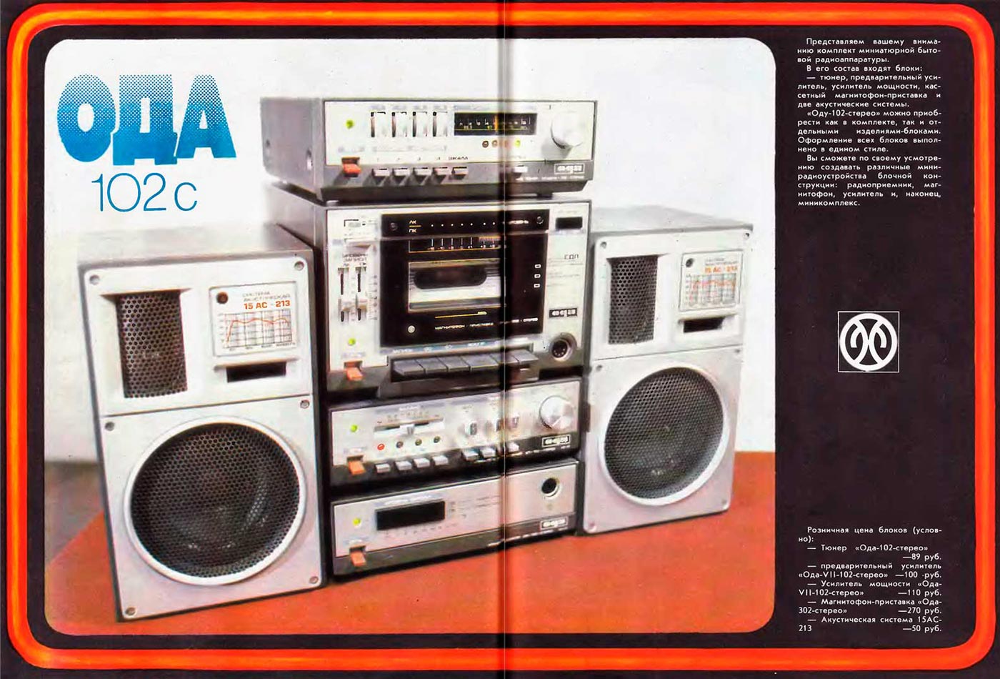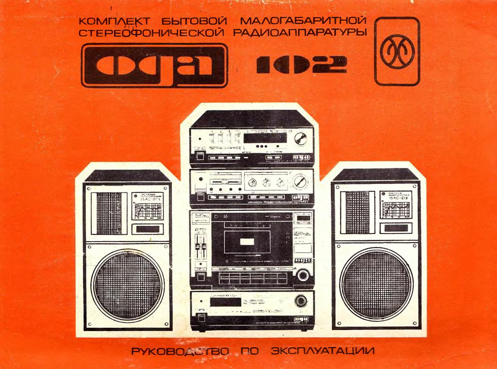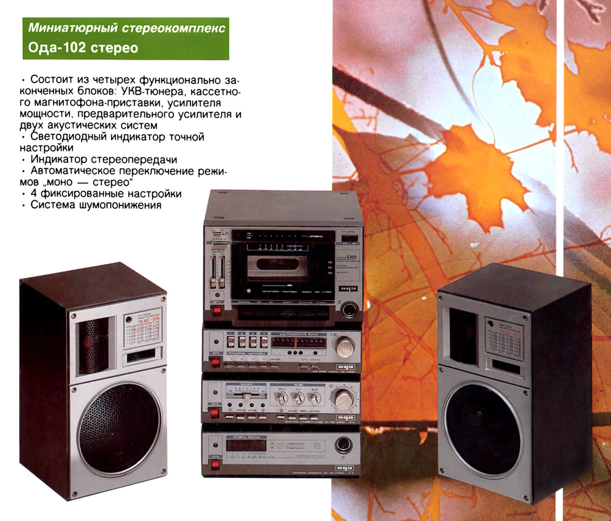 Стереофонический радиокомплекс *Ода-102-стерео* с 1986 года выпускал Муромский завод РИП. Комплекс обеспечивает приём моно и стереопередач в диапазоне УКВ, запись моно и стереофонических программ, с последующим воспроизведением. Комплекс состоит из 5-ти функционально законченных блоков; УКВ тюнера **Ода-102С**, кассетного магнитофона-приставки **Ода-302С**, усилителя мощности **Ода УМ-102С**, предварительного усилителя **Ода УП-102С** и 2-х акустических систем **15АС-213**. Комплекс имеет четыре фиксированные настройки; автоматическую подстройку частоты и бесшумную настройку; светодиодные индикаторы точной настройки и приёма стереопрограмм; автоматическое переключение режимов **моно-стерео**; систему ШП; переключатель типов ленты со световой индикацией; счётчик расхода ленты; автостоп при окончании ленты в кассете или неисправности кассеты; 3-х полосный регулятор тембра, отключаемую тонкомпенсацию; ступенчатое ослабление громкости; светодиодную индикацию перегрузок; электронную защиту от КЗ. Предусмотрена возможность подключения внешних сигналов. Выходная мощность (4 Ома): номинальная 2х10 Вт, максимальная 2х25 Вт. Входное сопротивление акустической системы 4 Ом. Напряжение питания 220 В. Потребляемая мощность тюнера 4,5 Вт, магнитофона-приставки 7 Вт, усилителя мощности 34...100 Вт, усилителя предварительного 10 Вт. Габариты одного блока: тюнера, УМ и УП - 223х245х75 мм, магнитофона-приставки 220х144х247 мм, одной акустической системы 160х178х265 мм. Масса тюнера 2,2 кг, магнитофона-приставки 3,5 кг, УМ 3,6 кг, УП 2 кг, одной АС 5,5 кг. Типы магнитной ленты А4206-3; А4212-3Б. Скорость магнитной ленты 4,76 см/с. Чувствительность тюнера в диапазоне УКВ-ЧМ 4 мкВ. Диапазон рабочих частот тракта ЧМ 31,5...15000 Гц, магнитной записи с применением ленты типа А4206-3 40...12500 Гц, А4212-3Б 40...14000 Гц, усилительно-акустического устройства 20...20000 Гц. Коэффициент детонации ±0,2%. Коэффициент НЛИ тракта приёма 2%, тракта ЗЧ в диапазоне 20...20000 Гц 0,3%, на ЛВ МП 4%.