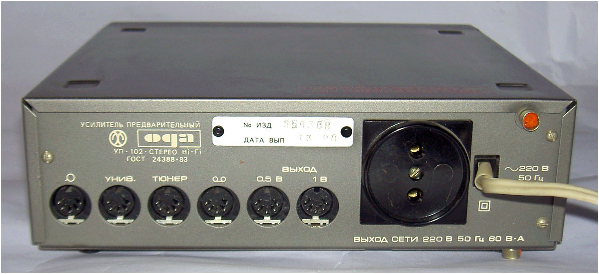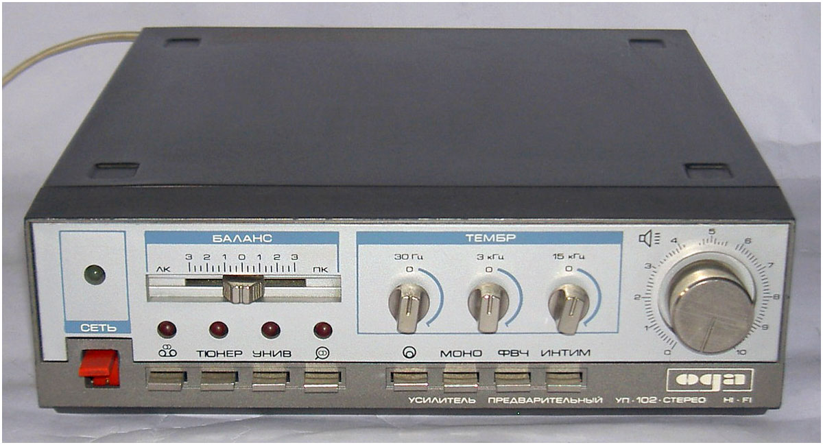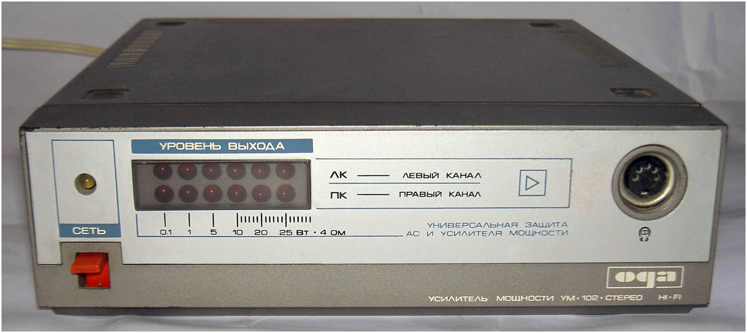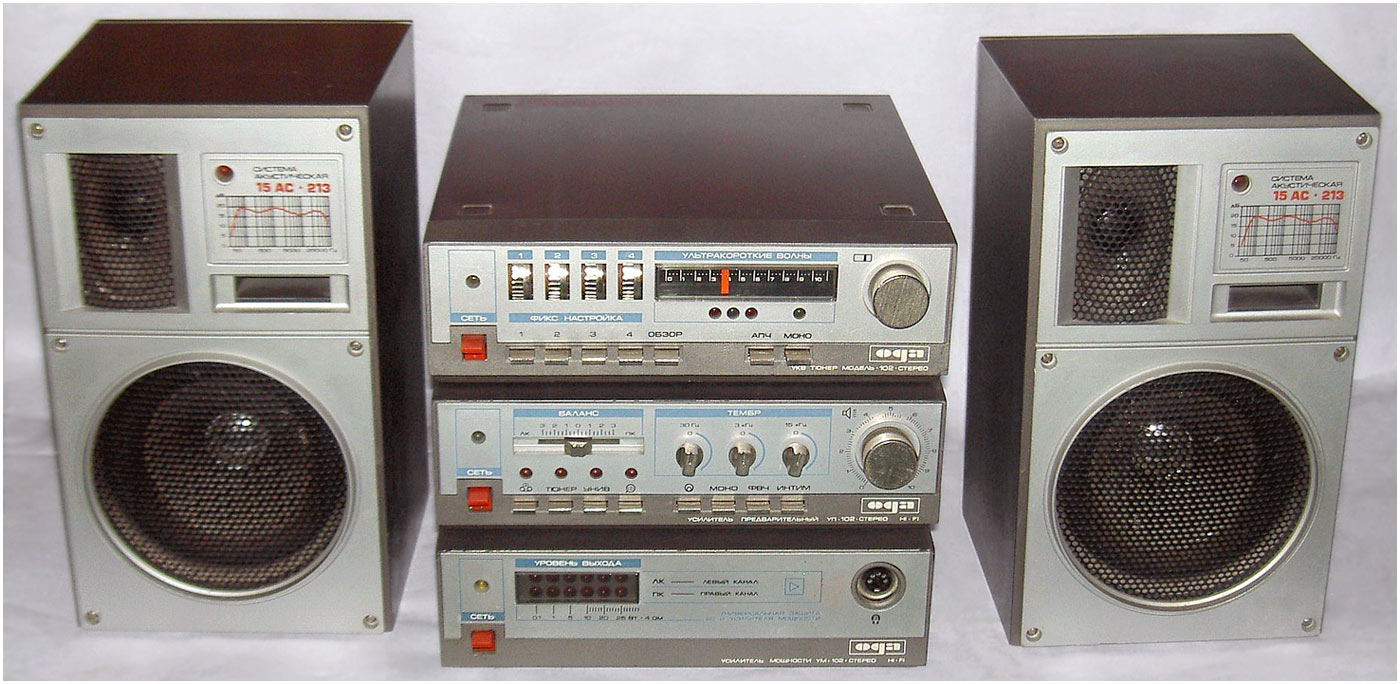 Стереофонический радиокомплекс *Ода-102-стерео* с 1986 года выпускал Муромский завод РИП. Комплекс обеспечивает приём моно и стереопередач в диапазоне УКВ, запись моно и стереофонических программ, с последующим воспроизведением. Комплекс состоит из 5-ти функционально законченных блоков; УКВ тюнера **Ода-102С**, кассетного магнитофона-приставки **Ода-302С**, усилителя мощности **Ода УМ-102С**, предварительного усилителя **Ода УП-102С** и 2-х акустических систем **15АС-213**. Комплекс имеет четыре фиксированные настройки; автоматическую подстройку частоты и бесшумную настройку; светодиодные индикаторы точной настройки и приёма стереопрограмм; автоматическое переключение режимов **моно-стерео**; систему ШП; переключатель типов ленты со световой индикацией; счётчик расхода ленты; автостоп при окончании ленты в кассете или неисправности кассеты; 3-х полосный регулятор тембра, отключаемую тонкомпенсацию; ступенчатое ослабление громкости; светодиодную индикацию перегрузок; электронную защиту от КЗ. Предусмотрена возможность подключения внешних сигналов. Выходная мощность (4 Ома): номинальная 2х10 Вт, максимальная 2х25 Вт. Входное сопротивление акустической системы 4 Ом. Напряжение питания 220 В. Потребляемая мощность тюнера 4,5 Вт, магнитофона-приставки 7 Вт, усилителя мощности 34...100 Вт, усилителя предварительного 10 Вт. Габариты одного блока: тюнера, УМ и УП - 223х245х75 мм, магнитофона-приставки 220х144х247 мм, одной акустической системы 160х178х265 мм. Масса тюнера 2,2 кг, магнитофона-приставки 3,5 кг, УМ 3,6 кг, УП 2 кг, одной АС 5,5 кг. Типы магнитной ленты А4206-3; А4212-3Б. Скорость магнитной ленты 4,76 см/с. Чувствительность тюнера в диапазоне УКВ-ЧМ 4 мкВ. Диапазон рабочих частот тракта ЧМ 31,5...15000 Гц, магнитной записи с применением ленты типа А4206-3 40...12500 Гц, А4212-3Б 40...14000 Гц, усилительно-акустического устройства 20...20000 Гц. Коэффициент детонации ±0,2%. Коэффициент НЛИ тракта приёма 2%, тракта ЗЧ в диапазоне 20...20000 Гц 0,3%, на ЛВ МП 4%.