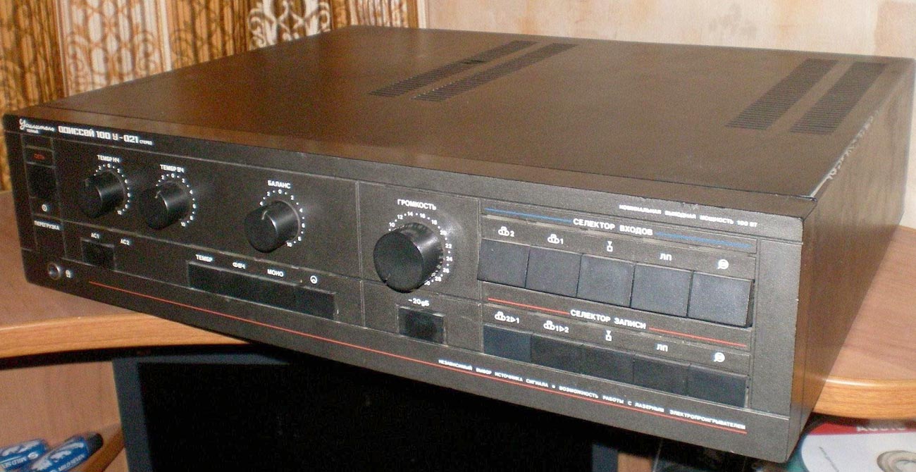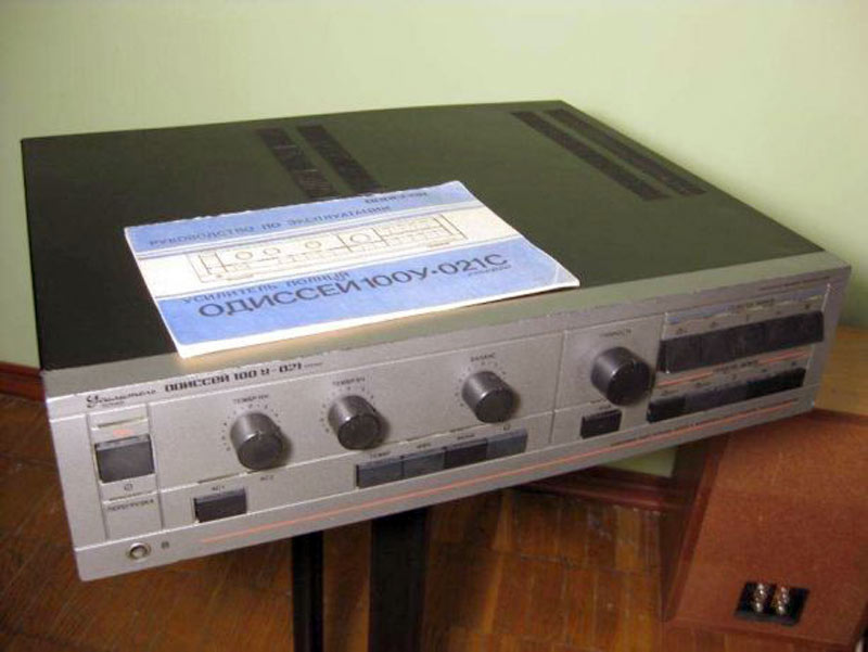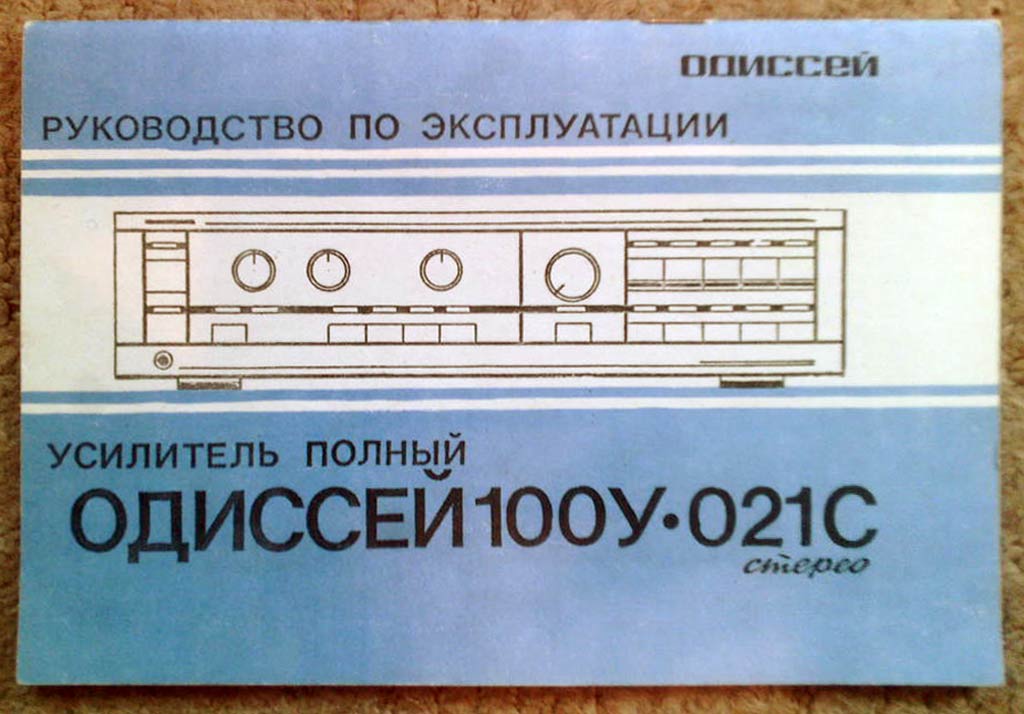 Усилитель звуковой частоты полный *Одиссей 100У-021-стерео* выпускался с 1992 года Киевским заводом *Радиоприбор* ПО имени С.П.Королёва. Предназначен для двухканального усиления сигналов звуковой частоты от электропроигрывателя, тюнера, магнитофона, лазерного проигрывателя и другой бытовой радиоэлектронной аппаратуры. Состоит из четырех функциональных блоков: Предварительный усилитель; Усилитель мощности; Блок питания; Коммутационное устройства. Усилитель обеспечивает регулирование громкости, тембра, баланса, тонкомпенсации, микширования, переключения моно-стерео, перезапись с магнитофона на магнитофон, запись с лазерного проигрывателя. Имеется возможность подключить к усилителю одновременно все виды радиоэлектронной аппаратуры. В усилителе предусмотрена защита выходов от короткого замыкания в нагрузке, защита АС от постоянного напряжения на выходе, их отключение при неисправности и перегреве. Технические характеристики: Диапазон частот - 10...40000 Гц. Номинальная выходная номинальная мощность - 2х100 Вт, при сопротивлении АС - 8 Ом. Общие гармонические искажения - 0,007 %. Отношение сигнал/шум - 95 дБ. Потребляемая мощность - 450 Вт. Габаритные размеры усилителя - 430х375х110мм. Масса - 14 кг.