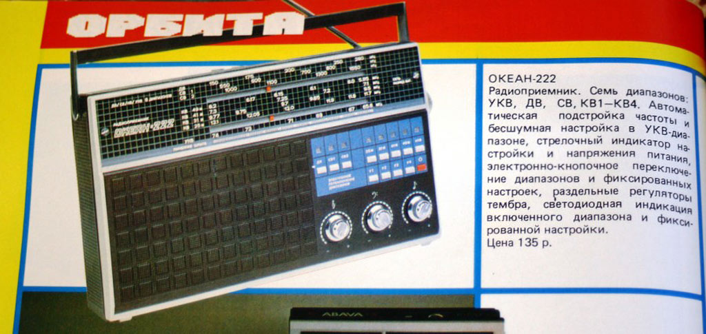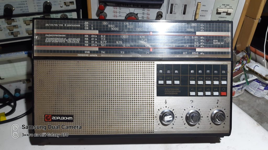 Портативный радиоприёмник *Океан РП-222* с 1987 года выпускал Гродненский завод *Радиоприбор*. **Океан РП-222** - радиоприёмник 2 группы сложности, предназначенный для приёма программ радиовещательных станций в диапазонах: ДВ, СВ (2 поддиапазона), КВ (4 поддиапазона) и в диапазоне УКВ-ЧМ. Радиоприёмник имеет электронные настройку и переключение диапазонов, четыре фиксированные настройки в УКВ-ЧМ диапазоне. Питание универсальное: от 6 элементов 343, общим напряжением 9 В, бортовой сети автомобиля или от сети переменного тока 220 В. Габариты радиоприёмника 318 х 192 х 78 мм. Масса без источников питания 2,4 кг, Цена 135 рублей. Радиоприёмник разработан ещё в 1985 году по прежним требованиям ГОСТа, поэтому наименование модели на передней панели указано без буквенного сочетания РП и обозначено как *Океан-222*. На задней крышке радиоприёмника сочетание РП было добавлено мелким шрифтом уже перед самым выпуском радиоприёмника.