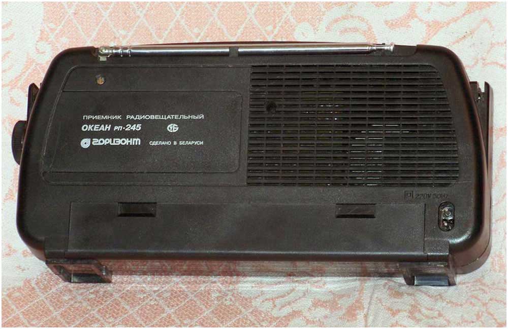 Портативный радиоприёмник *Океан РП-245* с 1999 года выпускало ОАО *Горизонт*. Приёмник осуществляет приём в диапазонах: ДВ, СВ, КВ (4 поддиапазона) и УКВ-ЧМ и FM диапазонах. Питание осуществляется от сети переменного тока или от 4-х элементов А-343. Диапазоны ДВ, СВ, КВ-1 5,95...6,2, КВ-2 7,1...7,3, КВ-3 9,5...9,77, КВ-4 11,7...12,1, УКВ-1 65,8...74, УКВ-2 87,5...108 МГц. Чувствительность в ДВ 2, СВ 1 мВ/м, КВ 200 мкВ, УКВ-1,2 70 мкВ. Селективность в АМ диапазонах 30 дБ. Максимальная выходная мощность при питании от батарей 0,25 Вт, от сети 0,35 Вт. Диапазон воспроизводимых частот тракта АМ 250...3500, ЧМ 250...8000 Гц. В приёмнике имеется тембр ВЧ, индикатор настройки, подсветка шкалы, гнездо для телефона. Габариты приёмника 290х143х75 мм, масса 1,2 кг.