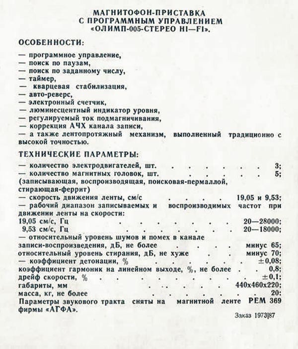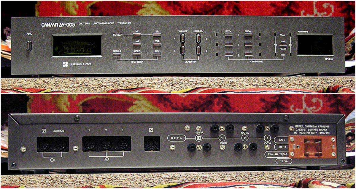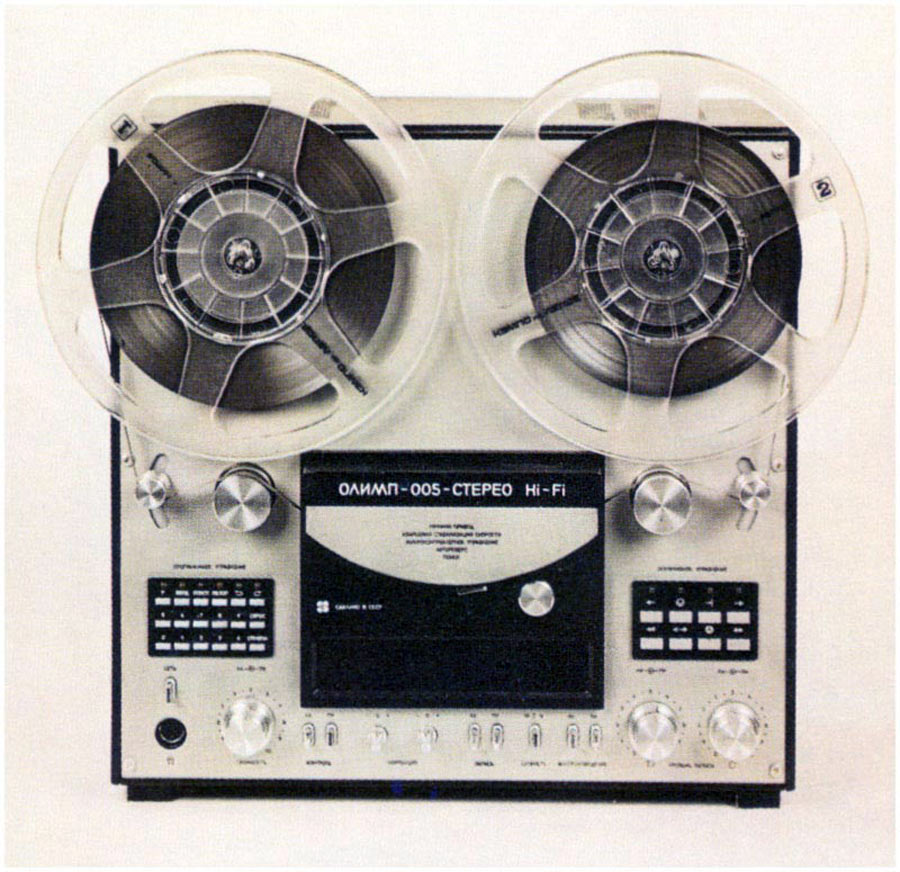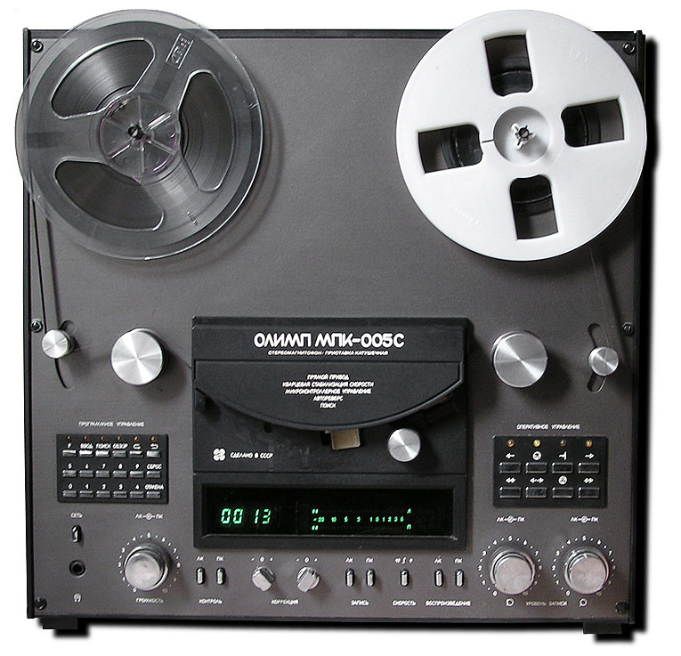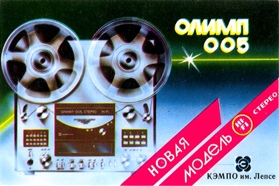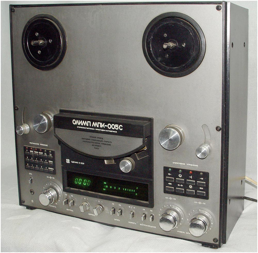 Стереофонический катушечный магнитофон-приставка *Олимп-005-стерео* с 1986 года выпускало Кировское электромашиностроительное ПО имени Лепсе. Стационарный катушечный МП высшего класса со сквозным трактом записи и воспроизведения предназначен для работы в составе радиокомплекса. Имеет микроконтроллерное программное управление, кварцевую систему стабилизации скорости движения магнитной ленты, автокоррекцию АЧХ канала записи, электронную коммутацию по всем входам, регулировку тока подмагничивания. В модели имеется полный автореверс, возможность поиска нужного фрагмента фонограммы по паузам (в режиме обзор и память), включение магнитофона в заранее установленное время (режим таймер), люминесцентную индикацию уровня записи, электронный счетчик ленты. Скорость протяжки ленты 19,05 и 9,53 см/с; рабочий диапазон частот на большей скорости 20...25000 Гц, меньшей 20...18000 Гц; коэффициент детонации соответственно 0,08% и 0,15%; коэффициент гармоник на скорости 19,05 см/с 1,5%; соотношение сигнал/шум на скорости 19,05 см/с -60, 9,53 см/с -56 дБ, потребляемая от сети мощность 100 Вт; габариты аппарата 460х450х220 мм; его масса 20 кг. Первая цена 1230 рублей. С 1987 года МП именовался как *Олимп МПК-005С*. С осени 1990 года завод выпускал магнитофон-пристаку *Олимп МПК-005С-1*, в котором были устранены недостатки предыдущих моделей. Для МП выпускалась система ДУ *Олимп ДУ-005*, первоначальное наименование *Олимп-5*.