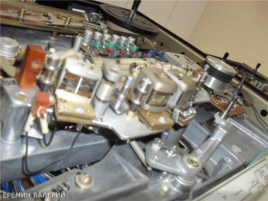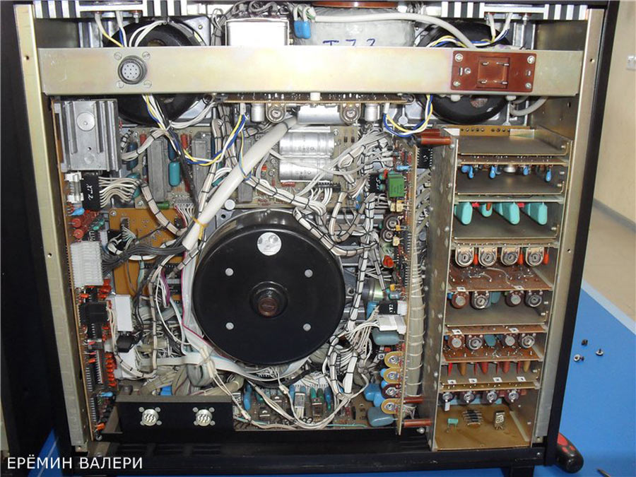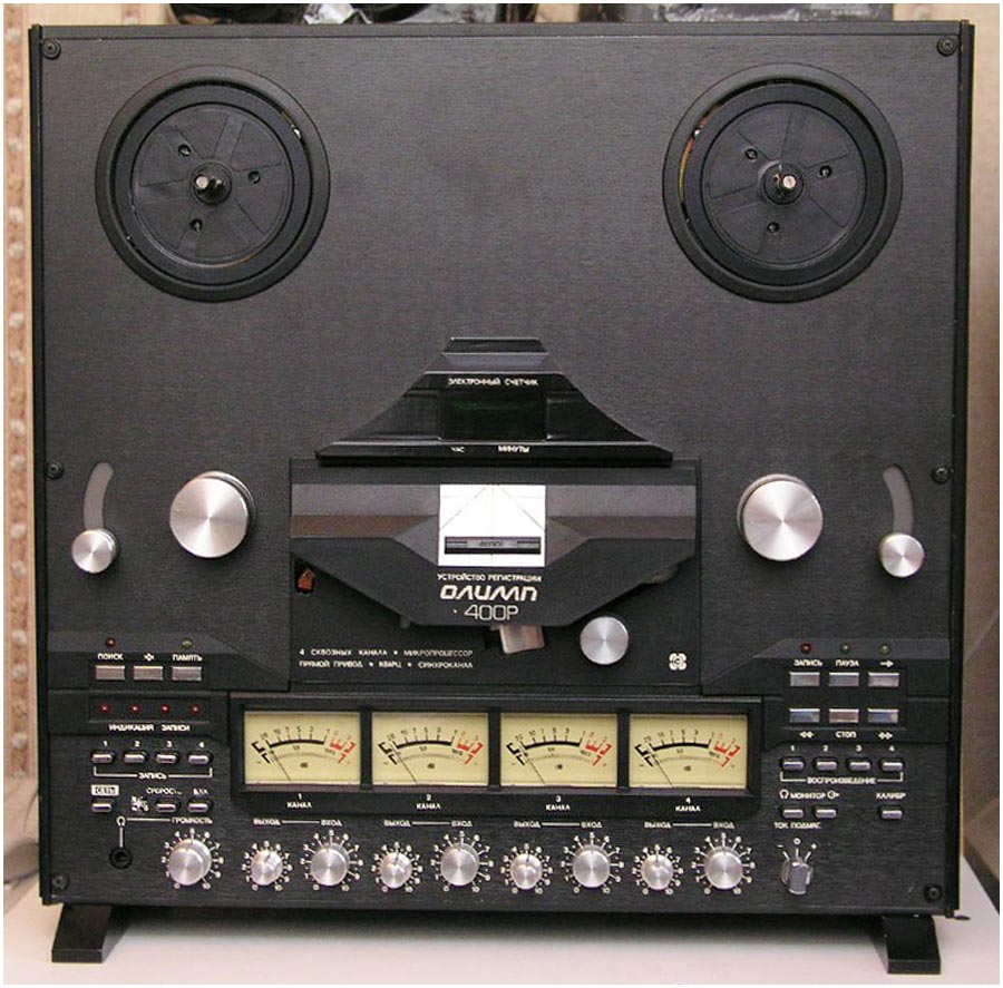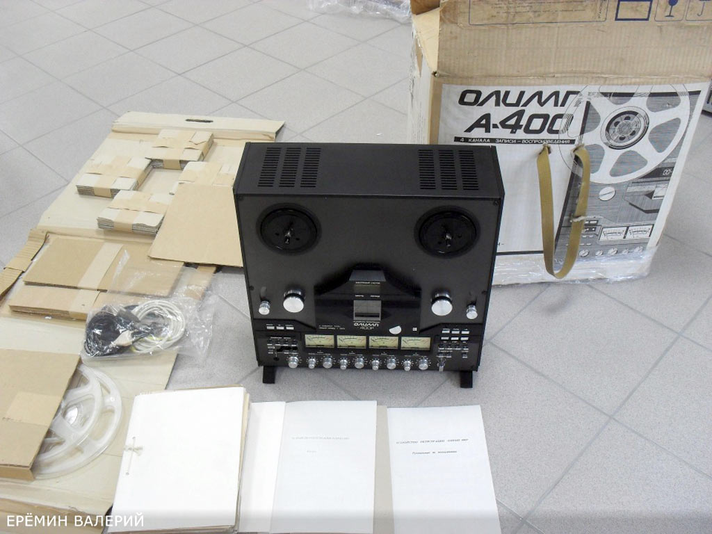 Катушечный магнитофон-приставка *Олимп А-400* с 1994 года выпускало Кировское электромашиностроительное ПО им. Лепсе. Профессиональный 4-х канальный МП предназначен для высококачественной записи фонограмм в радио и телестудиях, театрах, домах культуры, в студиях звукозаписи. С его помощью можно вести запись информации в научно-исследовательских заведениях. МП позволяет вести запись по четырём каналам на стандартной магнитной ленте шириной 6,3 мм. МП имеет электронное управление режимами работы, прямой привод, кварцевую стабилизацию скорости движения ленты, индикацию режимов работы, уровней записи и воспроизведения по каждому каналу, режим редактирования, возможность подключения системы беспроводного дистанционного управления, электронный счётчик расхода ленты, автостоп и др. Скорость движения магнитной ленты 38,1 см/с; среднее отклонение от номинальной скорости ±0,5%; взвешенное значение детонации не более ± 0,06%; эффективный диапазон рабочих частот - 31,5...22.000 Гц; полное взвешенное отношение сигнал/шум не хуже 62 дБ; уровень стирания записи не хуже 70 дБ; коэффициент третьей гармоники на частоте 1000 Гц - 1,2%; мощность, потребляемая от сети не более 120 Вт габариты аппарата 470x480x220 мм; масса 28 кг. На базе модели выпускали и устройство регистрации **Олимп-400Р**, отличающееся 2-мя скоростями и некоторыми изменениями в конструкции и схеме, их можно посмотреть с 4-й фотографии.