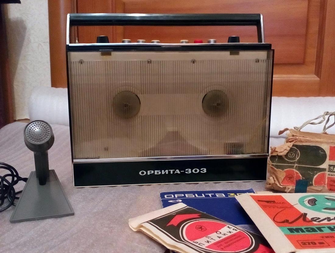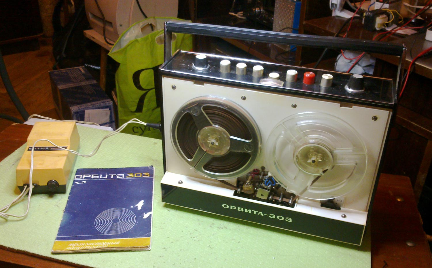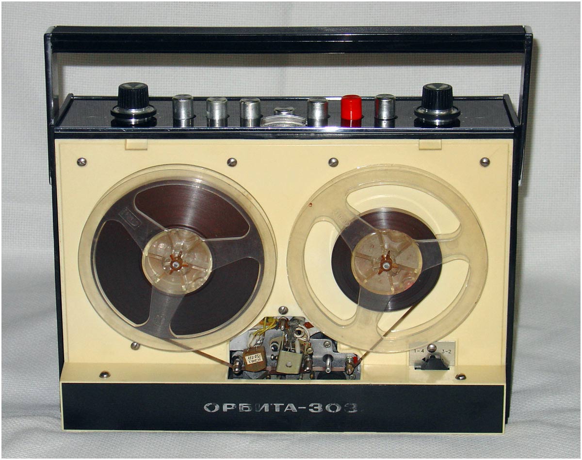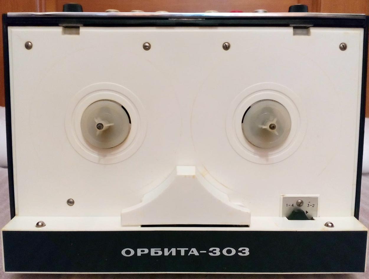 Портативный катушечный магнитофон *Орбита-303* с 1973 года выпускал Ленинградский завод *Пирометр*. Переносный четырехдорожечный катушечный магнитофон **Орбита-303** предназначен для записи фонограмм от микрофона, звукоснимателя приёмника, телевизора, радиолинии и их воспроизведение. В магнитофоне имеется возможность совместной работы с кино и диапроекторами. ЛПМ построен по двухмоторной кинематической схеме. Скорость протяжки ленты 9,5 см/сек. Время непрерывной записи при использовании катушек № 13 с магнитной лентой типа 10 - 4х45 мин. Номинальная выходная мощность 0,5 Вт. Полоса рабочих частот 63...10000 гц. Применён громкоговоритель 1ГД-28 или 1ГД-40. Питается магнитофон от 8 элементов 373 или электрической сети через приставку-выпрямитель БП-12/5. Размеры магнитофона - 310х210х105 мм, его масса 5 кг. Первые выпуски магнитофонов именовались как **Орбита-3**.