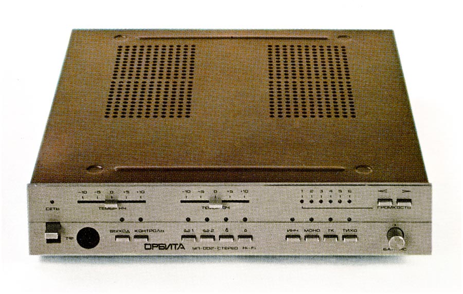 Усилитель предварительный **Орбита УП-002-стерео** и усилитель мощности *Орбита УМ-002-стерео* с 1985 года выпускал Ростовский завод *Электроаппарат*. Усилители входили в состав комплекса *Орбита-002-стерео*. УП предназначен для усиления стереофонического сигнала от звукоснимателя, электропроигрывателя, линейного выхода магнитофона, тюнера. Имеющееся коммутационное устройство позволяет подключить к усилителю два магнитофона для записи и перезаписи усиливаемых сигналов. Предусмотрена дискретная электронная регулировка громкости, оперативное уменьшение ее уровня, включение тонкомпенсации, регулировка тембра НЧ и ВЧ, световая индикация режимов работы, прослушивание фонограмм через стереотелефоны. УП может работать с активными АС и с УМ. Основные параметры: Диапазон усиливаемых частот при неравномерности АЧХ ±1 дБ - 20...20000 Гц. Номинальное выходное напряжение 1 В. Коэффициент гармоник 0,02%. Отношение сигнал, шум - 90 дБ. Потребляемая мощность 40 Вт. Габариты 320х320х60 мм. Масса 5 кг. Цена 520 рублей.