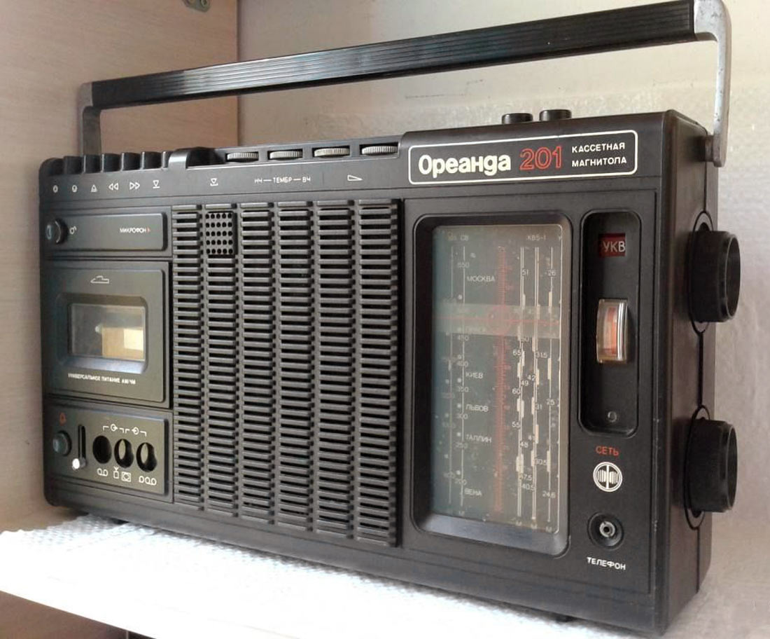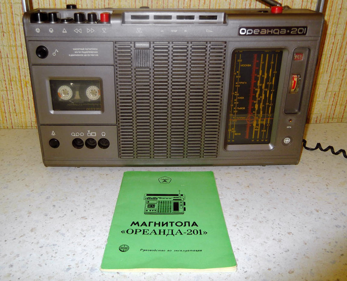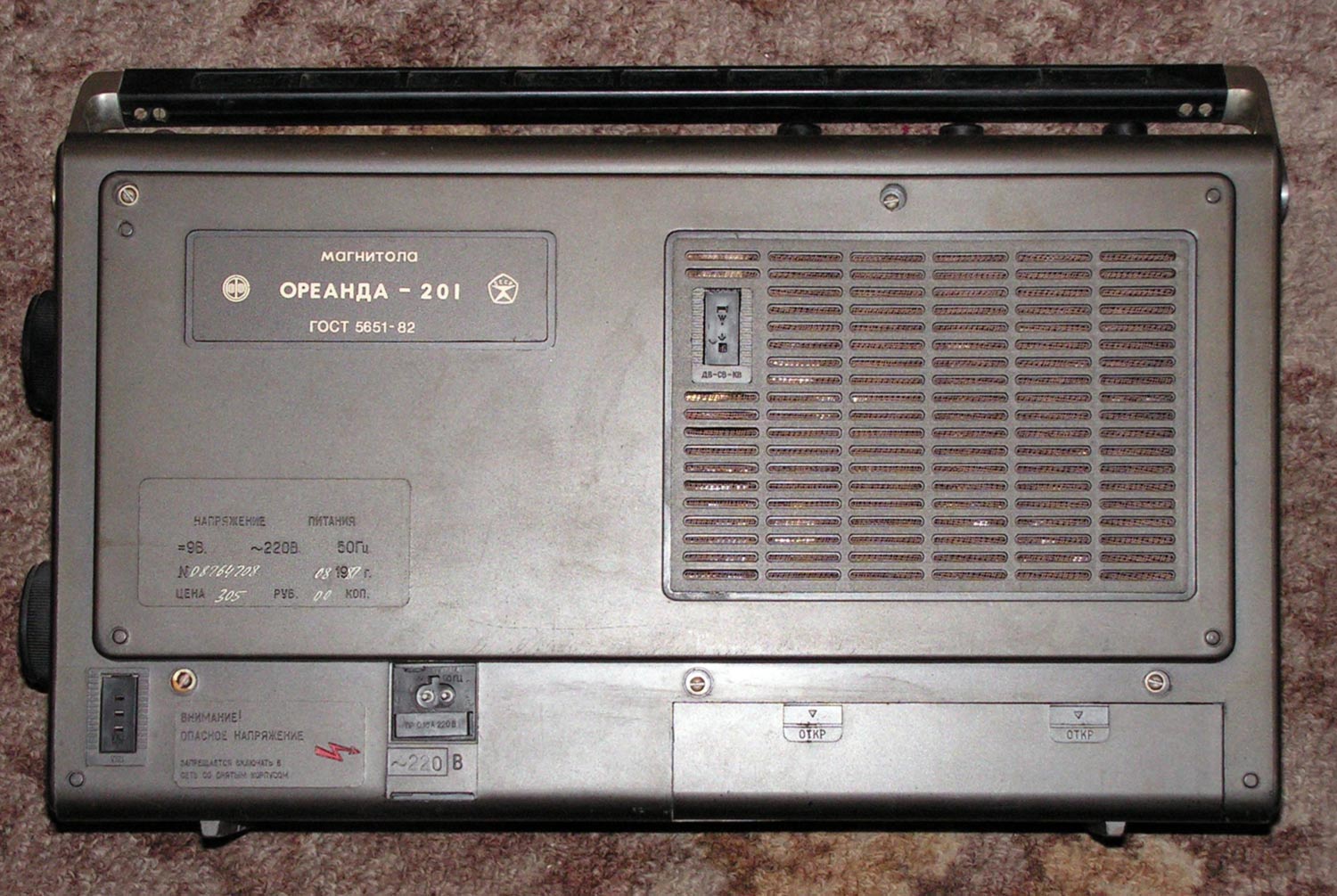 Кассетная магнитола *Ореанда-201* с 1980 года выпускалась Симферопольским заводом *Фиолент*. **Ореанда-201** - магнитола 2 класса, состоящая из радиоприёмника 2-го класса и магнитофонной панели 3-го класса. Она предназначена для приёма программ радиостанций в диапазонах ДВ, СВ, KB и УКВ, а так же для магнитной записи на кассеты МК фонограмм со встроенного и выносного микрофонов, собственного и внешнего радиоприёмников, звукоснимателя и магнитофона с последующим воспроизведением. Приём в диапазонах ДВ и СВ осуществляется на магнитную антенну, а в KB и УКВ на телескопическую. Чувствительность в диапазонах ДВ 350, СВ 150, KB 50, УКВ 8 мкВ. Селективность 40 дБ. Избирательность по зеркальному каналу в диапазонах ДВ, СВ - 46, KB - 26 дБ. Номинальная выходная мощность 500 мВт, максимальная 750 мВт. Полоса воспроизводимых звуковых частот в тракте АМ 125...4000, ЧМ 125...10000 Гц. Среднее звуковое давление в полосе воспроизводимых частот - 0,31 Па. Напряжение на линейном выходе магнитофона 250 мВ. Диапазон частот на ЛВ 80...10000 Гц. Питание 7 элементов 343 или сеть. Габариты МЛ 450х245x118 мм. Вес с батареями 5,2 кг.
