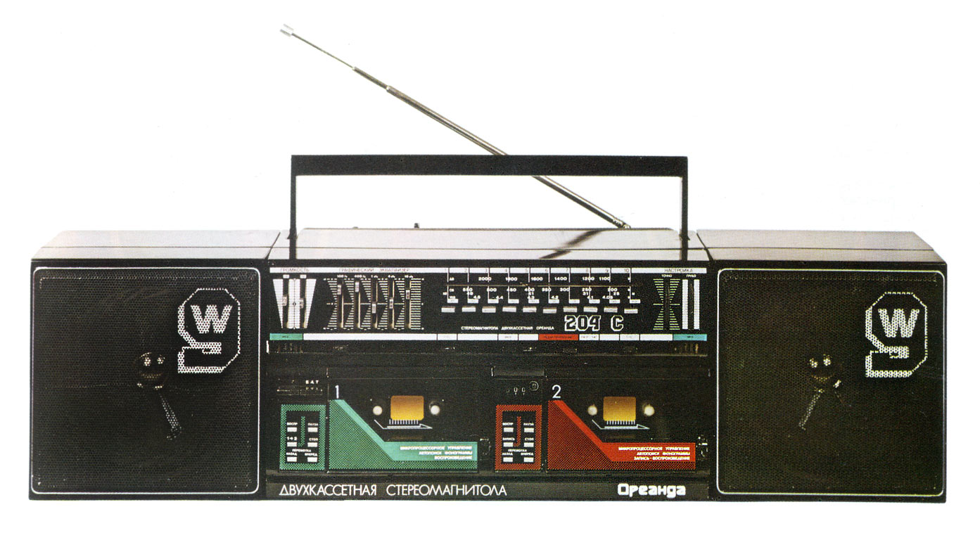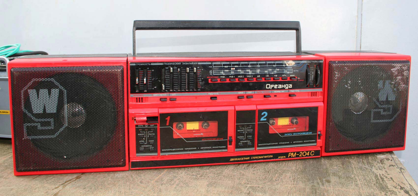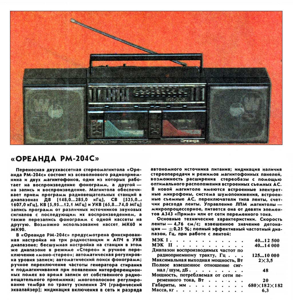 Стереофоническая магнитола *Ореанда РМ-204-С* с 1989 года выпускалась Симферопольским заводом *Фиолент*. Состоит из приёмника и двух ЛПМ, работающих один на воспроизведение, а другой на запись и воспроизведение. МЛ работает в диапазонах ДВ, СВ, KB и УКВ, обеспечивая запись фонограмм с последующим воспроизведением, перезапись с кассеты на кассету. Есть три фиксированные настройки, АПЧ в ЧМ диапазоне; БШН, переключение моно-стерео; АРУЗ; автопоиск фонограмм; изменение частоты ГС; эквалайзер; индикация сети и батарей, стереоприёма, режимов МП, расширение стереобазы съёмными АС. Имеются микрофоны, система ШП, переключатели типа ленты, счетчик расхода ленты. Управление ЛПМ микропроцессорное. Питание 9 элементов А-343 или электрическая сеть. Коэффициент детонации ±0,25%. Диапазон рабочих частот на ленте МЭК-1 - 40...12500 Гц, МЭК-2 - 40...14000 Гц. Диапазон частот в ЧМ - 125...10000 Гц. Максимальная выходная мощность 2х3,5 Вт. Потребляемая мощность 20 Вт. Габариты магнитолы - 680 х 182 х 182 мм. Масса - 6,3 кг.