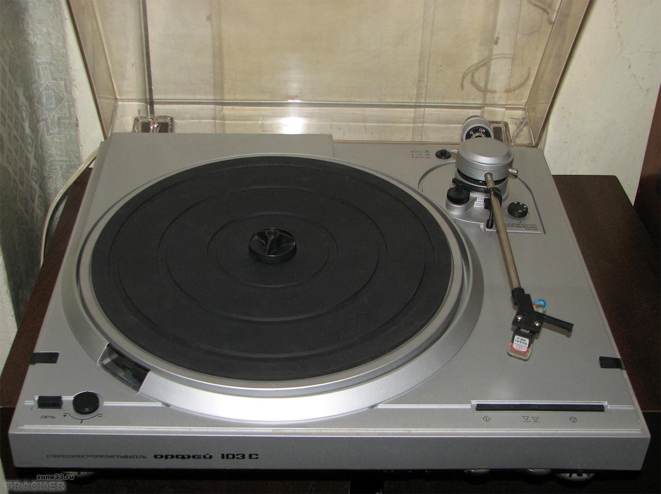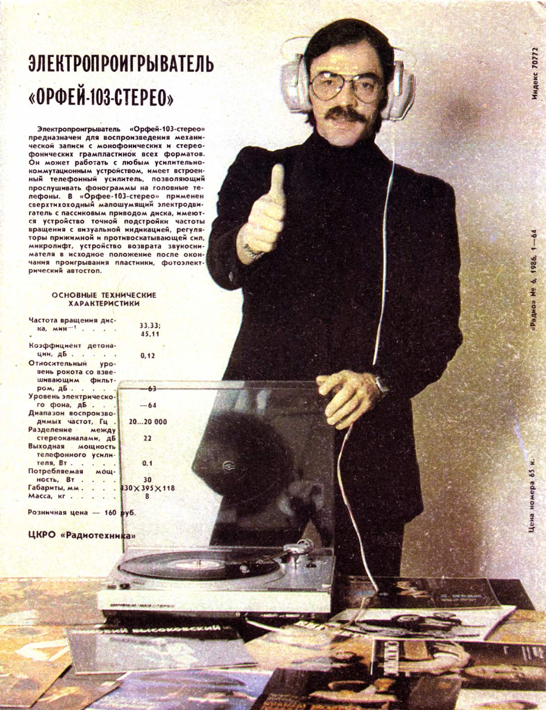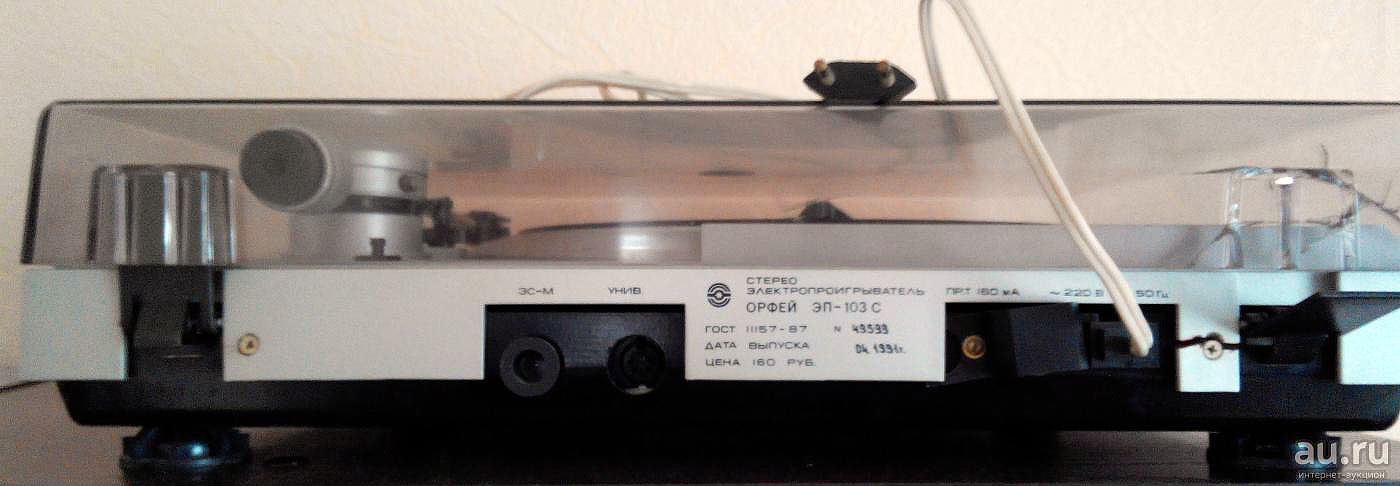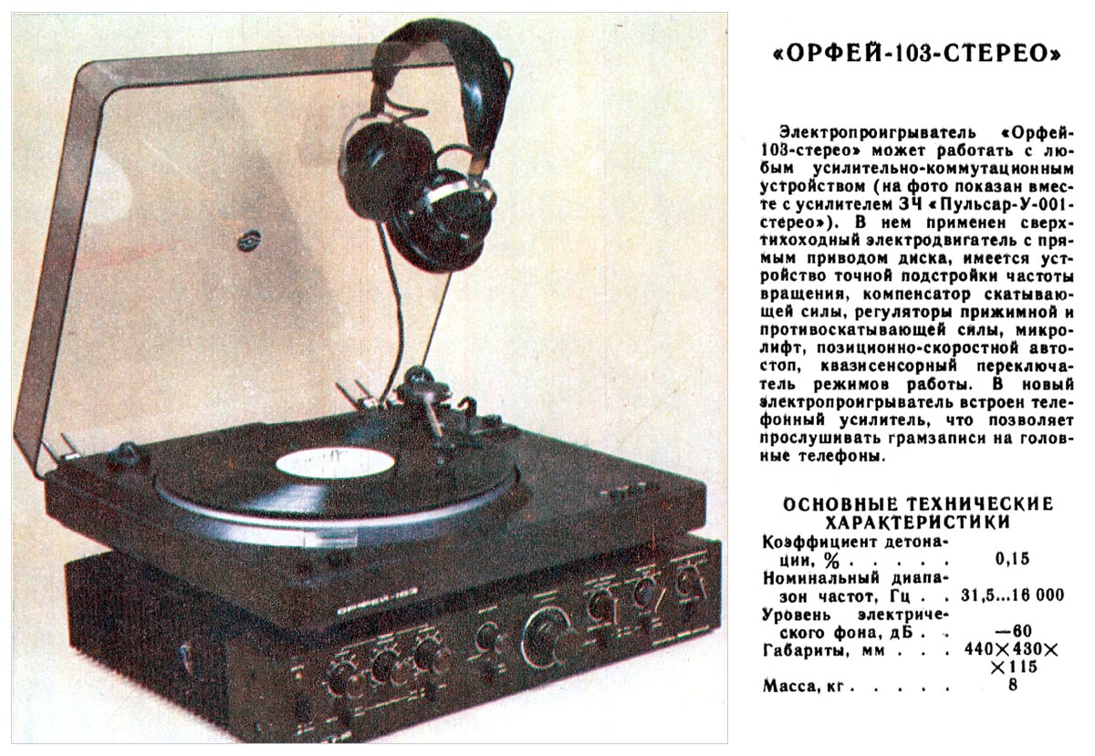 Электропроигрыватель *Орфей-103-стерео* с 1985 года выпускал Ижевский электромеханический завод. ЭП обеспечивает воспроизведение звукозаписи со стерео или монофонических грампластинок. Отличительные особенности проигрывателя - высокая стабильность частоты вращения диска, низкий уровень акустического шума, малые значения коэффициента детонации, широкий диапазон воспроизводимых частот, прослушивание грампластинок с помощью стереотелефонов, изолированный маятниковый подвес диска и звукоснимателя, использование различных магнитных головок звукоснимателя, не требует смазки в течение всего срока эксплуатации. ЭП имеет: сверх-тихоходный восьмиполюсный шаговый двигатель постоянного тока с пассиковым приводом; устройство точной подстройки частоты вращения диска со стробоскопическим индикатором, компенсатор скатывающей силы, регулятор прижимной силы, микролифт тонарма; возврат звукоснимателя в исходное положение, фотоэлектрический автостоп; встроенный, высококачественный усилитель НЧ, позволяющий прослушивать запись с пластинок на головные стереотелефоны. Частота вращения диска ЭП - 33 и 45 об/мин. Диапазон воспроизводимых звуковых частот 20...20000 Гц. Коэффициент детонации 0,12%. Относительный уровень рокота со взвешивающим фильтром -63 дБ. Прижимная сила звукоснимателя 18 мН. Потребляемая мощность 30 Вт. Габариты ЭП - 435х395х118 мм. Вес 9 кг. С 1987 года электропроигрыватель именовался как *Орфей ЭП-103-стерео*. С 1990 года завод подготовил к выпуску обновлённый электропроигрыватель *Орфей ЭП-104-стерео*, но в серию он не пошёл из-за нарастающих экономических проблем в стране.