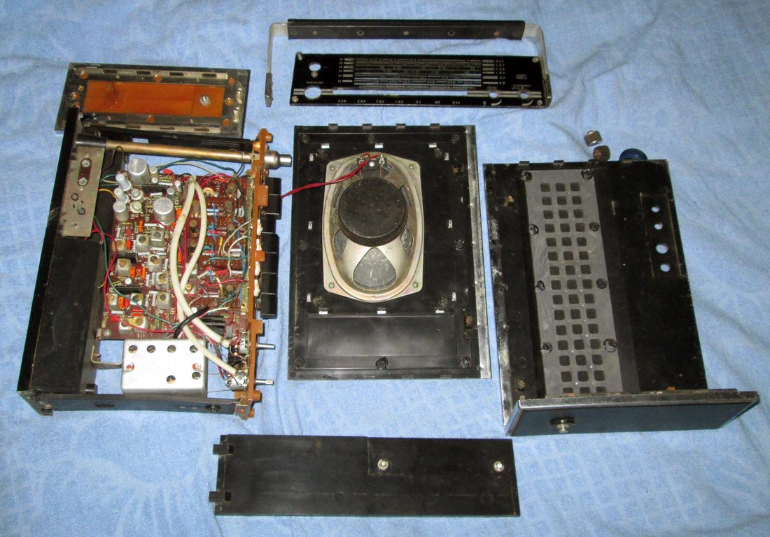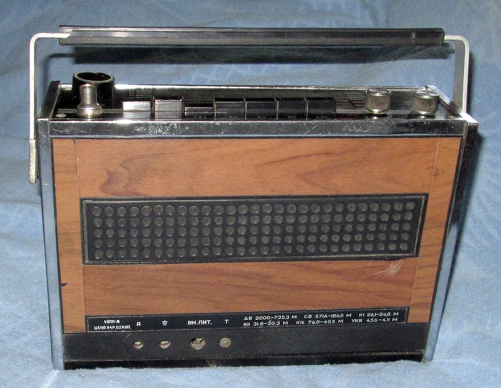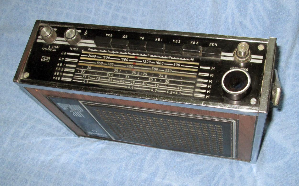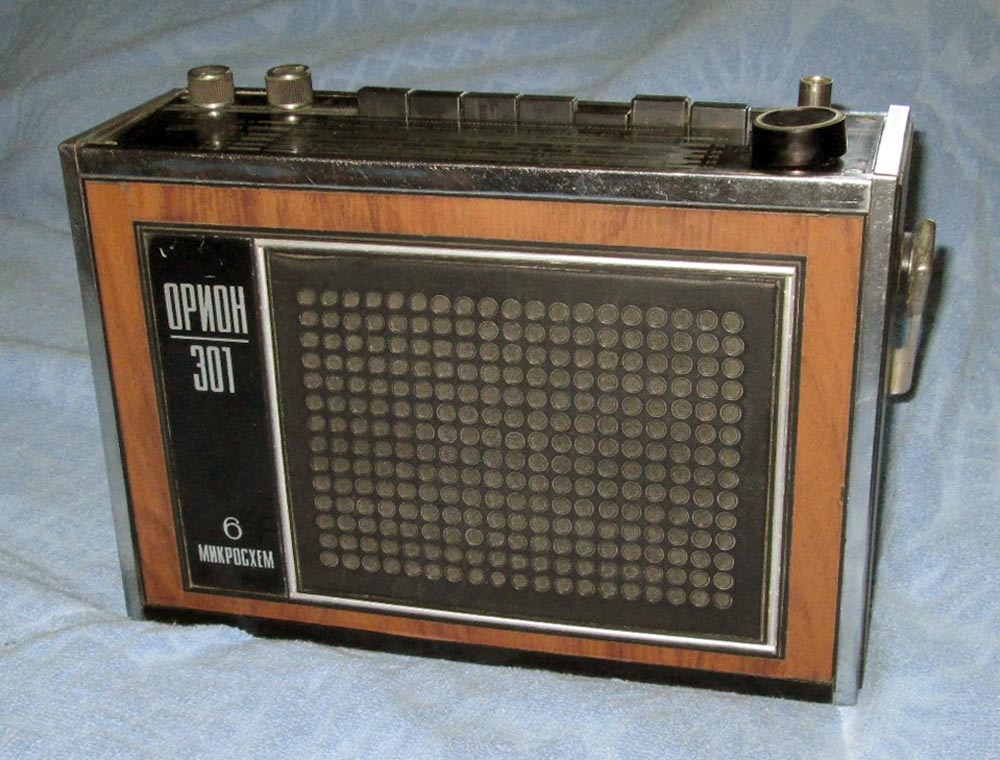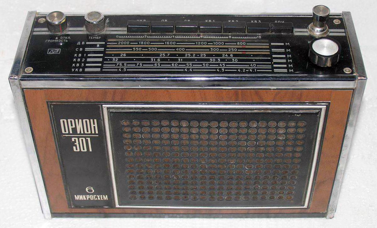 Переносный радиоприемник 3-го класса *Орион-301* с 1973 года выпускал Днепропетровский радиозавод. Приёмник работает в диапазонах: ДВ, СВ, KB-1 25,7...24,8 м, КВ-2 31,8...30,7 м и УКВ-ЧМ (АПЧ). Помимо транзисторов использовано шесть гибридных микросхем. В приёмнике имеются: плавная регулировка тембра по ВЧ; гнёзда внешней антенны, внешнего источника питания, головных телефонов. Громкоговоритель применён 1ГД-40. Питание от 6 элементов А-373 или от сети, через выносной унифицированный блок питания **БП-9/2**. Габариты радиоприёмника - 195х90х295 мм. Масса 2,6 кг.