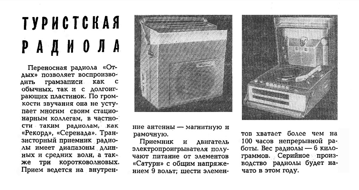 Переносная транзисторная радиола *Отдых* с 1965 года выпускалась Кыштымским радиозаводом. Радиола 2 класса с автономным питанием **Отдых** создана на базе шасси радиолы **Эфир-М** и представляет собой супергетеродин настольно-переносного типа, собранный на 9 транзисторах и совмещённый с ЭПУ. Радиола предназначена для приёма в диапазонах ДВ, СВ и КВ на наружную и внутреннюю магнитную антенны и воспроизведения грамзаписи. В диапазоне КВ приём ведётся от внешней антенны. Диапазон КВ разделен на 3 поддиапазона. ЭПУ имеет 3 скорости вращения диска. Чувствительность при работе от магнитной антенны: на ДВ 1,2 мВ/м, СВ 0,6 мВ/м. От внешней антенны: ДВ - 65 мкВ, СВ - 50 мкВ, КВ - 30 мкВ. Избирательность по соседнему каналу 36 дБ. Ослабление зеркального канала: ДВ - 40 дБ, СВ - 30 дБ, КВ - 15 дБ. ПЧ равна 465 кГц. Полоса воспроизводимых частот при приёме 150...4000 Гц, при воспроизведении грамзаписи 150...10000 Гц. Номинальная выходная мощность 500 мВт. Питание 6 батарей А-373. Потребляемый приёмником ток при отсутствии сигнала 14 мА. Работа приёмника сохраняется при снижении напряжения питания до 4 В. Длительность работы приёмника при средней громкости от элементов А-373 около 200 часов. Чувствительность со звукоснимателя при номинальной мощности 120 мВ. Габариты модели 320х340х160 мм. Масса 7,8 кг. Отделяемая закрывающаяся верхняя крышка радиолы является и акустической системой радиолы. Партия радиол выпускалась в комплекте с выносным блоком питания, поэтому такая модель называлась *Радиола на транзисторах *Отдых* с универсальным питанием*.