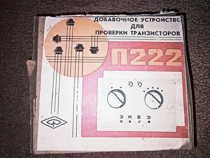 Добавочное устройство для проверки транзисторов *П-222* с 1973 года выпускал Омский завод *Электроточприбор*. Устройство предназначено для измерения исправности и параметров транзисторов прямой и обратной проводимости совместно с комбинированным прибором типа *Ц-20*. Недостаток устройства - смена полярности батарей при проверке транзисторов разной проводимости. Радиолюбители ставили переключатель полярности батарей между ручками устройства.