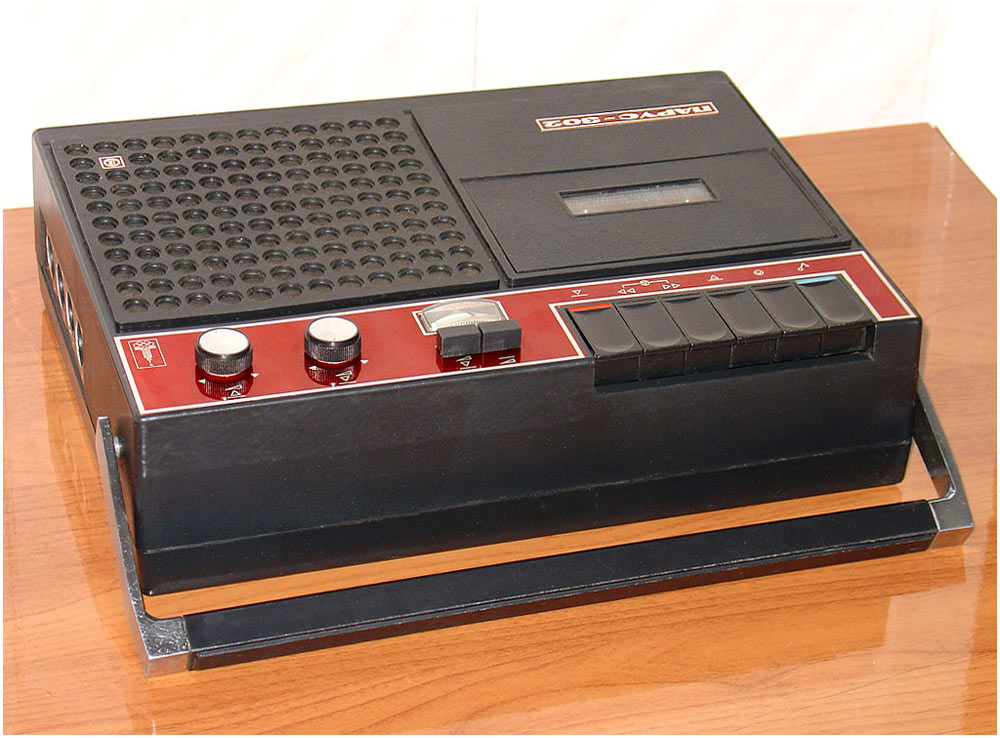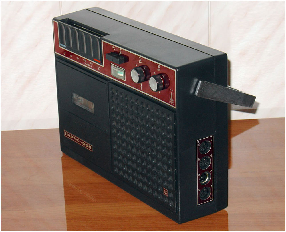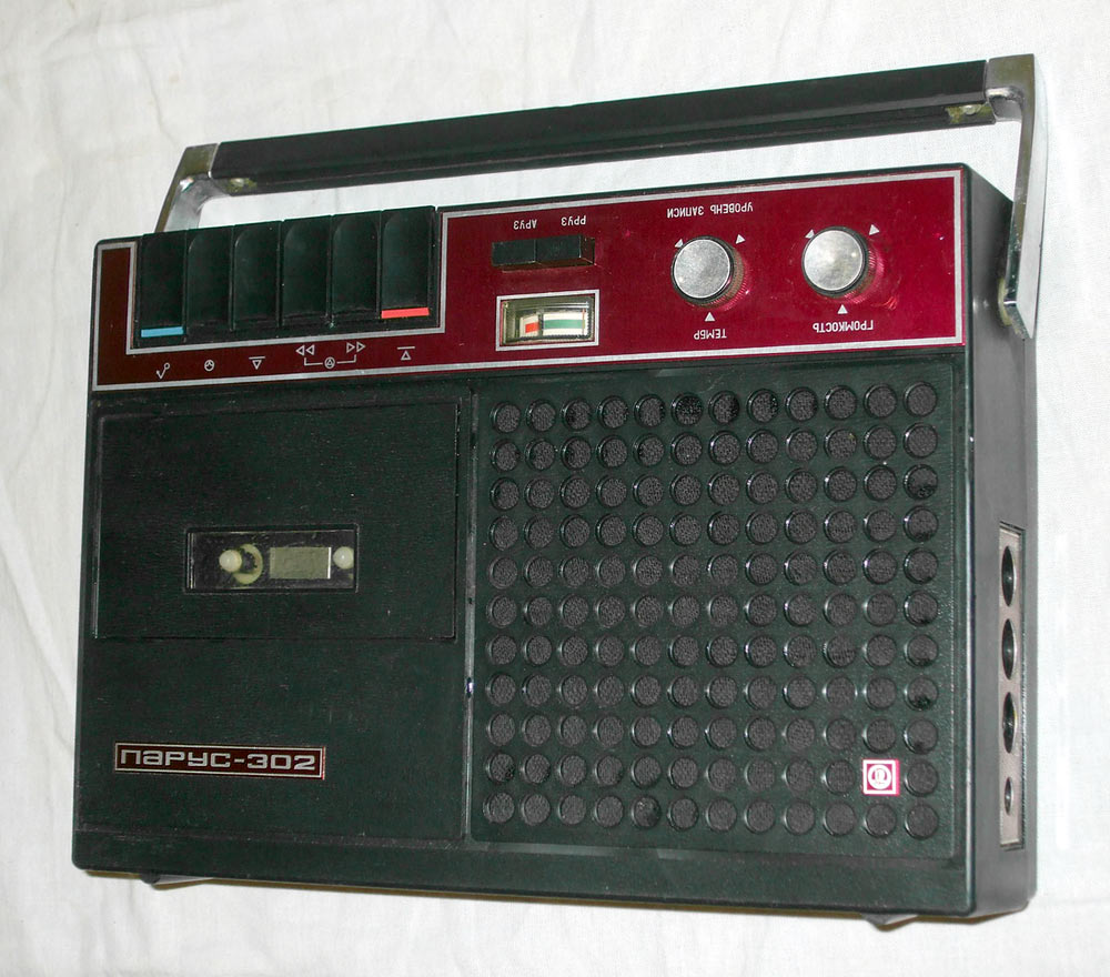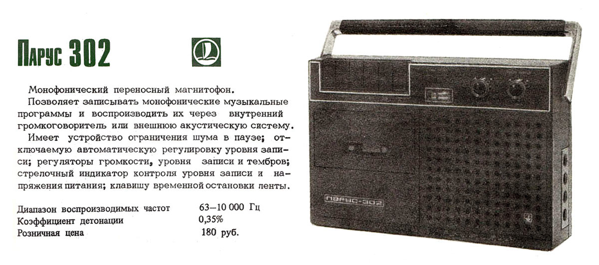Кассетный магнитофон *Парус-302* с I-кв 1979 года выпускал Саратовский завод *Знамя Труда*. Магнитофон предназначен для записи звуковых программ на магнитную ленту размещённую в кассете МК-60 и последующего их воспроизведения. Питается магнитофон от 8-ми элементов типа А-343 или внешнего источника постоянного тока напряжением 12 вольт с номинальным током нагрузки 0,4 ампера или от сети с помощью блока питания, входящего в комплект. Потребляемый ток от источника питания при работе на внутренний громкоговоритель при выходной мощности 0,25 Вт не более 220 мА. Расход элементов 343 зависит от громкости воспроизведения и в общем их достаточно на 8...10 часов непрерывной работы магнитофона. Скорость движения ленты 4,76 см/с. Рабочий диапазон частот на ЛВ - 63...10000 Гц. Время записи при использовании кассеты МК-60 - 2х30 мин. Диапазон регулировки тембра по ВЧ - 10 дБ. Коэффициент детонации ±0,35%. Громкоговоритель типа 1ГД-40. Максимальная выходная мощность при работе от сетевого БП на внутренний громкоговоритель 1,5 Вт, на внешнюю АС сопротивлением 4 Ом - 2 Вт. Коэффициент искажений не более 5%. Габариты магнитофона - 312х266х82 мм. Масса - 3,5 кг. В магнитофоне имеется ручная и автоматическая регулировки уровня записи.