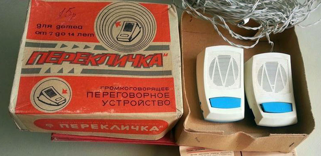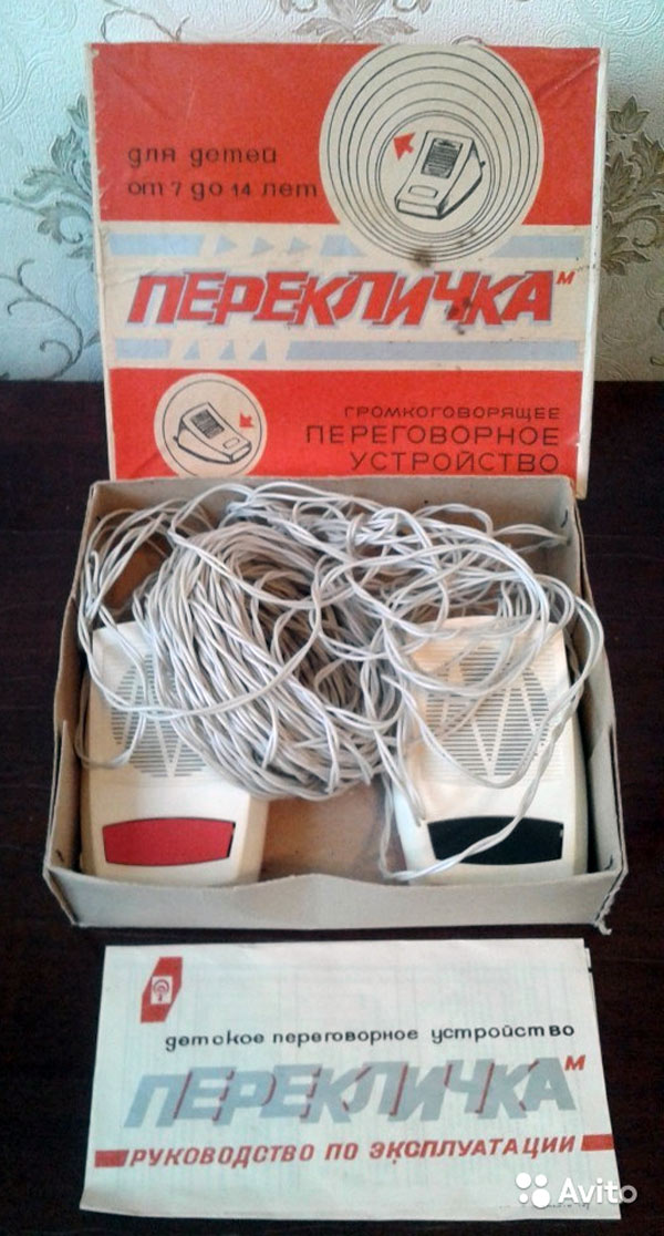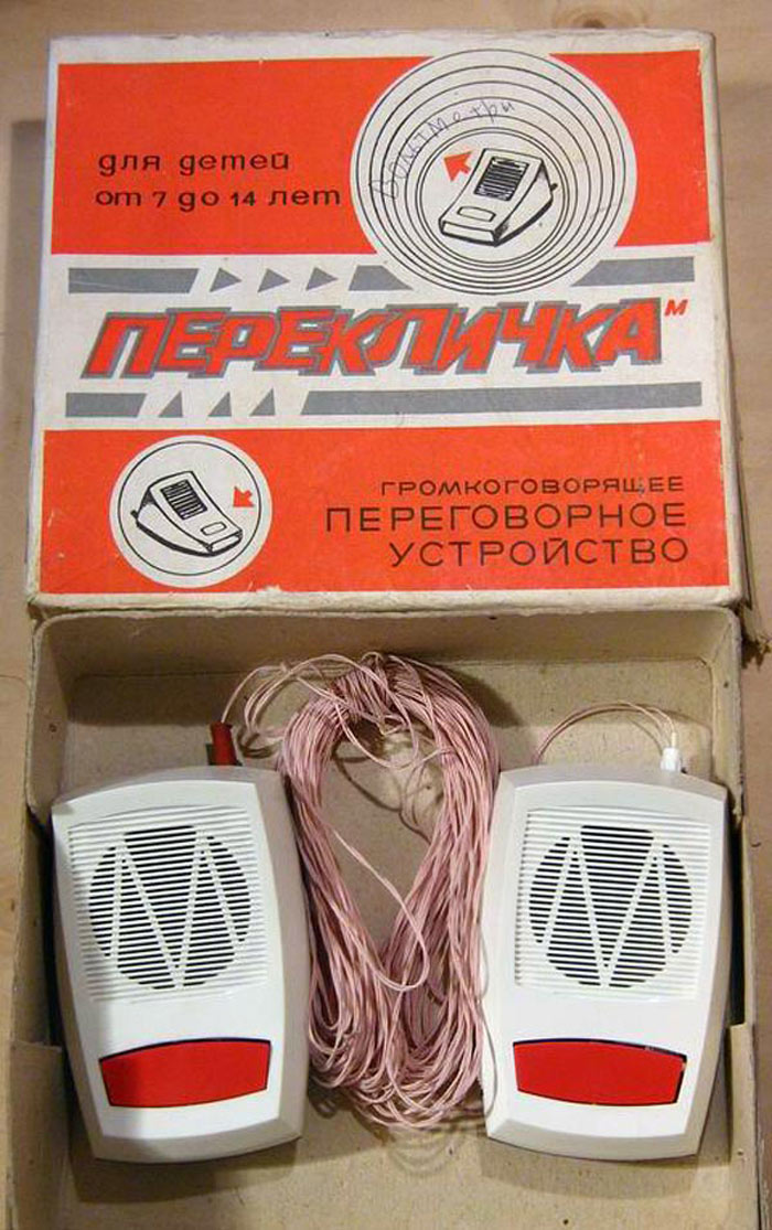 Детское переговорное устройство *Перекличка-М* выпускалось возможно с 1985 года в Ленинграде. Переговорное устройство предназначено для двухсторонней проводной связи между двумя абонентами на расстоянии имеющегося двойного провода, в комплекте провод длиной около 10 метров. Одно переговорное устройство имеет усилитель звуковой частоты с питанием от батареи Крона, двойную кнопку вызова (одна тон вызова 1 кГц, вторая передача) и громкоговоритель, другое устройство - только громкоговоритель и кнопку вызова.