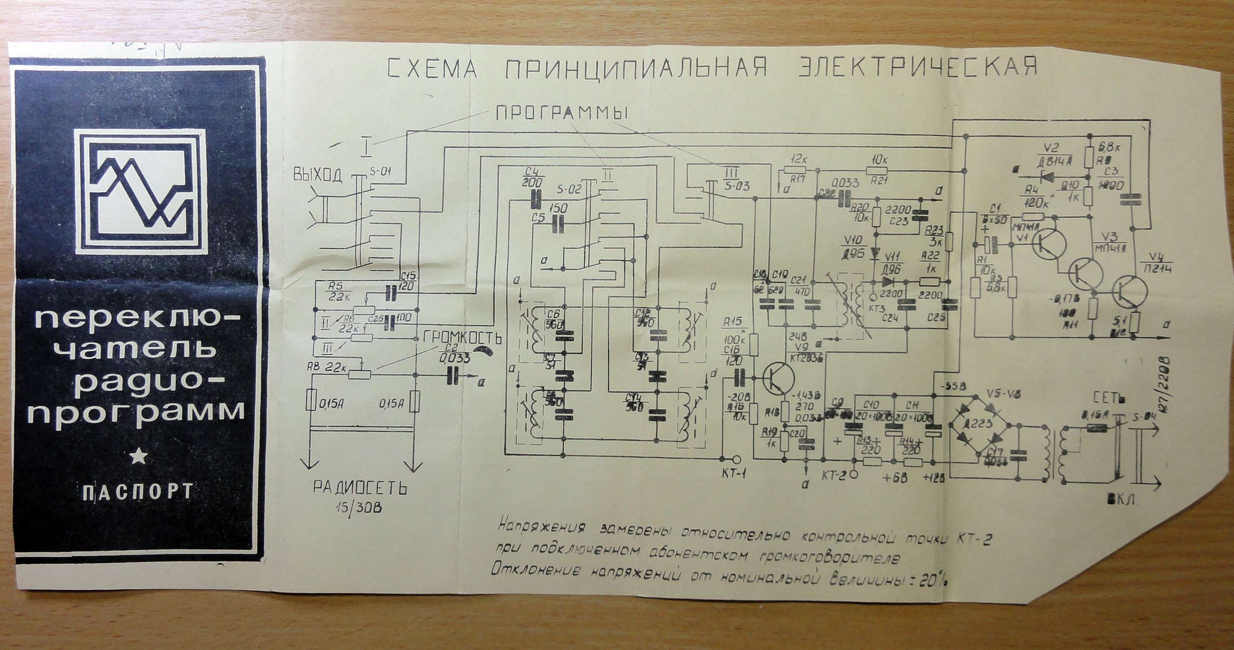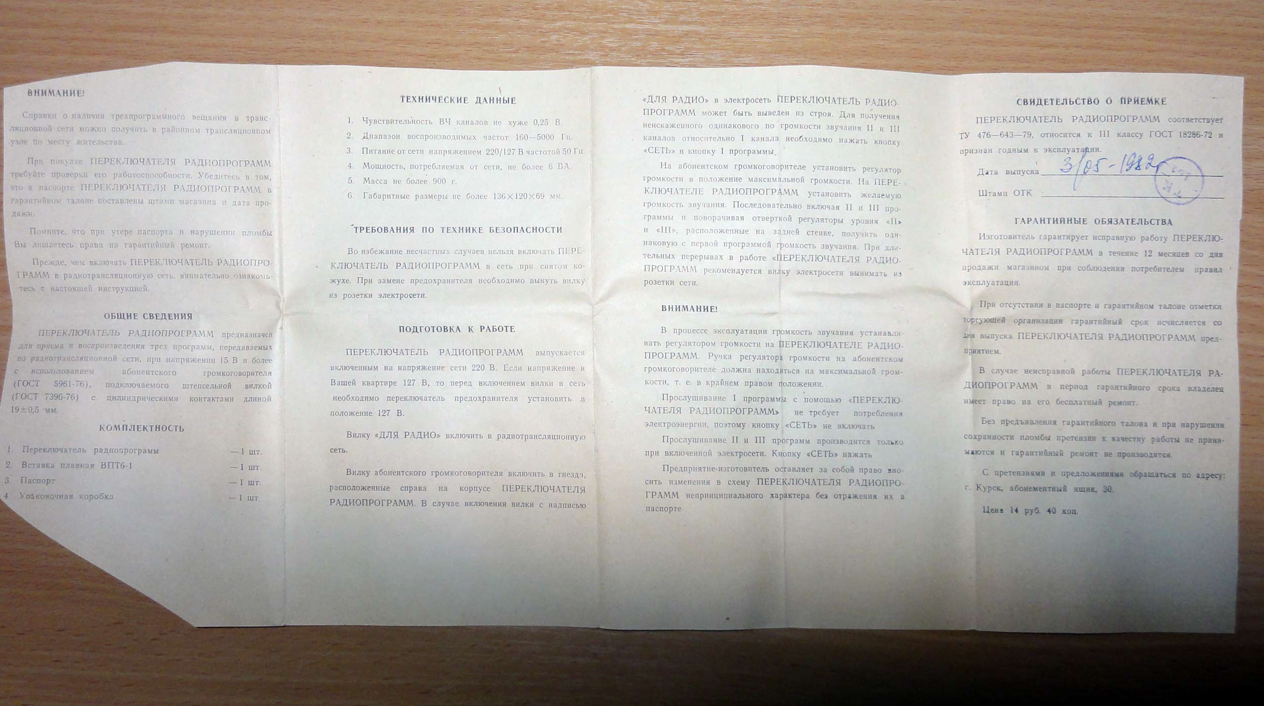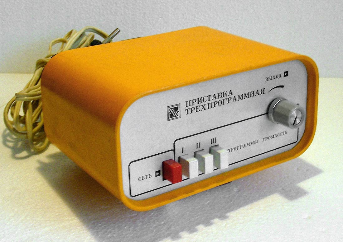 Приставка трёхпрограммная *Переключатель радиопрограмм* с 1982 года выпускалась Курским завод *Маяк*. Приставка трёхпрограммная предназначена для воспроизведения любой из трёх радиопрограмм, передаваемых по уплотнённой радиотрансляционной линии совместно с любым абонентским громкоговорителем.
