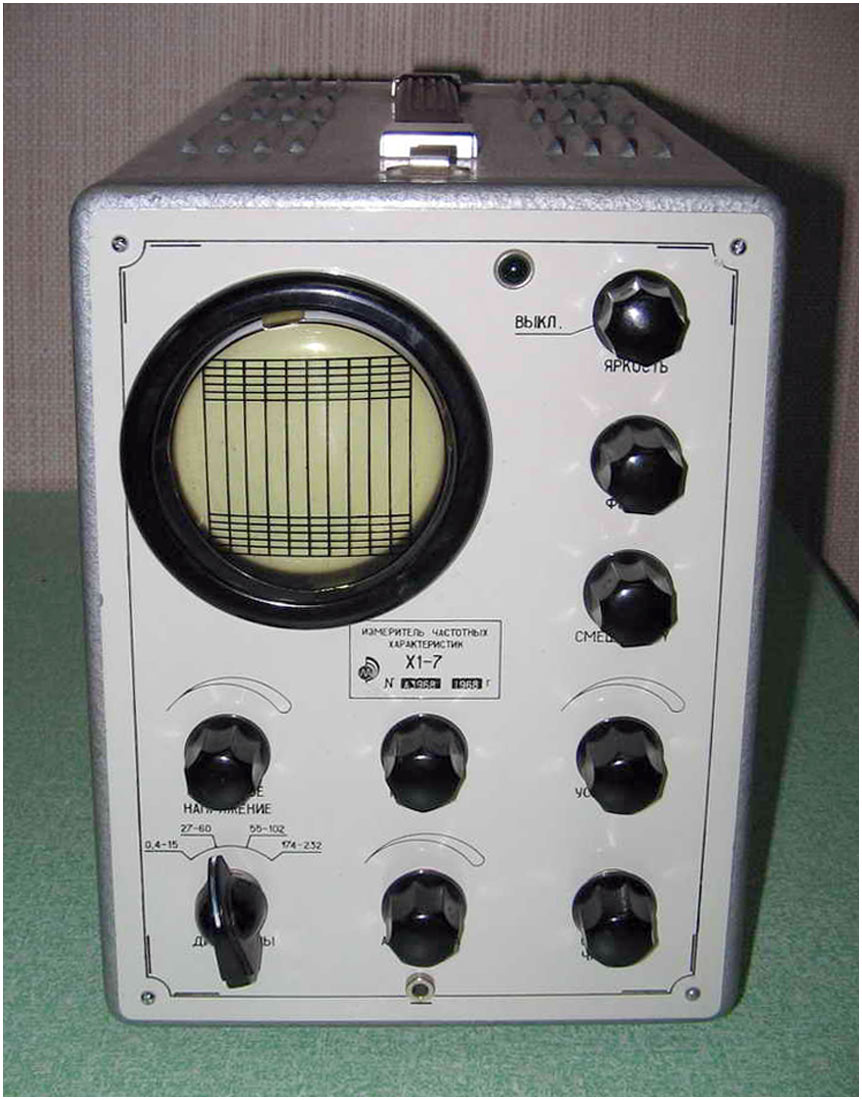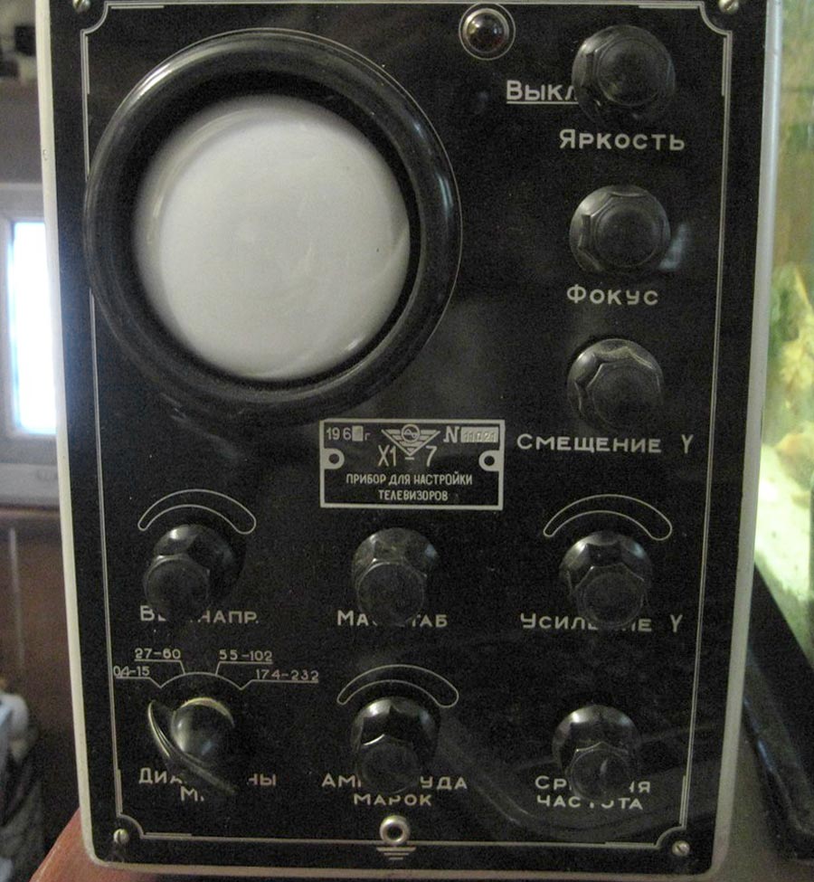 Прибор для настройки телевизоров *ПНТ-59* выпускался с 1959 года. Он предназначен для визуального просмотра АЧХ радиотелевизионных устройств и представляет собой сочетание четырехдиапазонного генератора качающейся частоты, маркерного генератора и осциллографического устройства. С помощью прибора *ПНТ-59* можно просматривать частотные характеристики видеоусилителей, усилителей промежуточной частоты видeo и звукового каналов, частотного детектора, усилителей высокой частоты, блоков ПТП, ПТК и УКВ ЧМ, контролировать согласование антенного кабеля с входом телевизора и антенной, определять волновое сопротивление высокочастотного коаксиального кабеля. Частоты ГКЧ: (0,4...15), (27...60), (55...102), (174...232) МГц. U вых = (50...250) мВ. Чувствительность 0,4 мм/мВ. С 1963 года выпускался полный аналог прибора, под наименованием измеритель частотных характеристик *Х1-7*, а с 1971 года модернизированный вариант *Х1-7А*. По нём информации нет, но скорее всего это так же аналог предыдущих приборов.