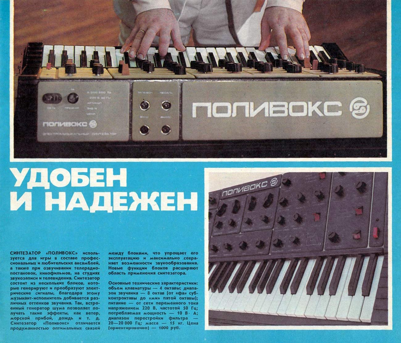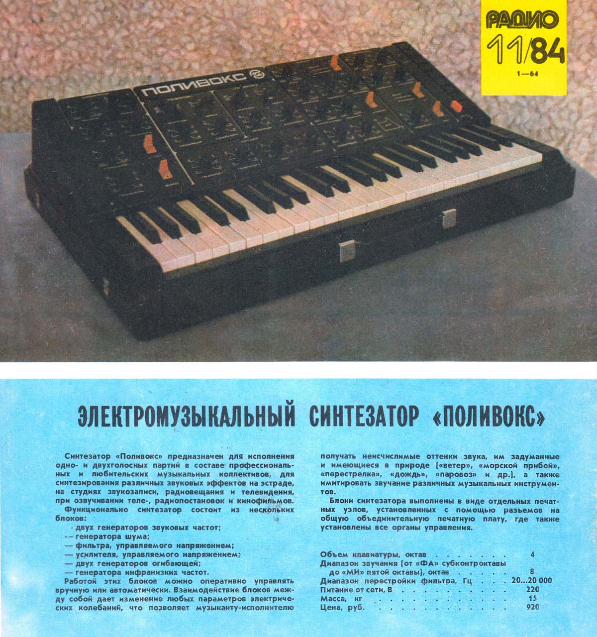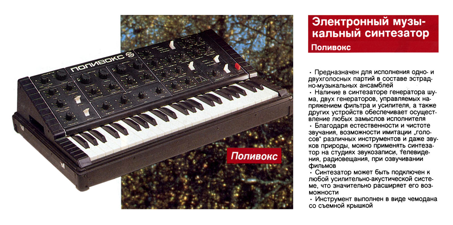 Электромузыкальный синтезатор *Поливокс* выпускался возможно с 1982 года Муромским заводом *РИП*. Синтезатор служит для исполнения одно и двухголосных партий в составе музыкальных групп, для синтезирования звуковых эффектов на эстраде, студиях звукозаписи, радиовещания и телевидения. Синтезатор состоит из двух генераторов ЗЧ; генератора шума; фильтра, управляемого напряжением усилителя, 2-х генераторов огибающей; генератора инфранизких частот. Работой блоков можно оперативно управлять вручную и автоматически. Взаимодействие блоков между собой дает изменение любых параметров электрических колебаний, что позволяет музыканту-исполнителю получать неисчислимые оттенки звука, или им задуманные или имеющиеся в природе («ветер», «морской прибой», «перестрелка», «дождь», «паровоз» и др.) а также имитировать звучание различных музыкальных инструментов. Блоки синтезатора выполнены отдельными печатными узлами, установленными с помощью разъемов на общую печатную плату, где установлены и органы управления. Объем клавиатуры, октав четыре. Диапазон звучания (от «ФА» субконтроктавы до «МИ» пятой октавы), октав 8. Диапазон перестройки фильтра 20...20000 Гц. Питание от сети 220 В. Масса синтезатора 15 кг. Цена 920 рублей.