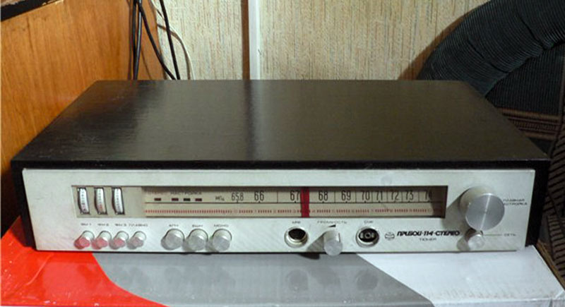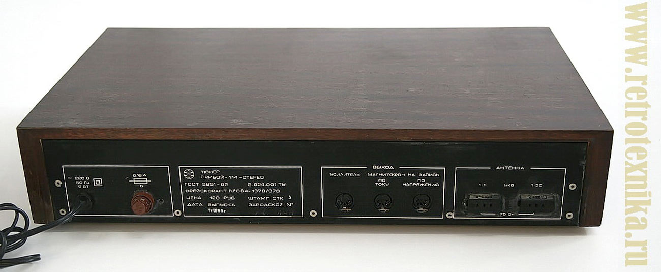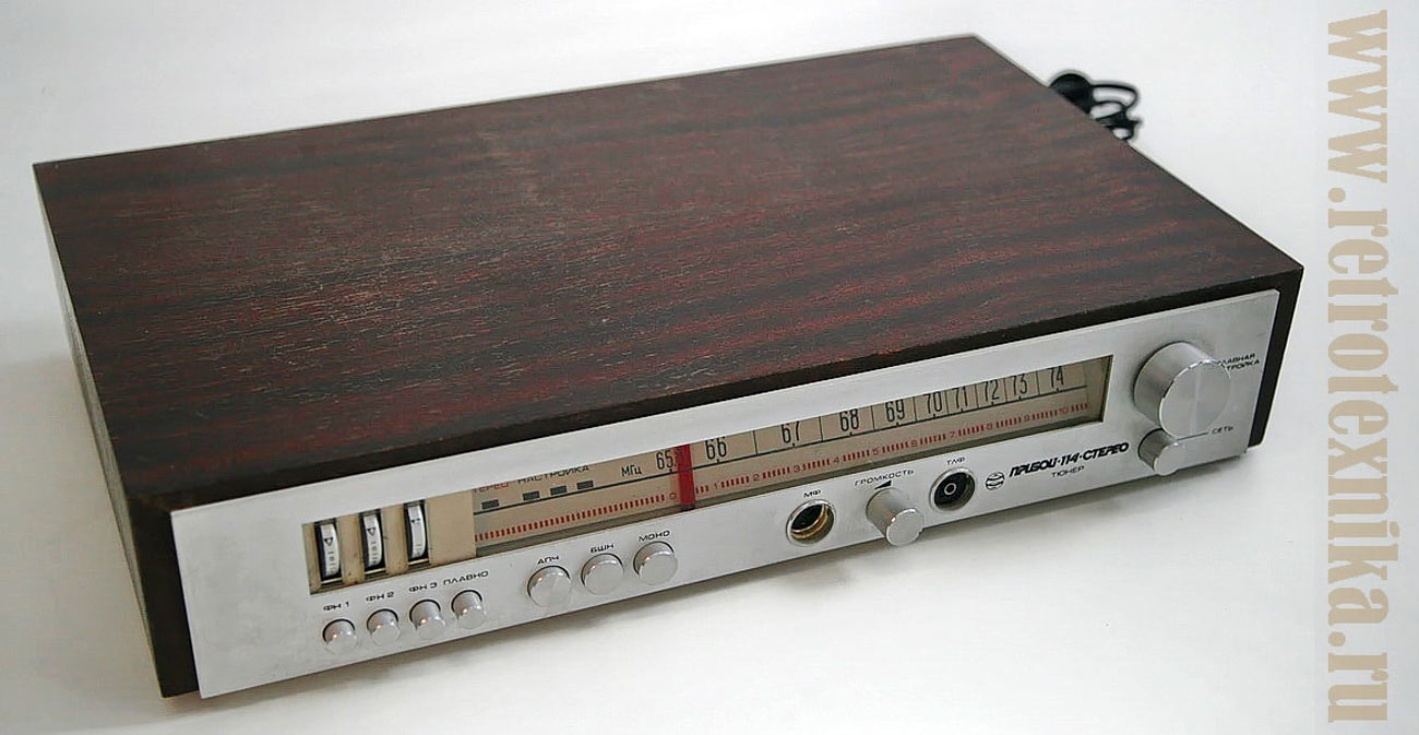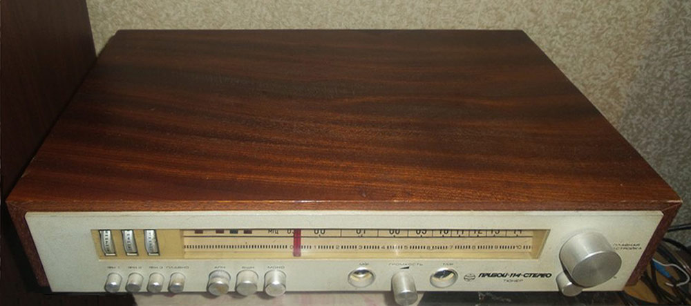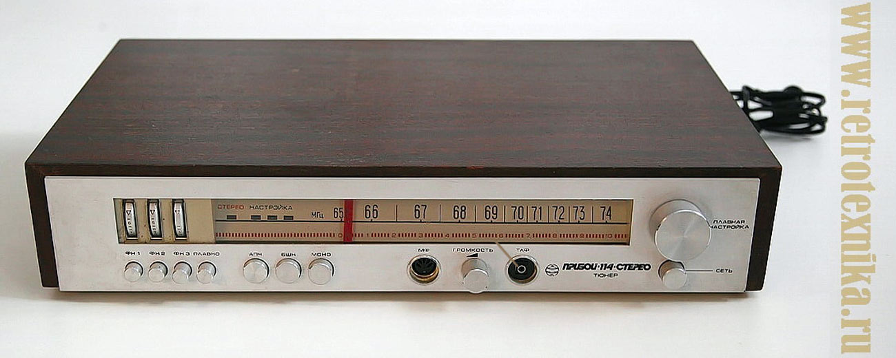 Тюнер *Прибой-114-стерео* с 1985 года выпускал Таганрогский завод *Прибой*. Тюнер предназначен для приёма моно и стереофонических программ в диапазоне УКВ. Ряд потребительских и эксплуатационных удобств впервые введены в этот тюнер. Это возможность отключения системы БШН и автоматического переключения из режима *Моно* в режим *Стерео*, регулировка громкости при прослушивании программ на головные телефоны, световая индикация режима *Стерео* и точной настройки. Розетки для головных телефонов и магнитофона на запись вынесены на переднюю панель тюнера. Чувствительность тюнера 3 мкВ. Диапазон рабочих частот звука на линейном выходе 40...15000 Гц.