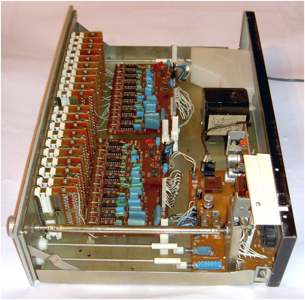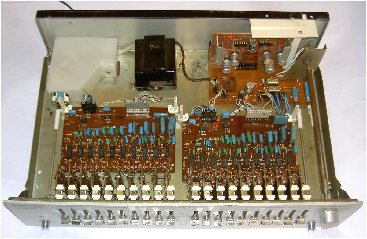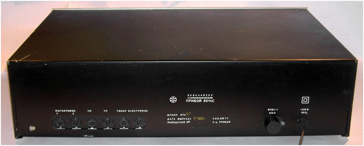 Стереофонический эквалайзер *Прибой Э-014С* с I-кв 1988 года выпускал Таганрогский завод *Прибой*. Стереофонический двухканальный, десятиполосный, графический эквалайзер **Прибой Э-014С** предназначен для регулировки амплитудно-частототных характеристик моно или стереофонических фонограмм с различных источников сигналов, в октавном ряду: 31.5, 63, 125, 250, 500, 1000, 2000, 4000, 8000, 16000 Гц. Дискретные резисторы ползункового типа позволяют получить графическую картину АЧХ, формируемую эквалайзером. Эквалайзер имеет минимальный уровень собственных шумов и искажений. В эквалайзере имеется переключатель входов и кнопка для обхода, позволяющая сравнивать фонограмму до и после эквалайзера. Эквалайзер питается от сети, потребляя мощность 5 Вт. С I-кв 1992 года завод выпускал эквалайзер **Прибой Э-015С** по электрической схеме аналогичный данному, однако какое оформление имел этот эквалайзер, неизвестно.