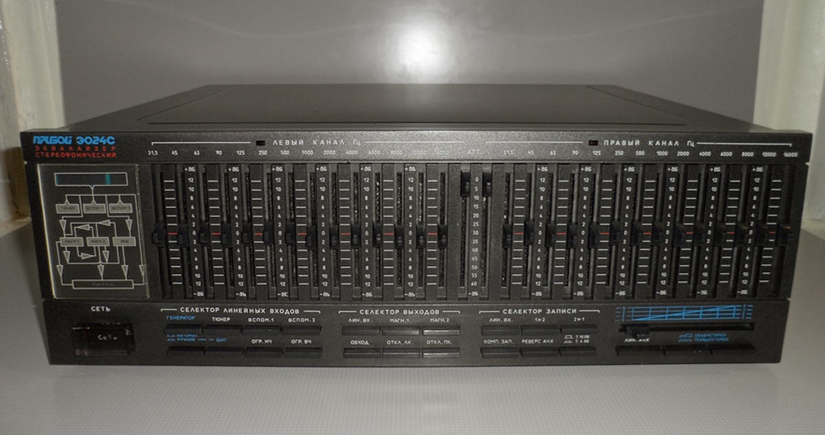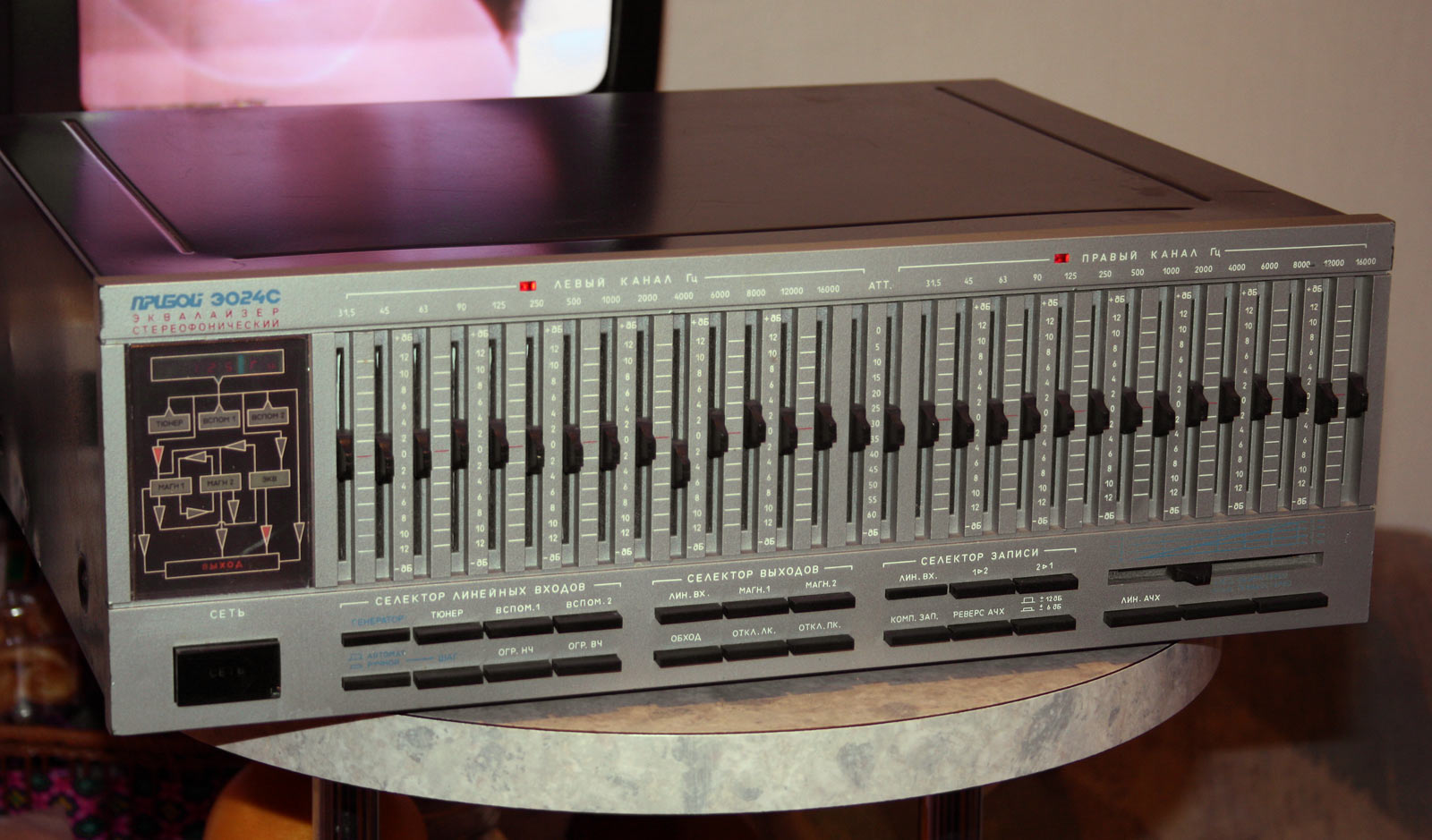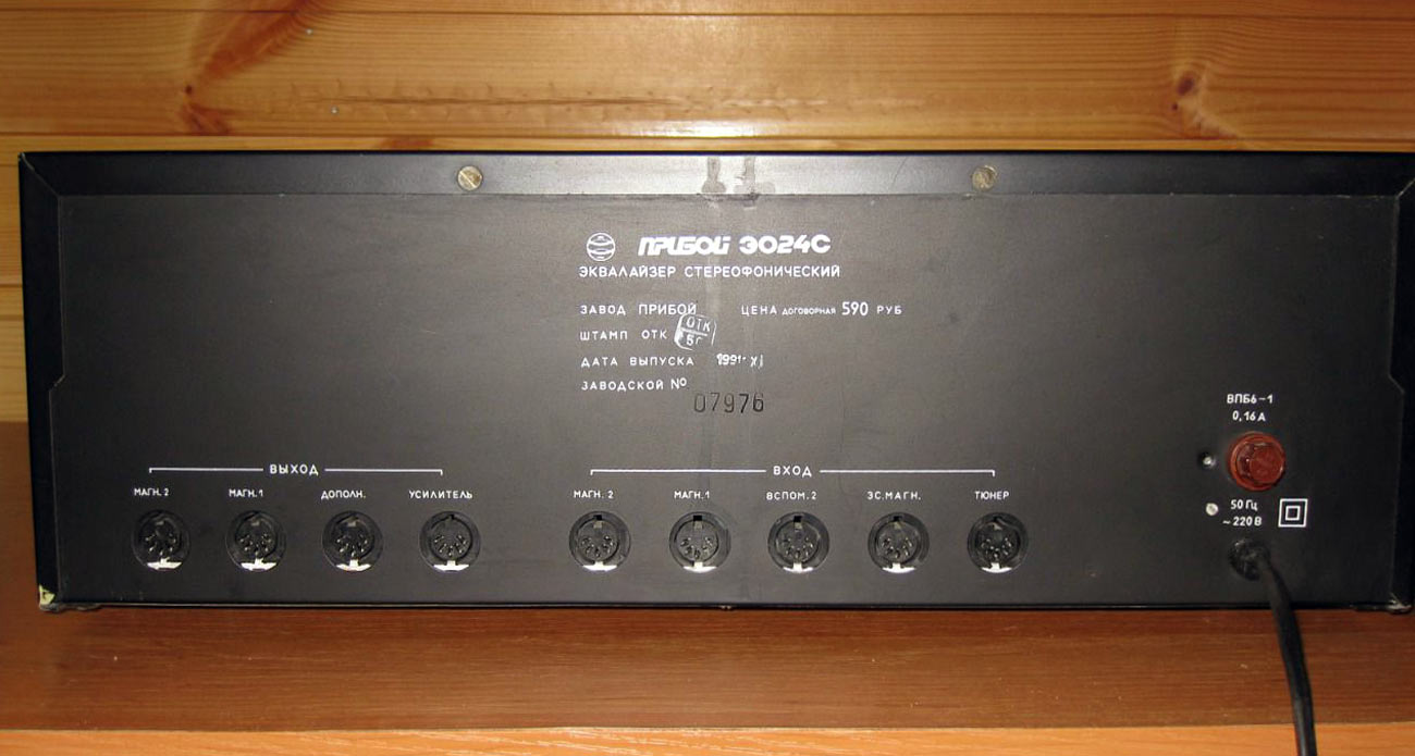 Стереофонический графический эквалайзер *Прибой Э-024С* с I-кв 1991 года выпускал Таганрогский завод Прибой. Стереофонический двухканальный 14-ти полосный графический эквалайзер **Прибой Э-024С** предназначен для оперативной регулировки амплитудно-частототных характеристик моно или стереофонических фонограмм с различных источников в октавном ряду 31,5, 45, 63, 90, 125, 250, 500, 1000, 2000, 4000, 6000, 8000, 12000 и 16000 Гц. Дискретные резисторы ползункового типа позволяют получить графическую картину АЧХ эквалайзера. Эквалайзер имеет минимальный уровень шумов. В нём имеется переключатель входов и кнопка обхода, позволяющая сравнивать фонограмму до и после эквалайзера. Потребляемая мощность 10 Вт.