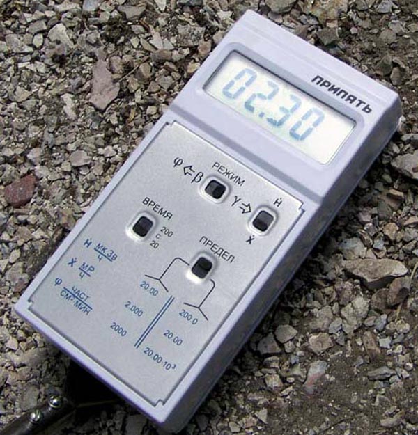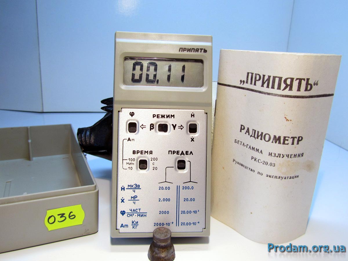 Бытовой радиометр *Припять* (РКС-20.03/1) выпускался с 1991 года. Предназначен для контроля радиационной обстановки в местах проживания и деятельности населения, а также контроля наличия радиоактивных веществ в продуктах питания и пробах внешней среды, других жидких и сыпучих веществах. Для определения радиационной чистоты жилых и производственных помещений, приусадебных участков, строqматериалов, металлолома и транспорта предназначена модификация радиометра РКС-20.03/1. С помощью радиометра можно измерять: мощность экспозиционной дозы гамма и рентгеновского излучений; мощность эквивалентной дозы гамма и рентгеновского излучений; плотность потока бета-частиц; удельную активность нуклидов в продуктах питания, жидких и сыпучих веществах; радиометр может подавать звуковые сигналы о наличии радиационного излучения. Технические характеристики: Мощность экспозиционной дозы гамма и рентгеновского излучений, мР/ч – 0,01…20,00. Мощность эквивалентной дозы гамма и рентгеновского излучений, мкЗв/ч 0,1…200,0. Плотность потока бета-излучения, част/см2 • мин 5…20 • 103. Удельная активность (по изотопу цезий 137), Бк/кг (Бк/л) 3,7 • 103…7,4 • 105. Объемная активность, Ки/кг (Ки/л) 1 • 10-7…2 • 10-5.