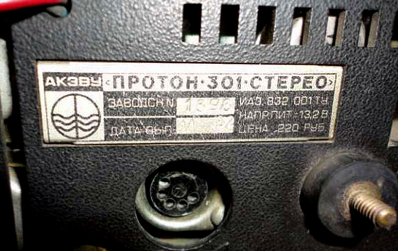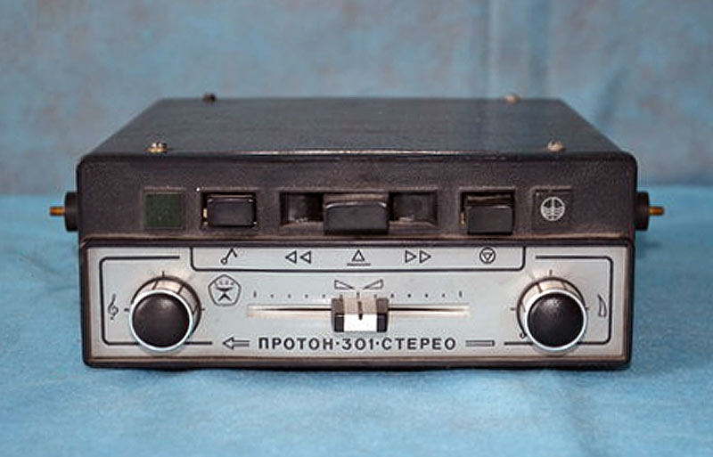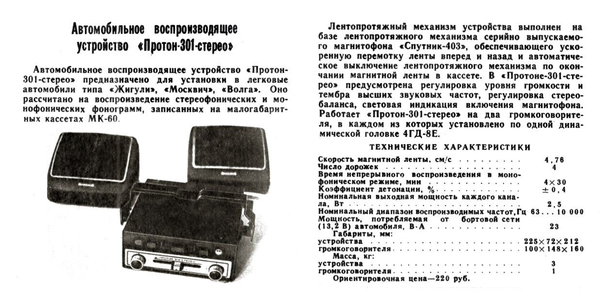 Автомобильное воспроизводящее устройство *Протон-301-стерео* с 1977 года выпускал Харьковский завод *Протон*. Предназначено для установки в автомобили Жигули, Москвич и Волга. Рассчитано на воспроизведение моно и стерео фонограмм с кассет МК. ЛПМ выполнен на базе ЛПМ магнитофона *Спутник-403*, обеспечивающего ускоренную перемотку ленты и автоматическое выключение ЛПМ по окончании кассеты. В АВУ имеется регулировка громкости, тембра ВЧ, стереобаланса, индикация включения. Работает АВУ на две АС в каждой из которых установлено по головке 4ГД-8Е. Скорость ленты 4,76 см/с. Время воспроизведения кассеты 2х30 мин. Коэффициент детонации ЛПМ ±0,4%. Номинальная выходная мощность 2х2 Вт. Диапазон рабочих частот 63...10000 Гц. Мощность, потребляемая от аккамулятора 23 Вт. Габариты АВУ - 225х72х212, АС - 100х148х160. Масса АВУ 3 кг, АС 1 кг. Цена АВУ 220 рублей.