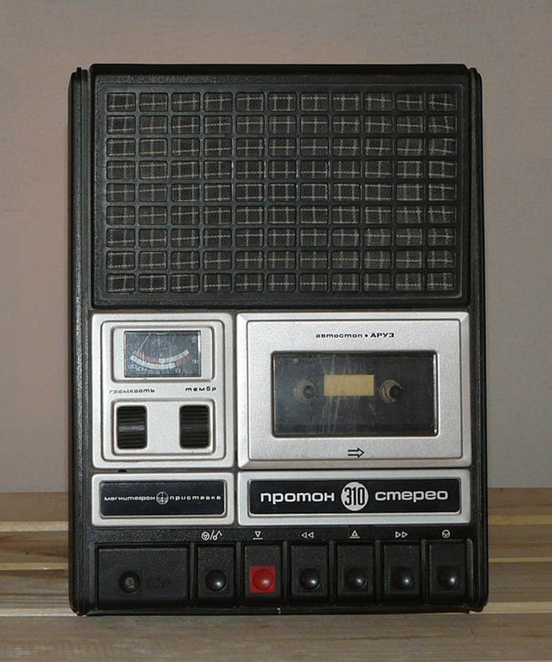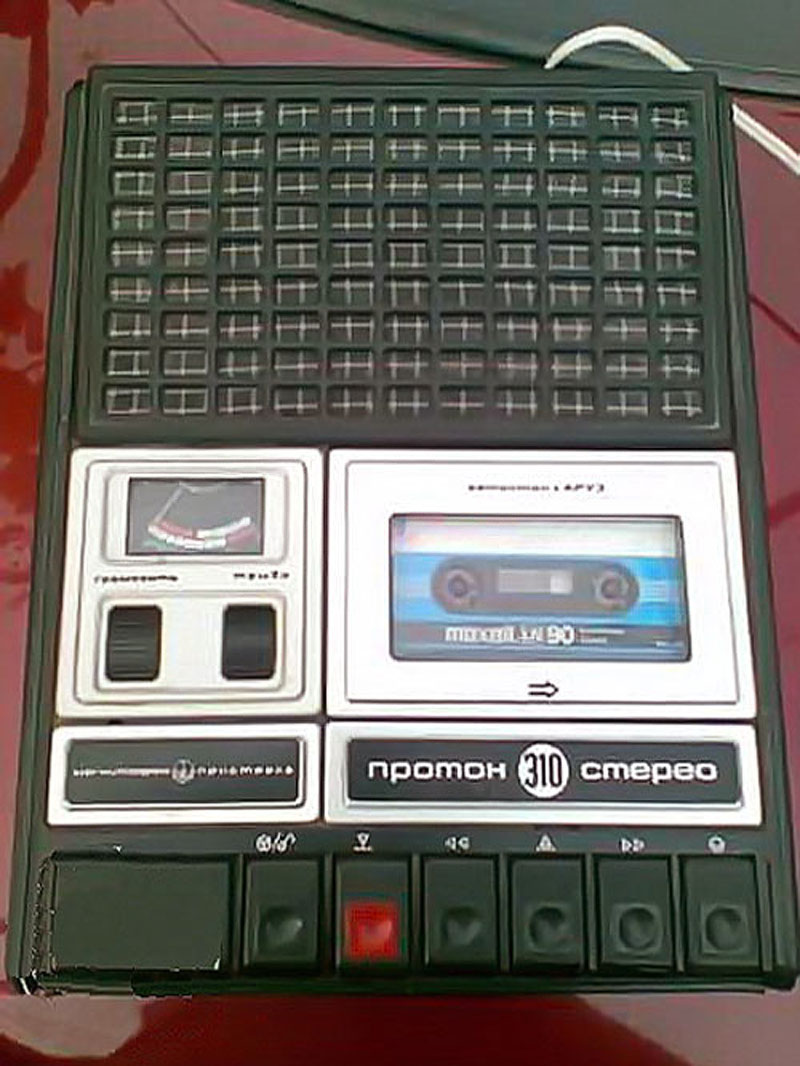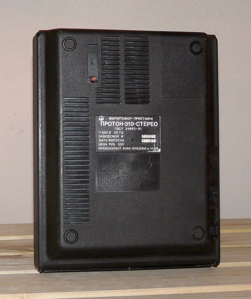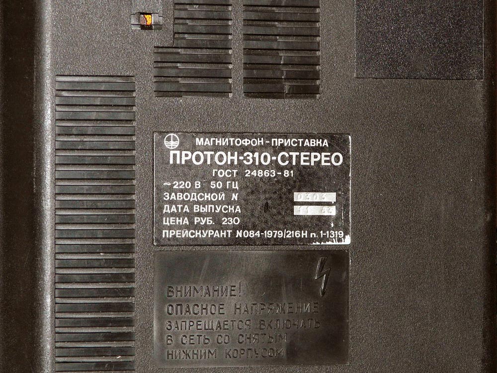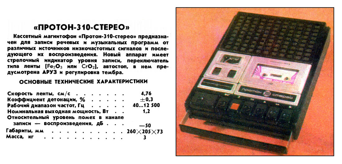 Кассетная стереофоническая магнитофон-приставка *Протон-310-стерео* с 1983 года малосерийно выпускалась Харьковским радиозаводом *Протон*. Стационарная магнитофон-приставка 3-го класса **Протон-310-стерео** предназначена для записи фонограмм от различных источников НЧ сигналов и их воспроизведением. Почему МП стационарная? Потому что не имеет отсека батарейного питания, питается от сети и предназначена для последующего усиления записанных фонограмм через УКУ с АС. МП имеет: стрелочный индикатор уровня записи и напряжения питания; переключатель типа ленты Fе и Сr; автостоп; систему АРУЗ; плавную регулировку громкости и тембра ВЧ. Основные параметры: скорость ленты 4,76 см/с; коэффициент детонации 0,3%; рабочий диапазон частот на линейном выходе 40...12500 Гц, с громкоговорителя 150...8000 Гц; номинальная выходная мощность 1,2 Вт, максимальная 2 Вт; уровень помех в канале записи и воспроизведения -50 дБ; габариты МГ - 260х205х73 мм; масса 3 кг.