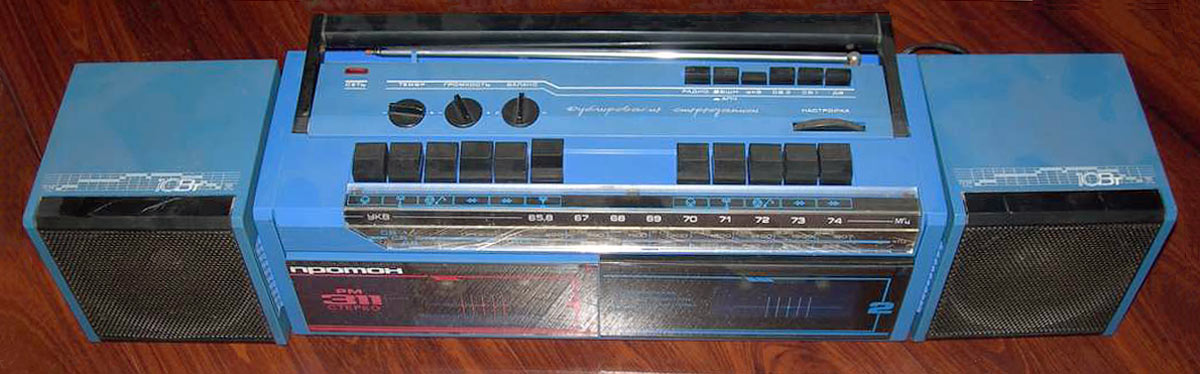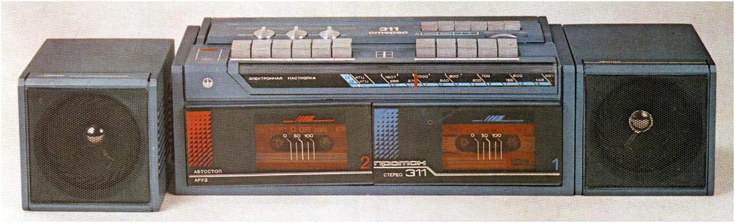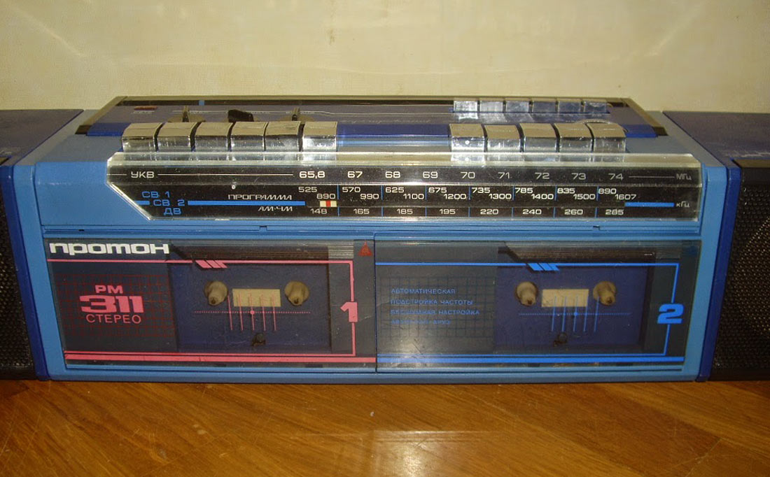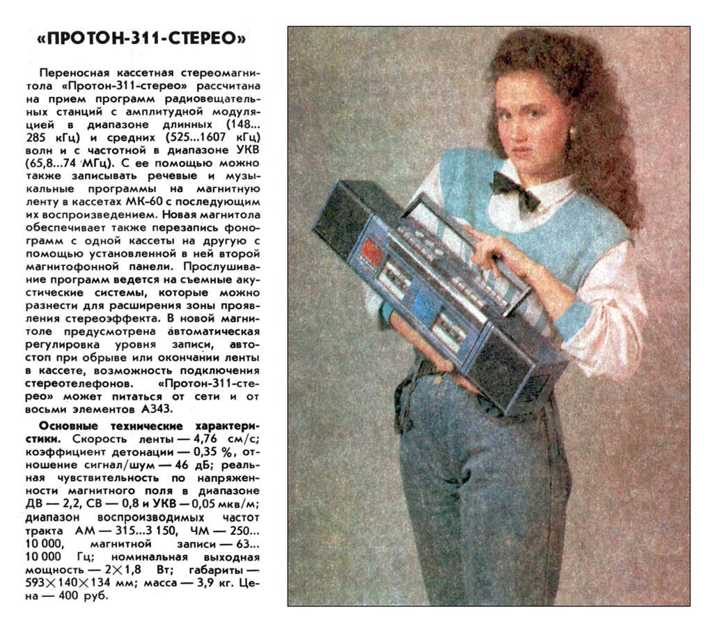 Портативная магнитола *Протон-311-стерео* с I-кв 1988 года выпускалась Харьковским радиозаводом *Протон*. Двухкассетная магнитола (с мая 1989 года **Протон РМ-311С**, позже *Протон РМД-311С*) рассчитана на приём в диапазонах: ДВ, СВ и УКВ. С её помощью можно записывать фонограммы на магнитную ленту в кассетах типа МК, с их последующим воспроизведением. Магнитола обеспечивает перезапись фонограмм с помощью второй магнитофонной панели. АС можно снять и разнести для расширения зоны действия стереоэффекта. В МЛ имеется система АРУЗ, автостоп при обрыве и окончании ленты в кассете, возможность подключения стереотелефонов. Питание от сети или 8 элементов А-343. Скорость ЛПМ 4,76 см/с; коэффициент детонации 0,35%, отношение сигнал/шум -46 дБ; диапазон частот звука АМ тракта 315...3150 Гц, ЧМ 250..10000 Гц, магнитной записи 63...10000 Гц; чувствительность в диапазоне ДВ 2,2, СВ 0,8, ЧМ 0,05 мВ/м; максимальная выходная мощность 2х1,8 Вт; габариты МЛ 593х140х134 мм; вес 3,9 кг. Цена модели 400 рублей. С 1989 года завод выпускал магнитолу *Протон РМ-211С* практически полный аналог описанной магнитолы. До конца года продолжился выпуск и магнитолы **Протон РМ-311С (РМД)**.