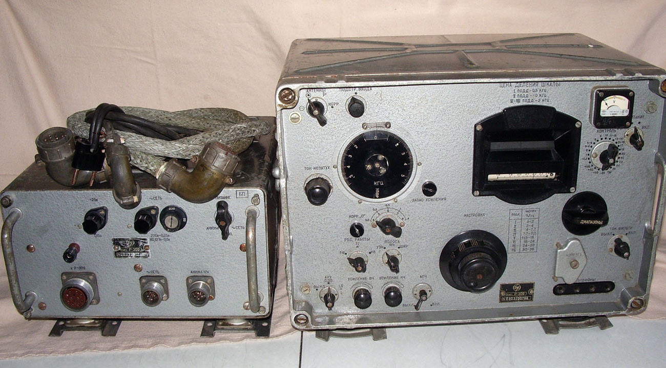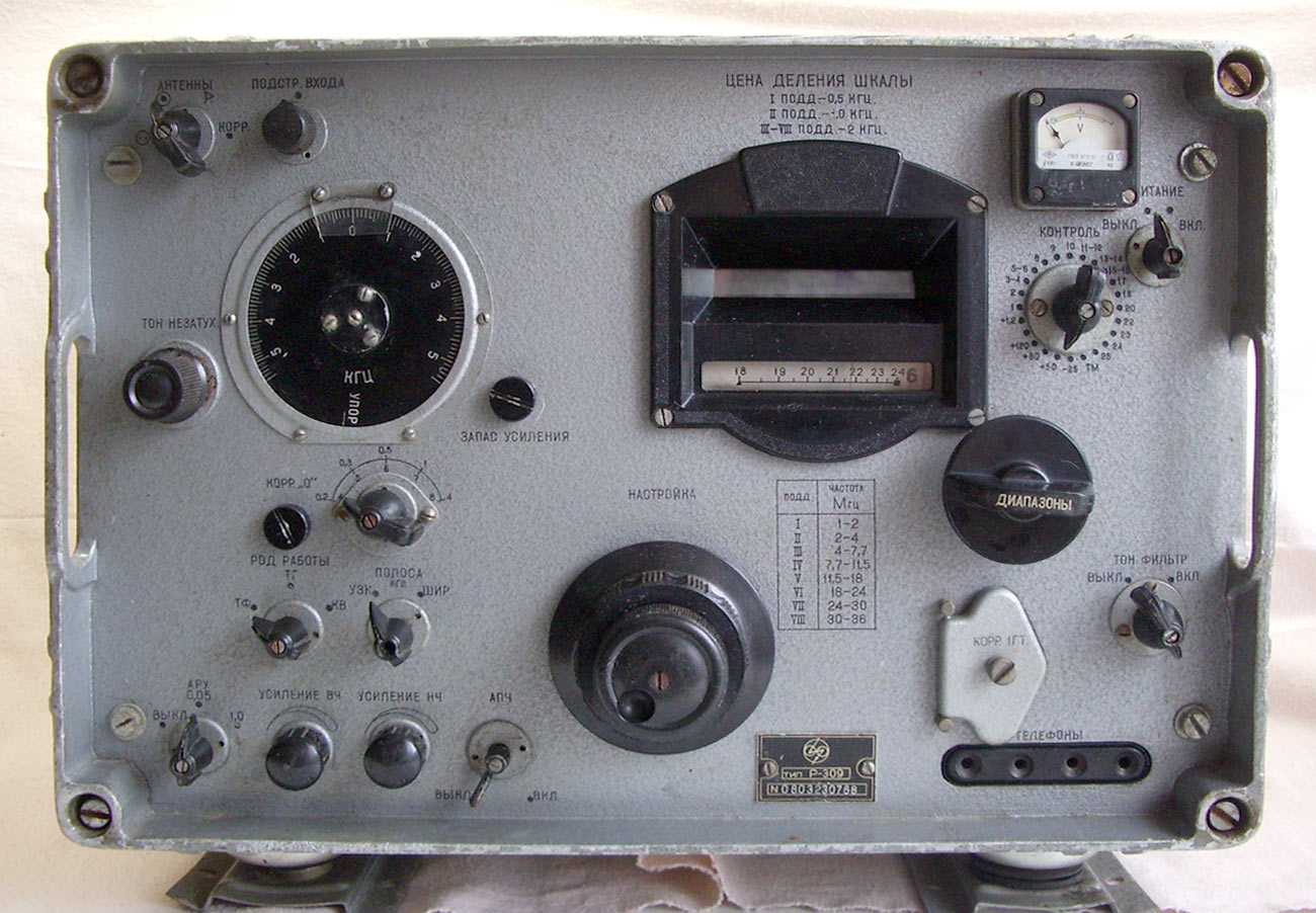 Магистральный профессиональный связной радиоприемник *Р-309* (Ячмень) с 1967 года выпускал Харьковский радиозавод им. 25-го съезда КПСС. Оптическая шкала. Диапазон частот: 1...36 МГц. Чувствительность при полосе 4 кГц в телефонном режиме 3 мкВ, телеграфном 0,6 мкВ. Ослабление чувствительности по зеркальному каналу не менее 4 тысяч раз, на 6-7 поддиапазонах не менее 2 т. раз. По сигналам ПЧ 10 т. раз. Количество точек поражённого приёма 20. Имеется выход НЧ 0,5 В (300...3000 Гц), АРУ для сдвоенного приёма, электродвигатель для АПЧ. Габариты приёмника: 480х290х440 мм. Вес 33 кг, БП 14 кг. Питание от сети переменного тока 127 или 220 В, через внешний БП или от аккумулятора напряжением 12 В. Более подробное описание приёмника имеется в интернете.
