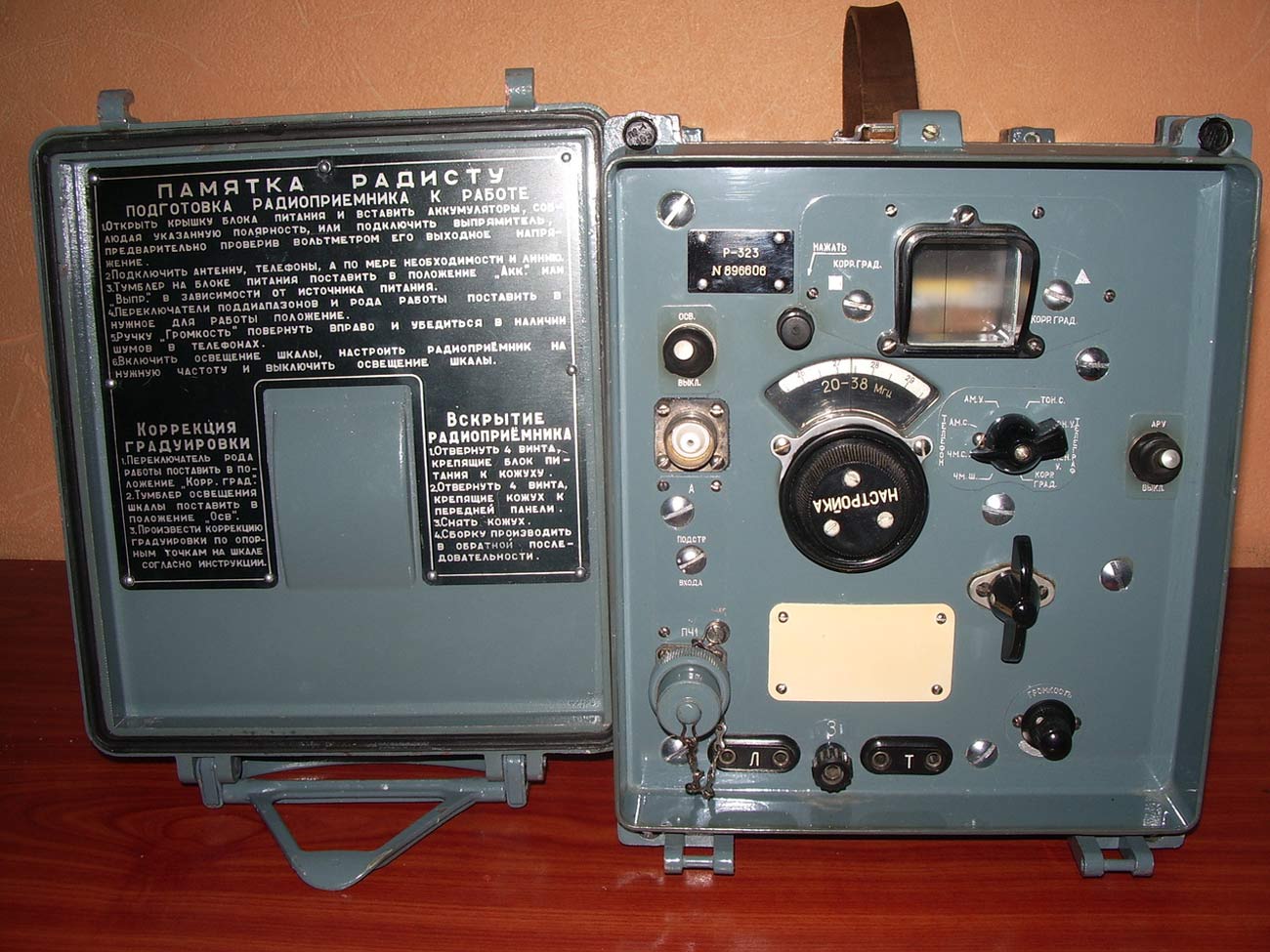 Армейский радиоприёмник *Р-323* (Цифра) малосерийно выпускался с 1961, а серийно с 1963 года. Предназначен для приёма сигналов с АМ и ЧМ модуляцией, а так же телеграфа. Собран по схеме супергетеродина с 3-мя преобразованиями на 28 лампах (5 ламп 1Ж29Б и 23 лампы 1Ж24Б). Для питания от сети переменного тока 220 или 127 В приёмник укомлектован отдельным выносным стабилизированным выпрямителем **ВС-2.5М**. Основные технические характеристики: Диапазон принимаемых частот 20...100 MHz (4 поддиапазона). Погрешность установки частоты 10 KHz. Формирование/установка частоты плавный гетеродин (LC генератор). Отображение частоты - оптическая шкала (дискретность 10/20 KHz). Чувствительность в АМ (узкая/широкая полоса) 3/5, FM - 2.5, CW 1 мкВ. Ослабление по зеркальному каналу не менее 800 раз. Полоса пропусканя 8, 25, 85 KHz. Промежуточные частоты 9 MHz; 2.86 MHz; 473 KHz. Выходное напряжение НЧ на одной паре низкоомных телефонов 4,5 В. КНИ - 10 %. Напряжение питания 2.5 В. Диапазон рабочих температур -50 +50°C. Габариты 225х270х370 мм. Масса 4,5 кг.