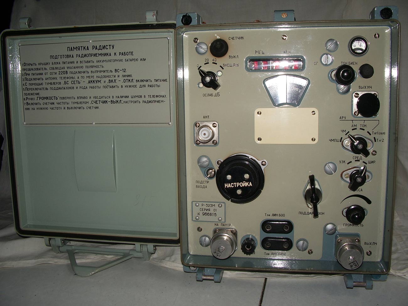 Армейский ламповый КВ-УКВ радиоприёмник *Р-323М* (Цифра-М) выпускался с 1978 года. **Р-323М** предназначен для приёма телеграфных сигналов и сигналов с амплитудной и частотной модуляцией. Радиоприемник собран по схеме супергетеродина, с двумя преобразованиями частоты. Имеет четыре поддиапазона. Индикация частоты осуществляется с помощью светодиодных индикаторов. Полоса пропускания переключаемая, имеет три положения. Регулировки усиления приёмник не имеет. По входу есть ступенчатый аттенюатор с ослаблением 0, 20 и 40 dB. По внешнему виду этот радиоприёмник схож с приёмником **Р-326М**,отличие в диапазоне принимаемых частот. Основные технические характеристики: Диапазон принимаемых частот 20...100 МГц. Формирование/установка частоты - плавный гетеродин (LC генератор). Чувствительность в режиме АМ (узкая/широкая полоса) - 3/5 мкВ, FM - 2,5 мкВ, CW 1 мкВ. Ослабление по зеркальному каналу не менее 800 раз. Номинальное напряжение питания - 12 В. Габариные размеры - 255х270х370 мм.
