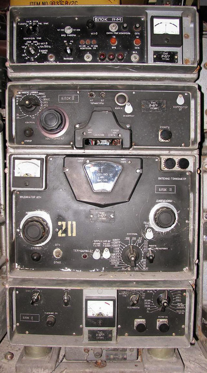 Радиоприёмник для ВМФ *Р-677* (Вихрь) выпускался с 1959 года Петропавловским п/я Р6641. Предназначен для пезпоискового вхождения в связь и приёма телефонных, телеграфных и однополосных сигналов. Диапазон частот приёма: 100...1500 КГц, разбит на 4 поддиапазона. К приёмнику выпускался конвертерный блок СДВ, позволяющий принимать частоты от 3 до 110 КГц с разбивкой на 6 поддиапазонов и блок IV-М (его назначение не установлено). Чувствительность приёмника при приёме телефонных сигналов 10 мкВ, телеграфных 2 мкВ. Супергетеродин с одним преобразованием. Масса приёмника (5 блоков) 100 кг. На основном фото приведён полный комплект радиоприёмника *Р-677* с 2 дополнительными блоками.