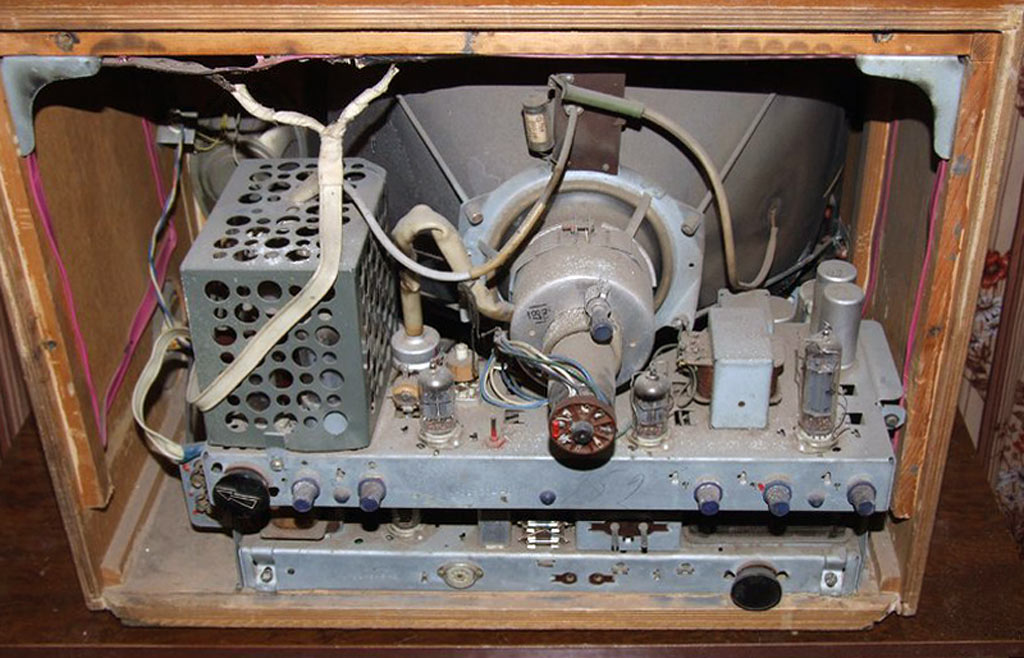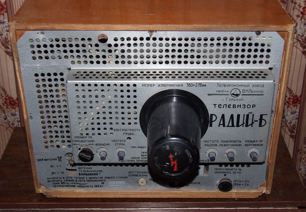 Телевизионный приёмник ч/б изображения *Радий-Б* с 1964 года выпускал Горьковский телевизионный завод имени Ленина. Телевизор **Радий-Б** является модернизированным вариантом предыдущей модели **Радий-А**. В аппарате изменена схема и конструкция шасси. По оформлению он резко отличается от предшественника. Уменьшились размеры футляра до 565х430х360 мм благодаря применению выпуклой алюминиевой задней стенки с отверстиями для вентиляции. Пятиклавишный переключатель режима работы тембр-регистра и для выключения ТВ расположен на левой стороне передней панели а на правой стороне под кинескопом, помещены ручки для настройки блока УКВ-ЧМ и регулятора громкости. Шкала настройки на УКВ-ЧМ радиостанции находится в центре внизу, а регуляторы контрастности, яркости и чёткости в нижней части накладки, под которой расположены громкоговорители. Ручка переключателя каналов перенесена на правую сторону. В телевизоре применён блок ПТК-38, вместо ПТК-74, соответственно изменено крепление. В связи с применением УКВ блока ИП-2 вместо УКВ-И переработана конструкция верньера. С целью уменьшения высоты ТВ, верхнее шасси приближено к нижнему, а для улучшения теплового режима оно сдвинуто назад. В результате верхнее шасси можно выдвинуть или откинуть вверх или вниз не вынимая ТВ из футляра. Это облегчает смену ламп и деталей верхнего шасси. Вырез дна футляра аппарата закрываемый картонным щитком увеличен, что значительно упростило доступ к деталям нижнего шасси. Таким образом осмотр и ремонт ТВ можно производить не разбирая его. Монтаж тоже переработан. Он сделан более надежным и доступным для осмотра и ремонта. Предохранители можно менять не вскрывая задней стенки, а только вынув колодку подключения сети смонтированную на отдельном щитке, который закрывает анодные предохранители когда колодка включена. Технические параметры телевизора аналогичны модели **Рубин-102Б**. Цена телевизора 386 рублей. В октябре 1966 года завод выпустил ещё одну модернизированную модель **Радий-И**, которая впрочем мало отличалась от предыдущей и которая скоро была заменена на новый унифицированный телевизор **Чайка**. Всего телевизоров марки **Радий** всех модификаций за годы выпуска было изготовлено 765.500 штук.