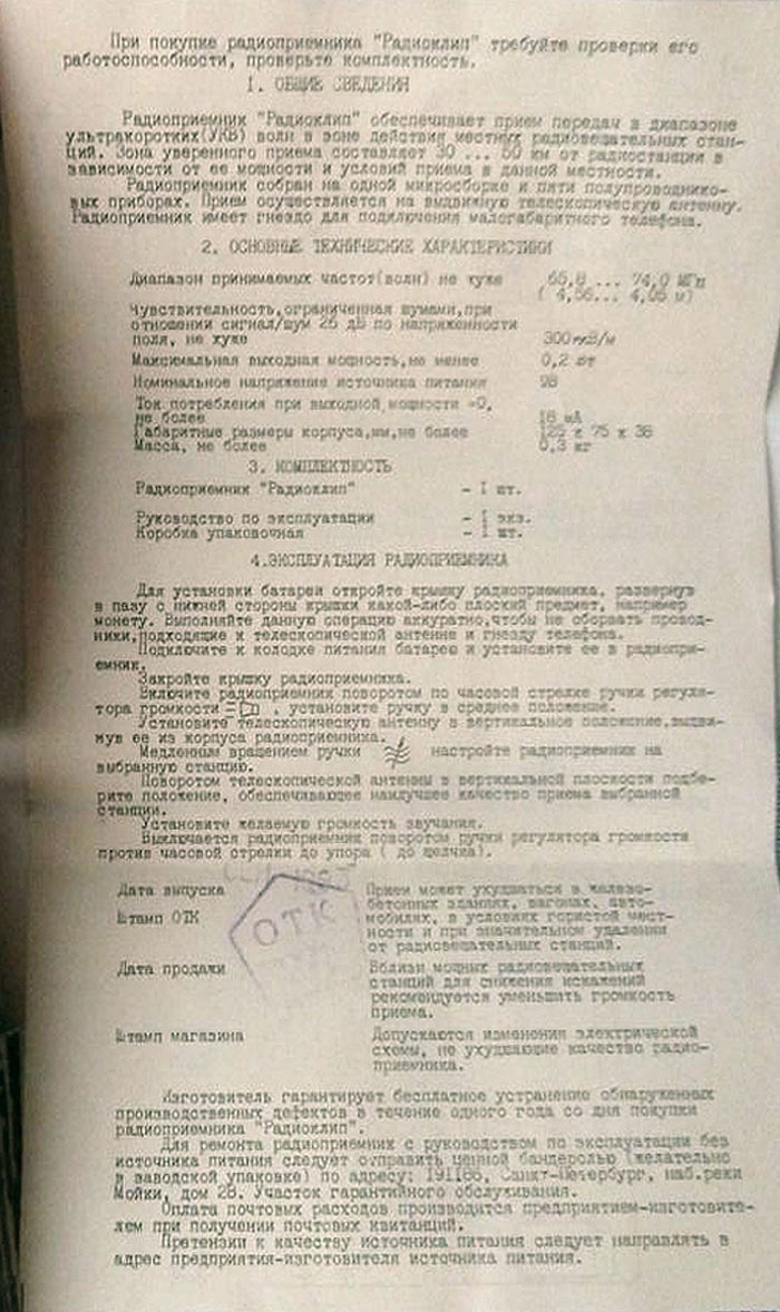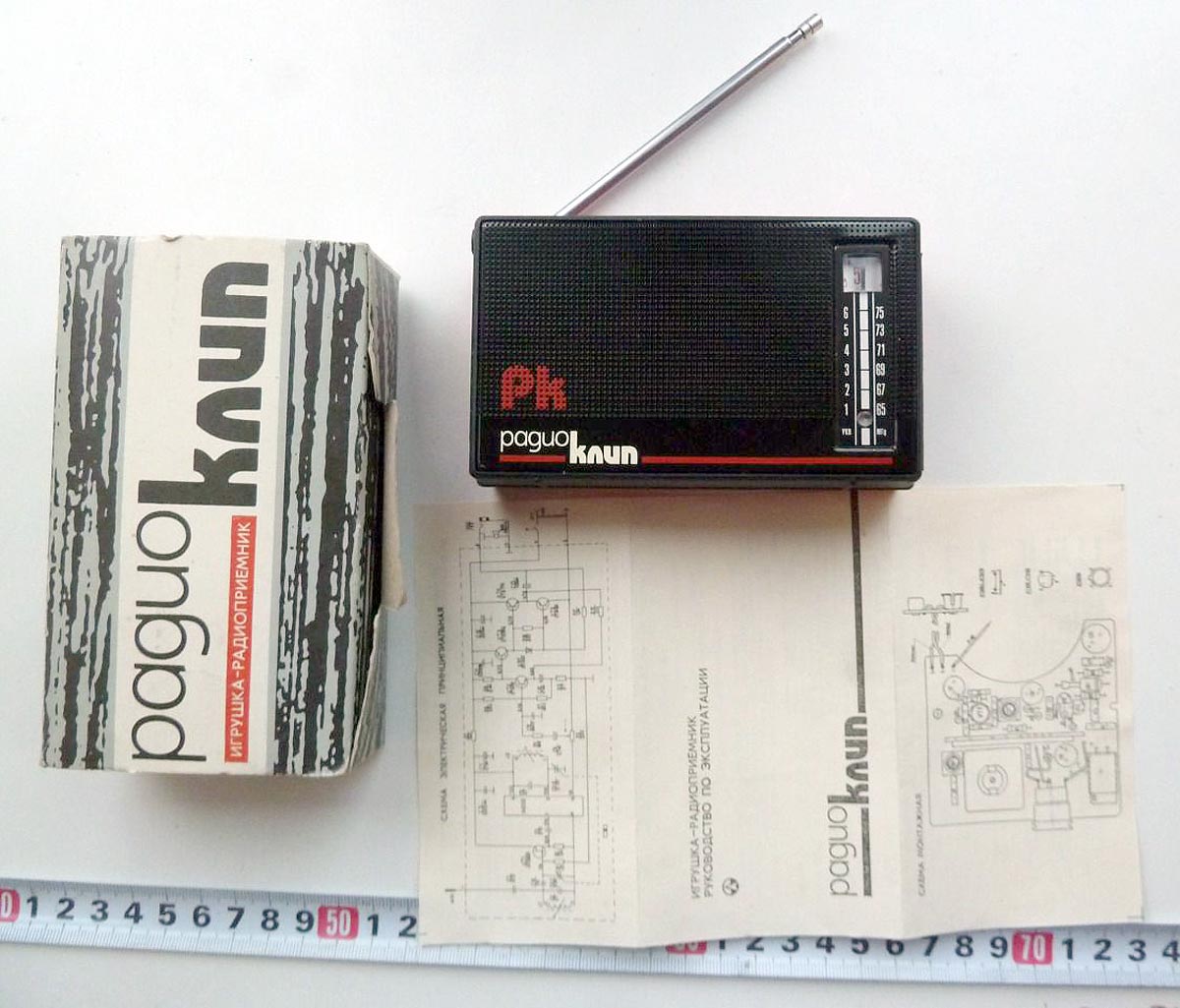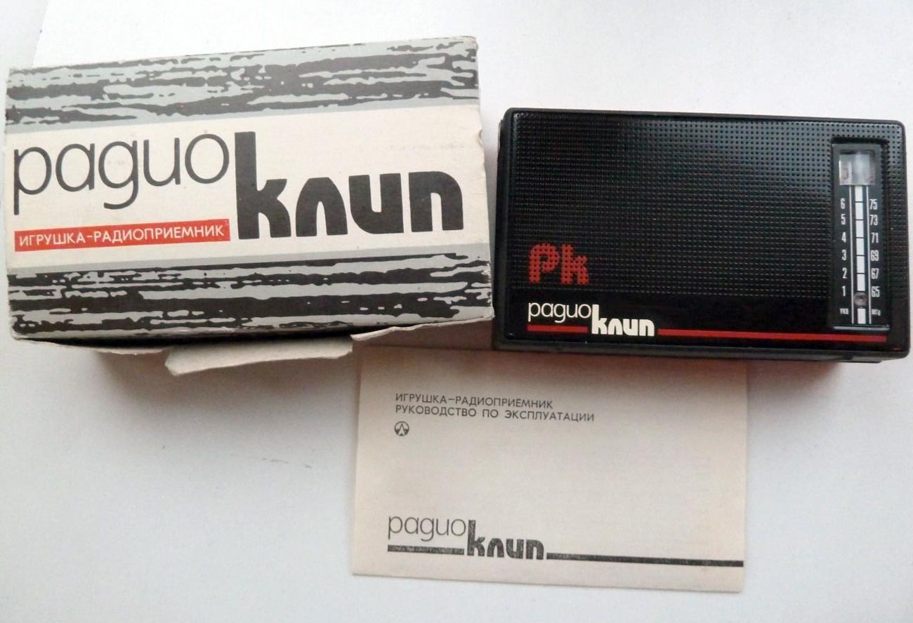 Радиоприёмник - игрушка *Радиоклип* с 1992 года выпускался Ленинградским приборостроительным заводом *Равенство*. Радиоприёмник работает в диапазоне УКВ-ЧМ в радиусе до 30...50 километров от радиовещательной станции. Чувствительность 300 мкВ. Максимальная выходная мощность 200 мВт. Напряжение питания 9 В. Габариты приёмника 125х75х38 мм. Масса 300 гр. Несколько более подробное описание радиоприёмника в его инструкции.