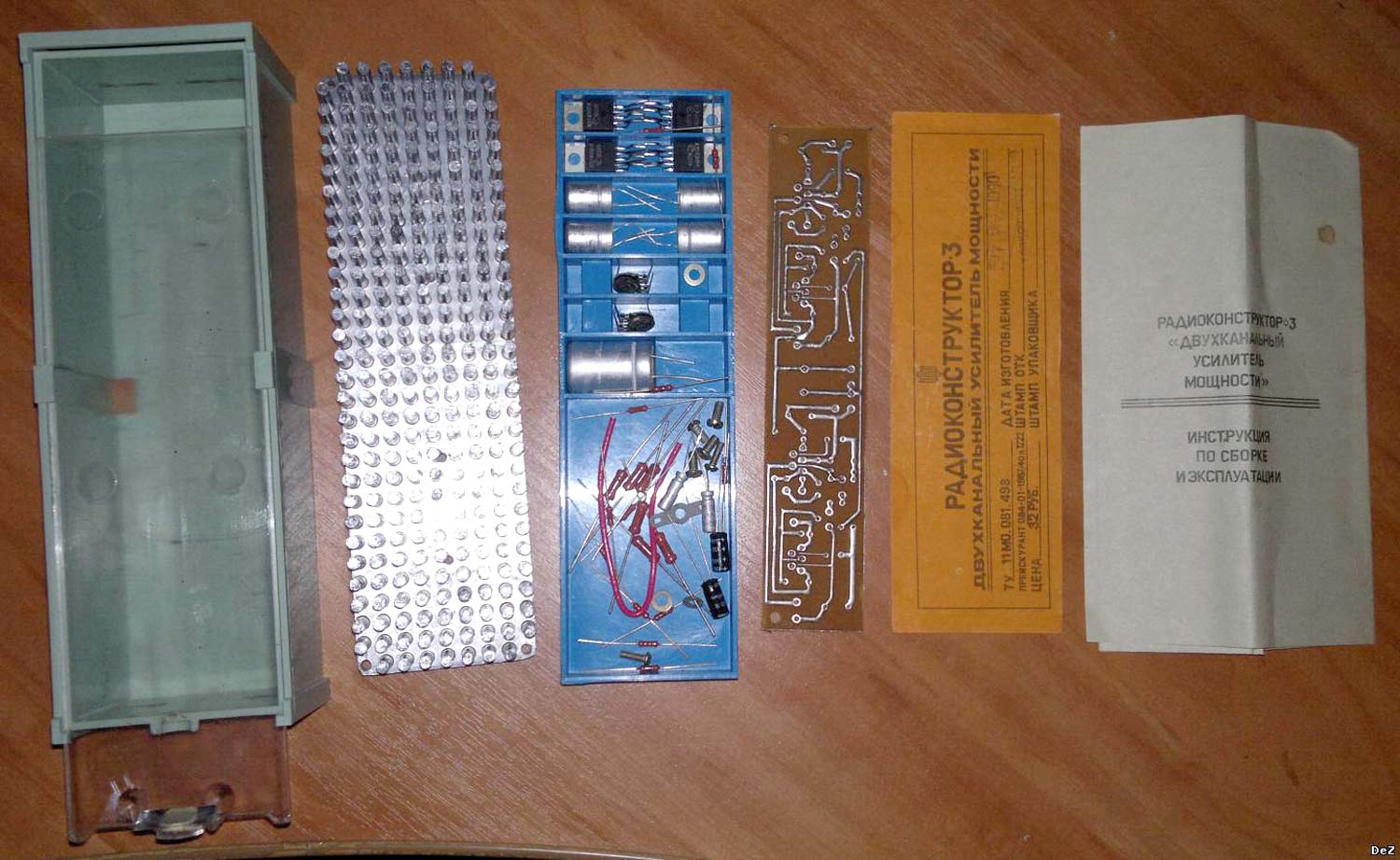 Радиоконструктор-3 (Двухканальный усилитель мощности) выпускался с 1989 года. РК предназначен для сборки двухканального усилителя мощности. Применение интегральных микросхем в усилителе мощности этой категории сложности дает возможность значительно сократить количество комплектующих изделий и габариты конструкции. Технические характеристики собраного усилителя: Диапазон воспроизводимых частот с завалом на краях 2 дБ - 20...20000 Гц. Номинальная выходная мощность при нагрузке 4 Ом и коэффициенте гармоник 1,5% - 2х10 Вт. Максимальная выходная мощность 2х16 Вт. Отношение сигнал/шум не хуже -66 дБ. Переходные затухания между каналами на частоте 1000 Гц -50 дБ. Номинальная чувствительность усилителя при входном сопротивлении 100 кОм около 100 мВ. Стоимость набора 32 рубля.