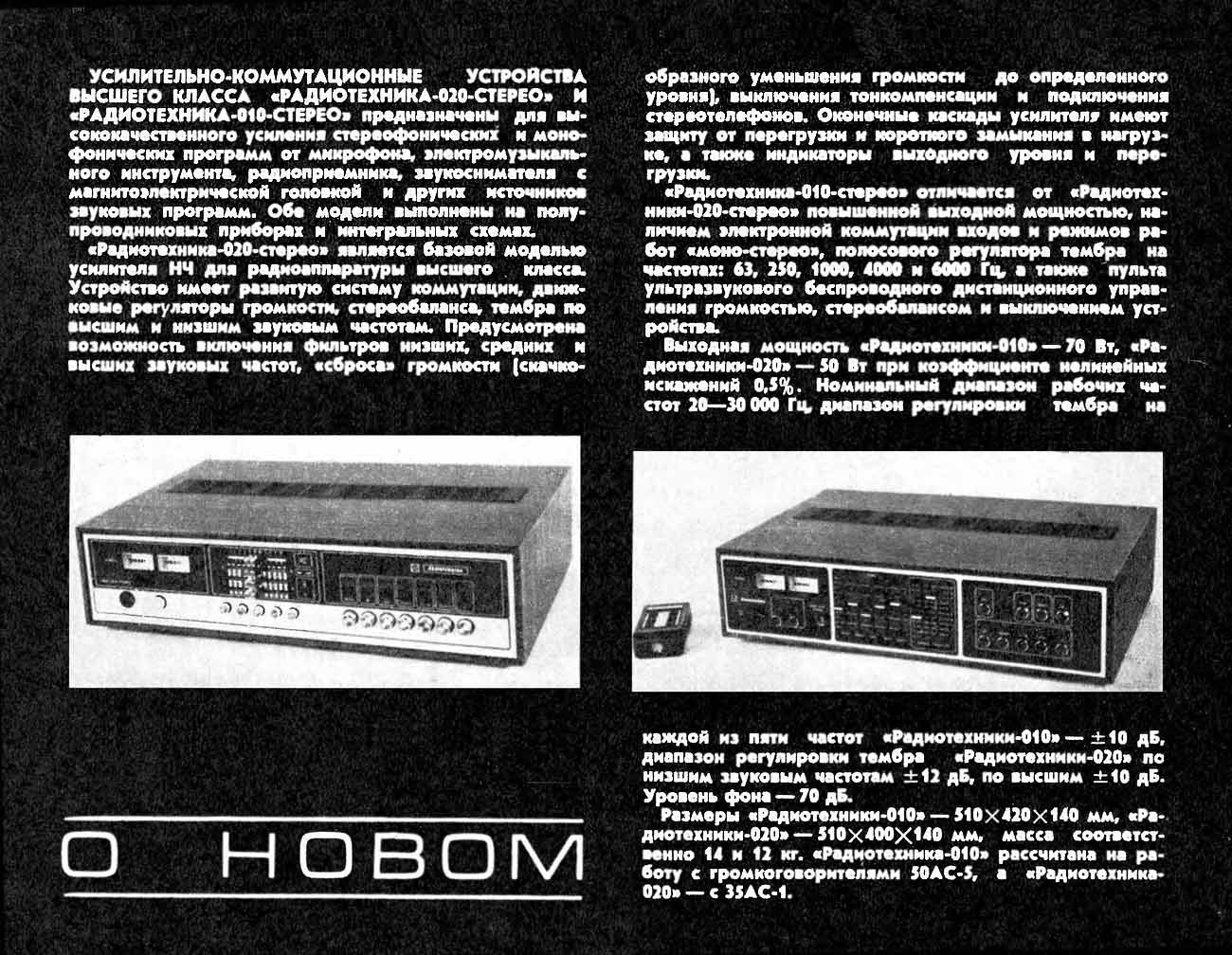 Усилительно-коммутационное устройство высшего класса *Радиотехника-010-стерео* разработано в 1975 году Рижским радиозаводом имени Попова. УКУ предназначено для высококачественного усиления моно и стереофонических программ от микрофона, ЭМИ, радиоприёмника, звукоснимателя с магнитоэлектрической головкой и других источников звуковых программ. УКУ выполнено на полупроводниковых приборах и интегральных схемах. УКУ *Радиотехника-010-стерео* имеет электронную коммутацию входов и режимов работ *моно-стерео*, полосового регулятора тембра на частотах: 63, 250, 1000, 4000 и 6000 Гц, контроля сквозного канала, беспроводного ПДУ громкостью, стереобалансом, включением и выключением устройства. УКУ *Радиотехника-010-стерео* рассчитано на работу с громкоговорителями *50АС-5* или другими сходными по параметрам. Номинальная выходная мощность 70 Вт. Диапазон рабочих частот 20...30000 Гц. Диапазон регулировки тембра на каждой из 5 частот - +/-10 дБ. Уровень фона -70 дБ. Габариты УКУ - 510 х 420 х140 мм. Масса не более - 14 кг. УКУ серийно не выпускалось.