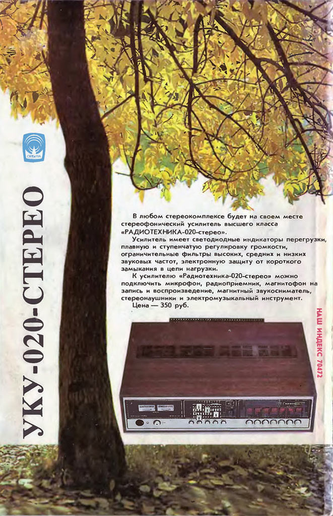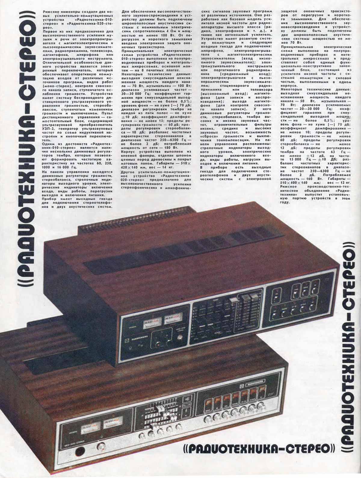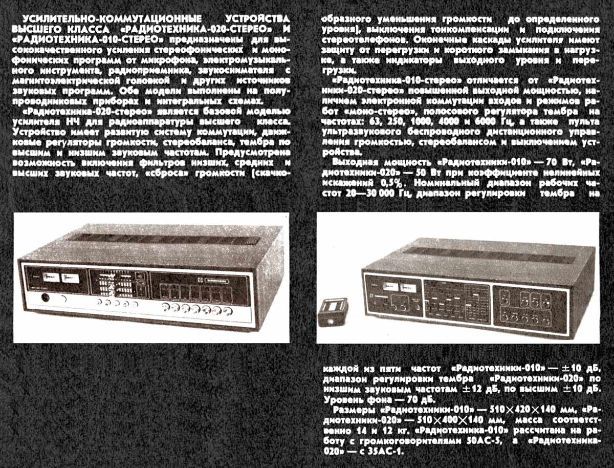 Усилительно-коммутационное устройство *Радиотехника-020-стерео* с 1977 года выпускал Рижский радиозавод им. Попова. Предназначено для высококачественного усиления звуковых программ. Есть гнёзда для микрофона, ЭПУ с магнитным звукоснимателем, ЭМИ, приёмника, ЭПУ с пьезокерамическим или магнитным звукоснимателем, телевизора, магнитофона. Гнёзда для АС, стереотелефонов, магнитофона для сквозного контроля. Номинальная выходная мощность - 2х50 Вт. Потребляемая мощность 160 Вт. Габариты УКУ - 480х410x140 мм. Вес 12 кг.