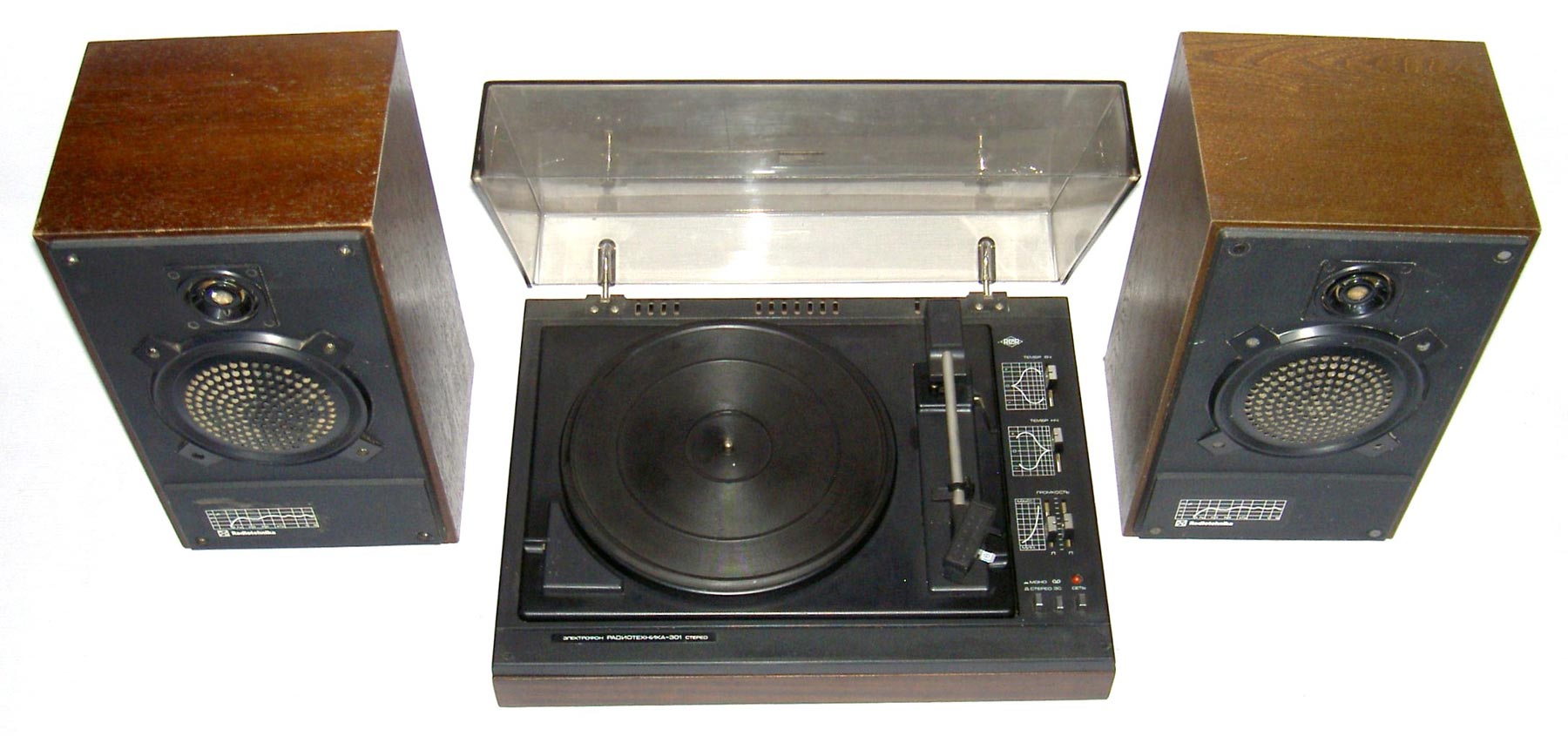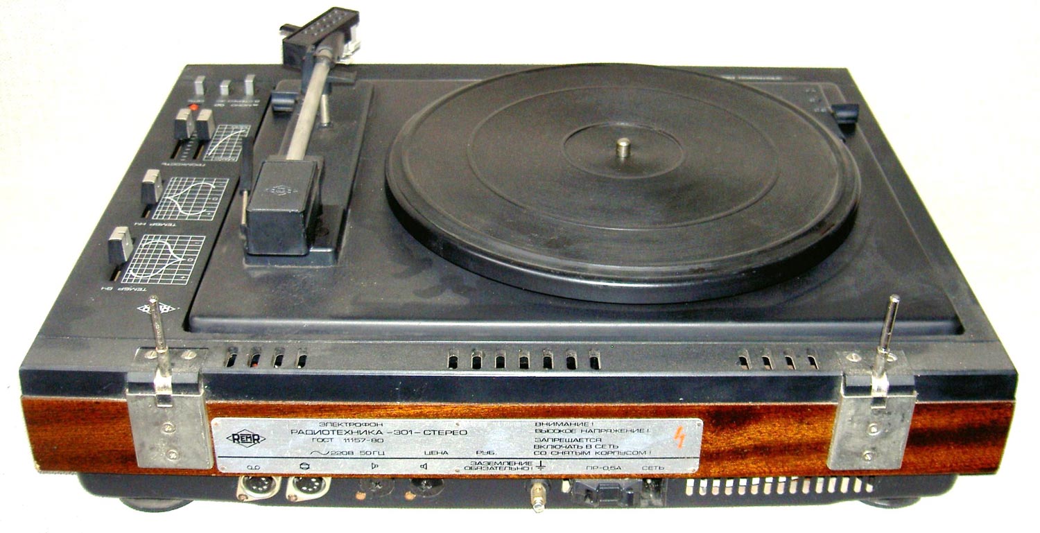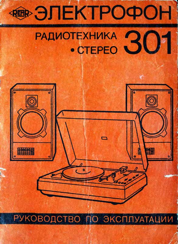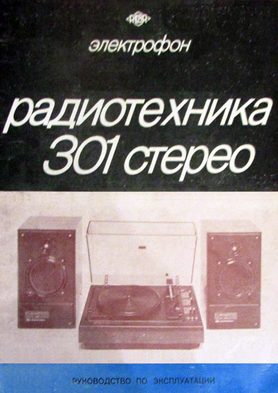 Электрофон *Радиотехника-301-стерео* с 1984 года выпускал Рижский ЭМЗ. ЭФ предназначен для воспроизведения стереофонических записей с грампластинок. В нём установлено III-ЭПУ-62СП. Имеются регуляторы тембра ВЧ, НЧ, громкости, баланса. Диапазон рабочих частот 80...12500 Гц. Номинальная выходная мощность 2х6 Вт. Потребляемая мощность 50 Вт. Габариты ЭФ 430х355х160 мм. Габариты АС 215х365х185 мм. Вес 21 и 8 кг. С 1986 года завод выпускал электрофон **Радиотехника-301М-стерео** по оформлению, конструкции и схеме, кроме нового двухскоростного 2-ЭПУ-65СМ и расширенных воспроизводимых частот до 63...14000 Гц, аналогичный описанному.