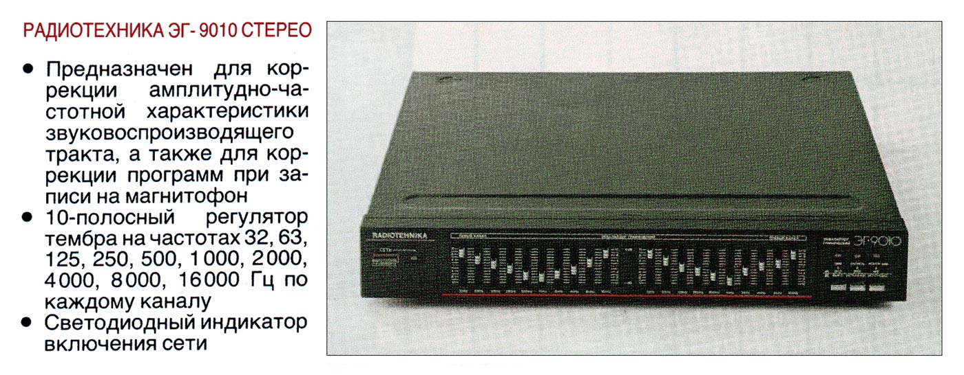 Эквалайзер *Радиотехника ЭГ-9010-стерео* подготовлен к выпуску с 1987 года Рижским ПО *Радиотехника*. Предназначен для коррекции амплитудно-частотной характеристики бытовой стереофонической радиоаппаратуры, а также для коррекции фонограмм при записи на магнитофон. Основные технические характеристики: Частоты регулировки (на каждый канал) - 32, 63, 125, 250, 500, 1000, 2000, 4000, 8000, 16000 Гц. Диапазон воспроизводимых частот - 20...20000 Гц. КНИ - 0,02%. Уровень фона - минус 95 дБ. Потребляемая мощность - 8 Вт. Габаритные размеры - 430 х 71 х 352 мм. Масса - 6 кг. Эквалайзер мог комплектовать музыкальные стерео-комплексы *Радиотехника*, составленные из блочной продукции ПО *Радиотехника*.