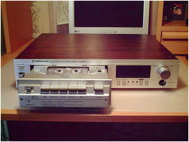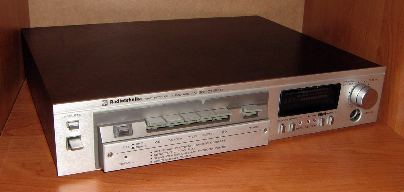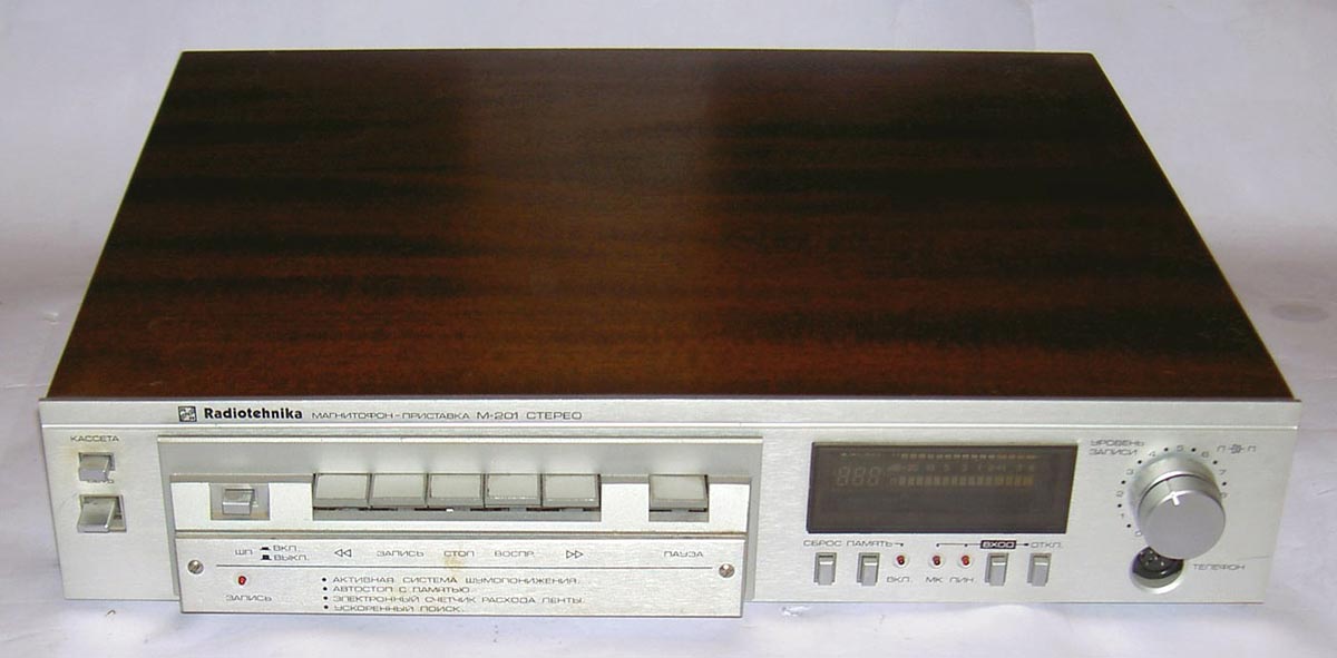 Магнитофон-приставку *Радиотехника М-201С* с начала 1983 года выпускало Рижское ПО *Радиотехника*. МП предназначен для работы в составе радиокомплекса **Радиотехника-101-стерео**, но может использоваться и отдельно. Магнитофон рассчитан на запись фонограмм на ленты А4205-3Б или А4212-3Б в кассетах МК-60 или МК-90, с микрофона, электрофона, телевизора, радиоприёмника, тюнера, проигрывателя, другого магнитофона и с радиолинии как непосредственно и через УКУ. Воспроизведение осуществляется на внешний УЗЧ и стереофонические телефоны. Магнитофон имеет переключатели входов и типа ленты, люминесцентный индикатор уровня сигнала при записи или воспроизведении, счётчик расхода ленты, поиск фонограмм по счетчику и нулевому сбросу. Краткие технические характеристики: Отклонение скорости от номинальной 1,5%. Коэффициент детонации ±0,15%. Диапазон частот звука на ленте: Сг - 40...14000 Гц, ленты Fe 40...12500 Гц Уровень помех и шумов при включенной СШП -60 дБ. Относительный уровень стирания -65 дБ. Напряжение на ЛВ 400...600 мВ. Потребляемая мощность 15 Вт. Габариты МП 430х92х360. Его масса 8 кг.
