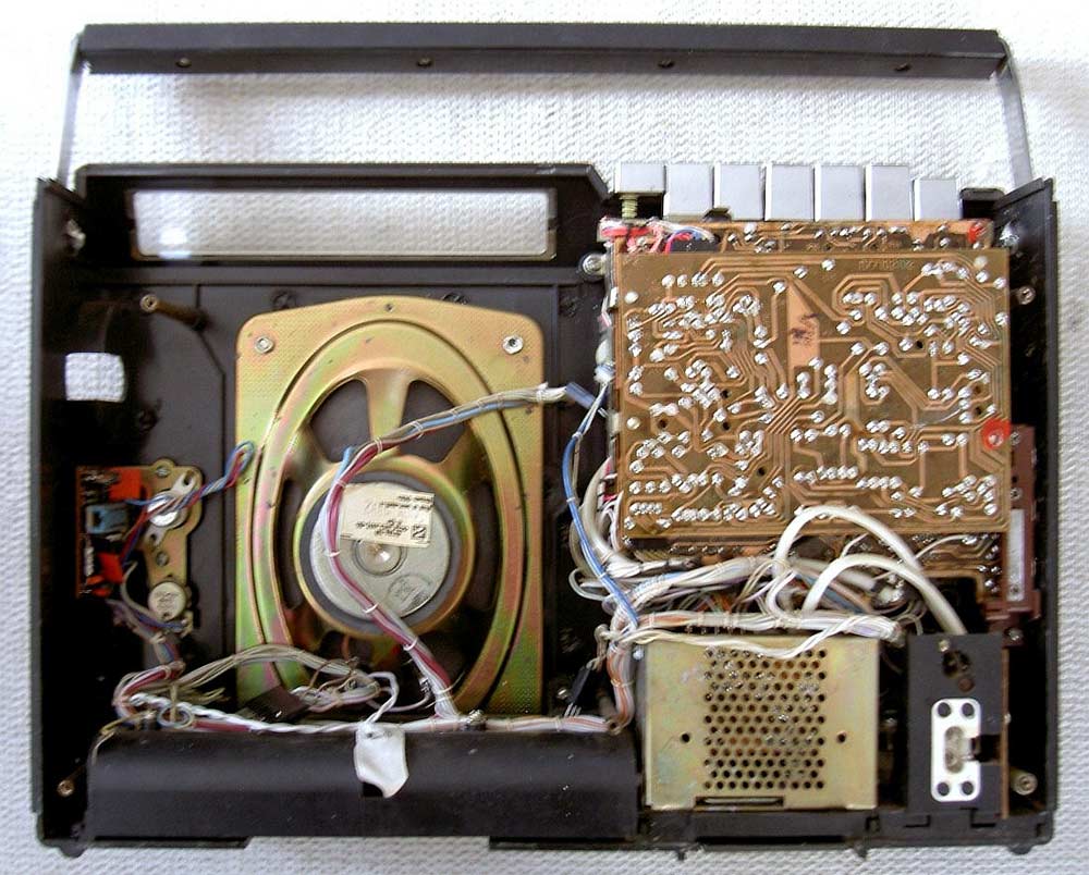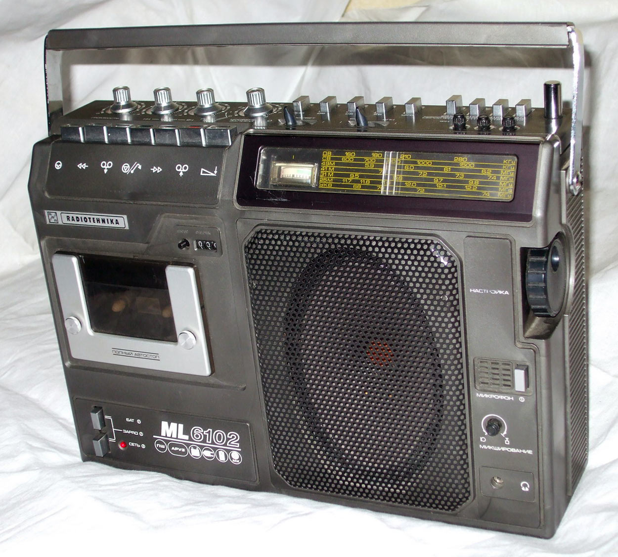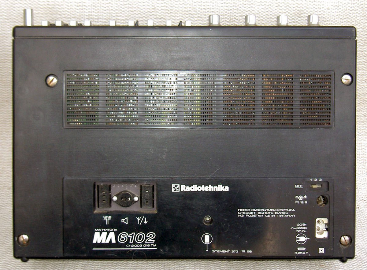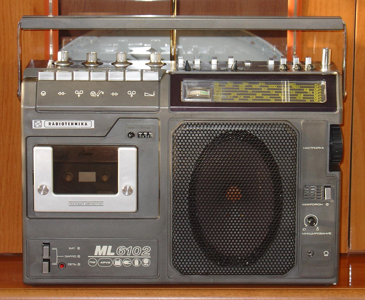 Портативная кассетная магнитола *Радиотехника МЛ-6102* выпускалась с 1988 года Рижским радиозаводом имени А.С.Попова. Магнитола состоит из приёмника первой группы сложности работающего в диапазонах ДВ, СВ, КВ, УКВ и кассетной магнитофонной панели третьей группы сложности. Предназначена для приёма радиостанций и для записи фонограмм с приёмника, микрофона и внешних источников, с последующим воспроизведением. Есть возможность включения одной из трёх фиксированных станций в диапазонах УКВ, СВ, ДВ. В модели имеются: автоматическая подстройка частоты и система бесшумной настройки в диапазоне УКВ, подсветка шкалы, автоматическое выключение магнитофона по окончании ленты, счётчик расхода ленты, ограничитель шума, система наложения записи, АРУЗ, возможность отстройки от помех ГС, подзаряд батарей, регулировки тембра ВЧ и НЧ, электретный микрофон. Чувствительность приёмника в диапазонах: ДВ 2,0 мВ/м, СВ 1,5 мВ/м, KB 0,35 мВ/м, УКВ 10 мкВ. Селективность в диапазонах ДВ, СВ - 30 дБ. Диапазон воспроизводимых частот по звуковому давлению в АМ тракте 125...3350 Гц, ЧМ и магнитной записи 125...12500 Гц. Питание: сеть или от батареи из 6 элементов 373. Габариты модели 386х280x120 мм, вес 5,5 кг.