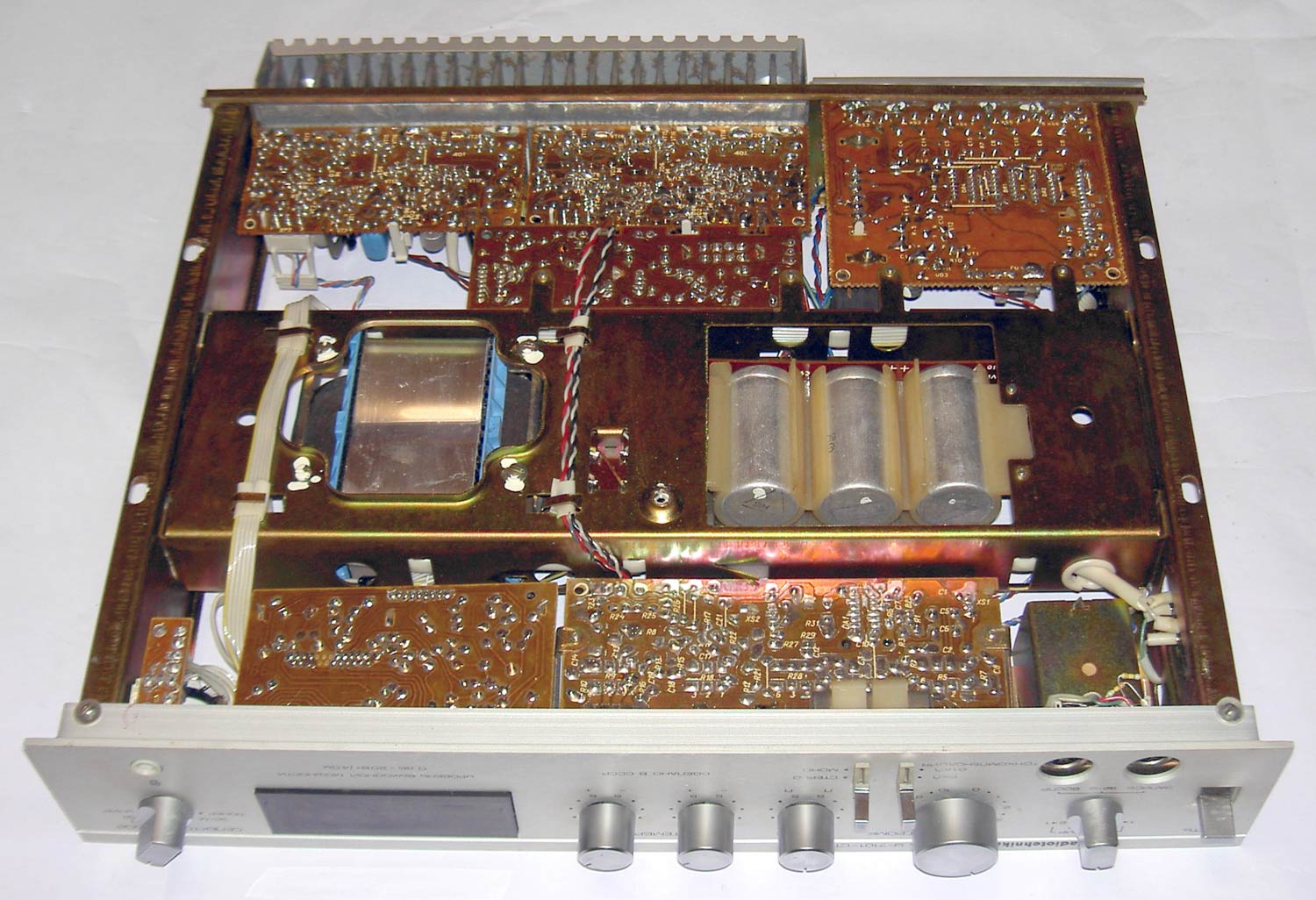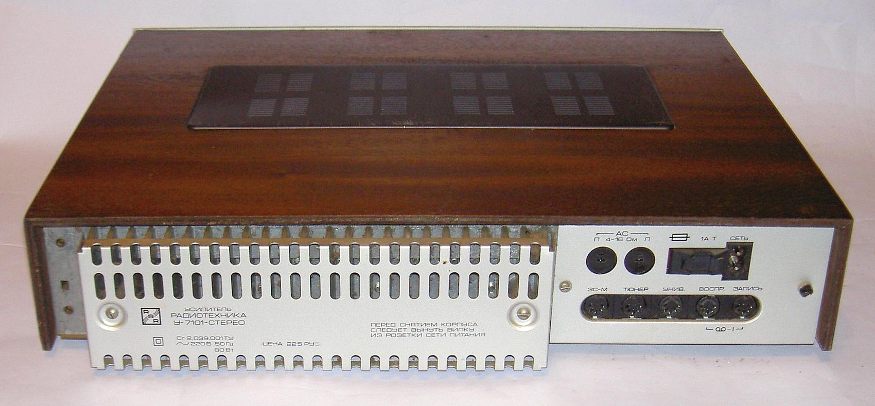 Полный усилитель звуковой частоты *Радиотехника У-7101С* с 1988 года выпускало Рижское ПО *Радиотехника*. Усилитель практически не отличается от предыдущего серийного усилителя ЗЧ **Радиотехника У-101С**. Он предназначен для высококачественного усиления моно и стереофонических сигналов от различных источников. Номинальная выходная мощность - 2х20 Вт. Коэффициент гармоник 0,3%. Диапазон воспроизводимых частот - 20...20000 Гц. Потребляемая мощность - 80 Вт. Габаритные размеры усилителя - 430х375x90 мм. Его масса 9 кг.