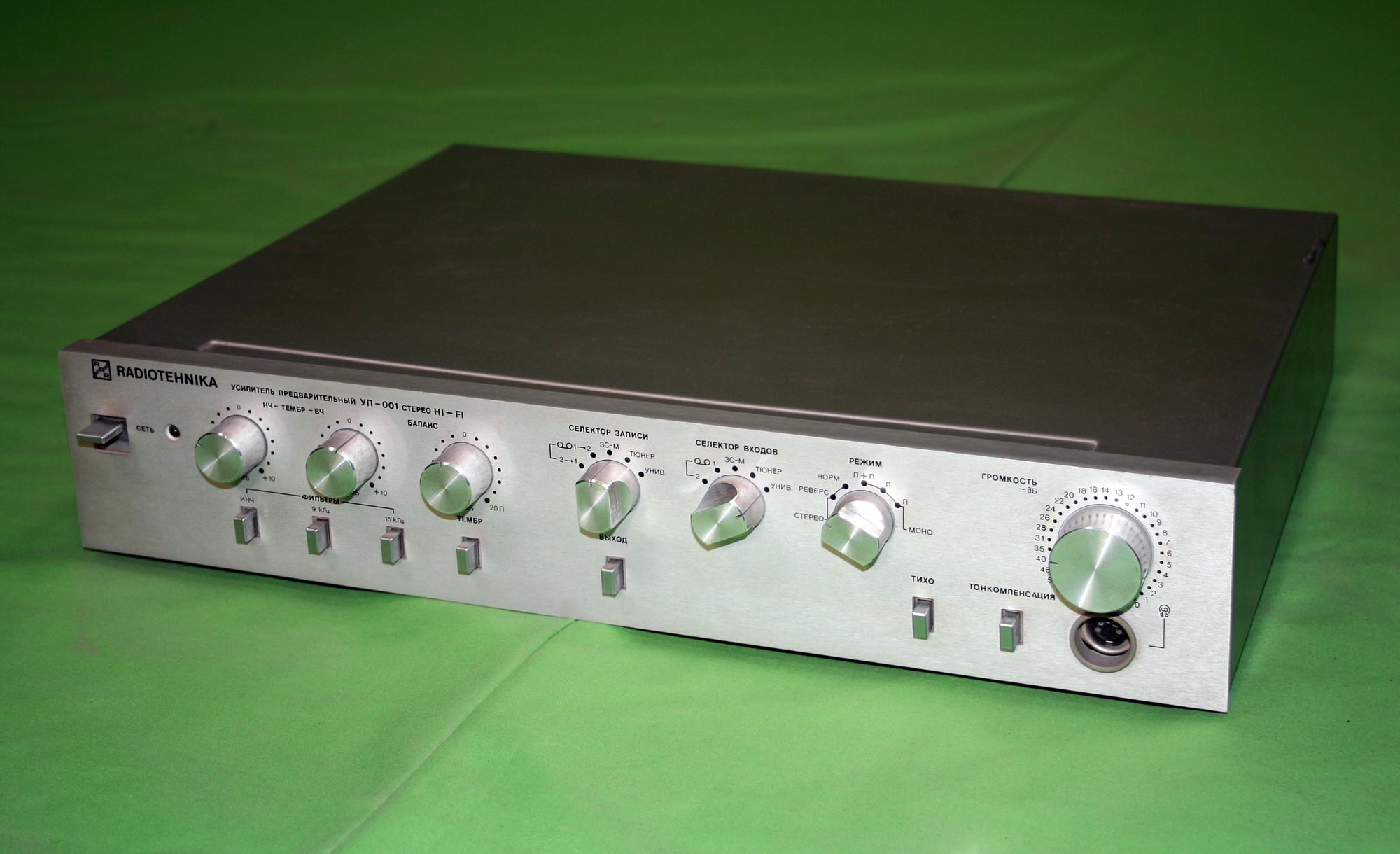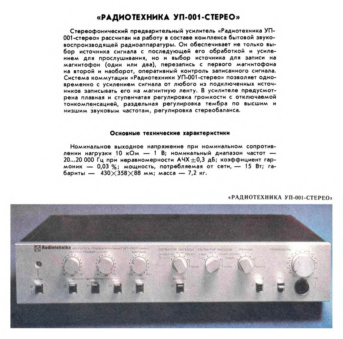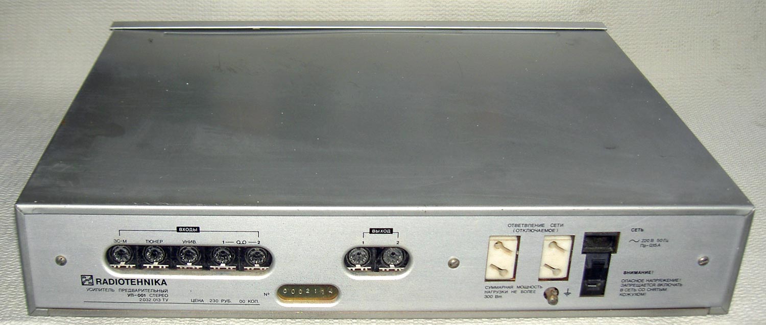 Стереофонический предварительный усилитель *Радиотехника УП-001-стерео* с 1985 года выпускал Рижский радиозавод имени А.С. Попова. ПУ рассчитан на работу в составе комплекса. Он обеспечивает выбор источника сигнала, с обработкой и усилением для прослушивания и источника для записи на два магнитофона, перезапись с первого магнитофона на второй и наоборот, контроль записываемого сигнала. В усилителе имеется плавная и ступенчатая регулировка громкости с отключаемой тонкомпенсацией, раздельная регулировка тембра и стереобаланса. Номинальное выходное напряжение, при номинальном сопротивлении нагрузки 10 кОм - 1 В. Номинальный диапазон частот - 20...20000 Гц при неравномерности АЧХ ±0,3 дБ. Коэффициент гармоник - 0,03%. Потребляемая усилителем мощность 15 Вт. Габариты аппарата - 430 х 358 х 88 мм. Масса - 7,2 кг.