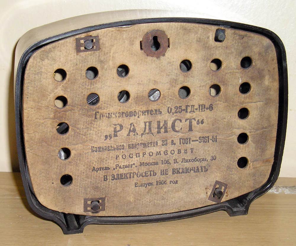 Абонентский громкоговоритель "Радист" с 1956 года выпускала Московская артель "Радист". "Радист" (по наименованию завода изготовителя) это стандартный абонентский громкоговоритель рассчитанный для работы в местной проводной 30-ти вольтовой радиотрансляционной сети.