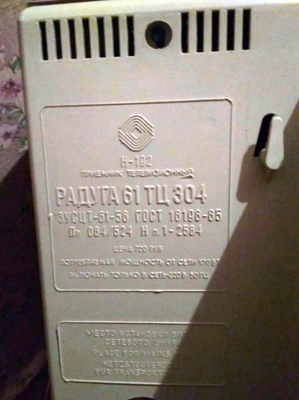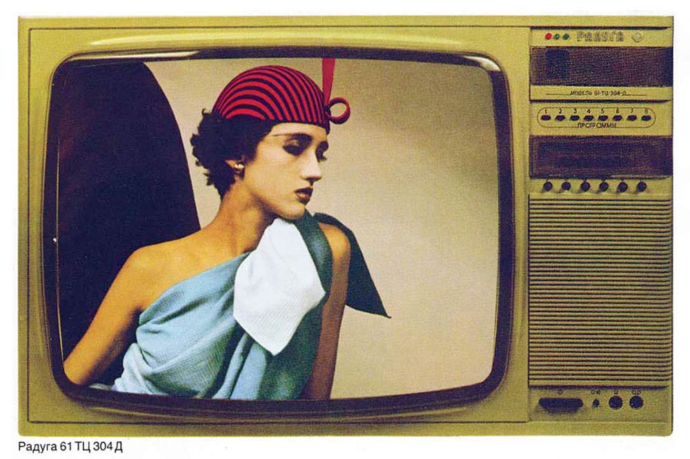 Телевизионный приёмник цветного телевидения *Радуга 61ТЦ-304Д* с 1988 года выпускало Ленинградское ПО им. Козицкого. Унифицированный интегрально полупроводниковый телевизор второго класса, третьего поколения **Радуга-61ТЦ-304Д** рассчитан на приём цветного и чёрно-белого изображения в диапазонах MB и ДМВ. В нём применён кинескоп типа 61ЛК4Ц без самосведения и углом отклонения лучей 90°, импульсный блок питания. Переключатель программ ТВ сенсорный с цифровой индикацией рабочего канала. К телевизору можно подключить головные телефоны, бытовой магнитофон или видеомагнитофон. Чувствительность в диапазоне MB - 55, ДМВ - 90 мкВ. Чёткость в центре экрана по горизонтали 450, по вертикали 500 линий. Максимальная яркость изображения 16 кд/м. Номинальная выходная мощность канала звука - 2,5 Вт. Диапазон рабочих частот звука 80...12500 Гц. Потребляемая от сети мощность 120 Вт. Габариты телевизора 495х750х550 мм. Масса 37 кг. Цена модели 755 рублей.