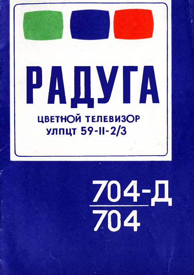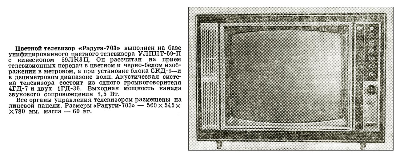 Телевизионный приёмник цветного изображения *Радуга-703/Д* с 1973 года выпускал Ленинградский завод им. Козицкого. Унифицированный телевизор цветного изображения **Радуга-703/Д** (тип УЛПЦИ-59-II-1) выпускался в настольном исполнении с различными вариантами отделки передней панели. Он обеспечивает приём цветных и чёрно-белых передач на любом из 12 каналов МВ диапазона а телевизор с индексом *Д* и на любом канале ДМВ диапазона. Телевизор выполнен на базе модели **Радуга-701** с кинескопом 59ЛКЗЦ. Акустическая система состоит из одного громкоговорителя 4ГД-7 и двух 1ГД-36. Номинальная выходная мощность 1,5 Вт. Органы управления размещены на лицевой панели. В модели имеются АРУ, АПЧГ, ФПЧ и Ф, автоподдержание размеров изображения при колебаниях напряжения и авто-размагничивание экрана и маски кинескопа при включении. Для повышения качества воспроизведения мелких деталей при приёме чёрно-белого изображения введено автоматическое устройство распознавания цвета. Имеется возможность подключения магнитофона для записи звука передач, прослушивания его на головных телефонах а также подключения внешнего видеосигнала от сервисных приборов и видеомагнитофона. Имеется возможность установки разъёмов для подключения ПДУ. Телевизор собран из функционально законченных блоков. Блоки могут выдвигаться и откидываться что позволяет проводить проверки при ремонте без их отключения. Габариты телевизора 560х545х780 мм, масса 60 кг. Телевизор **Радуга-704/Д** выпускаемый с начала 1976 года, аналогичен описанному выше, за исключением замены на панели угловых регуляторов на ползунковые.